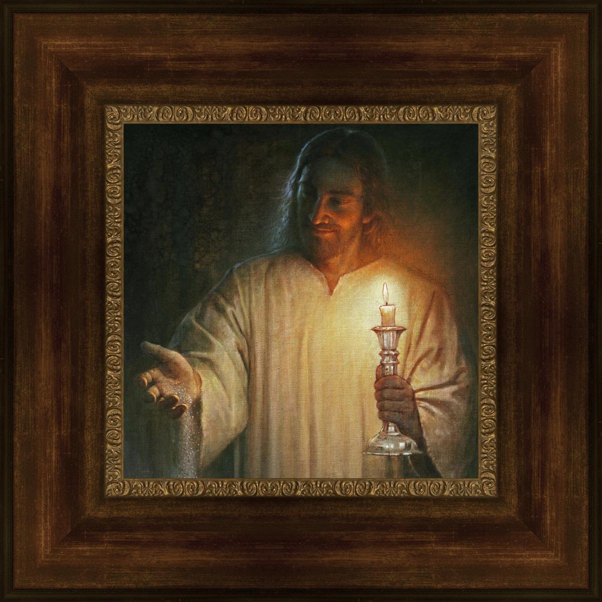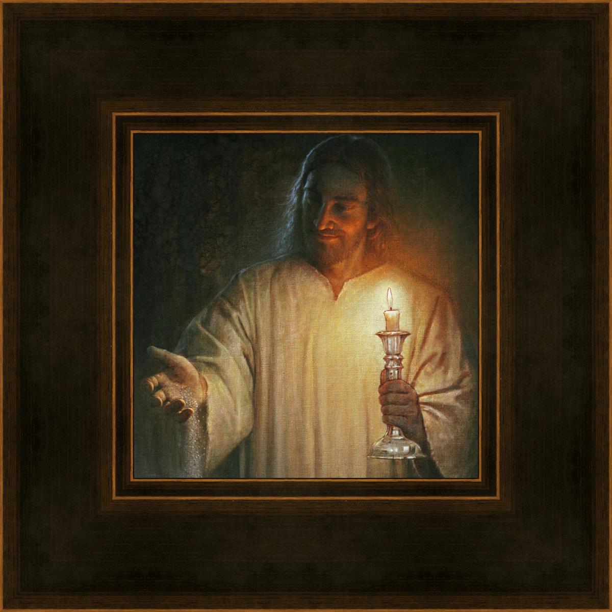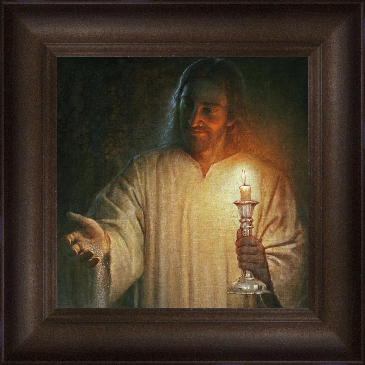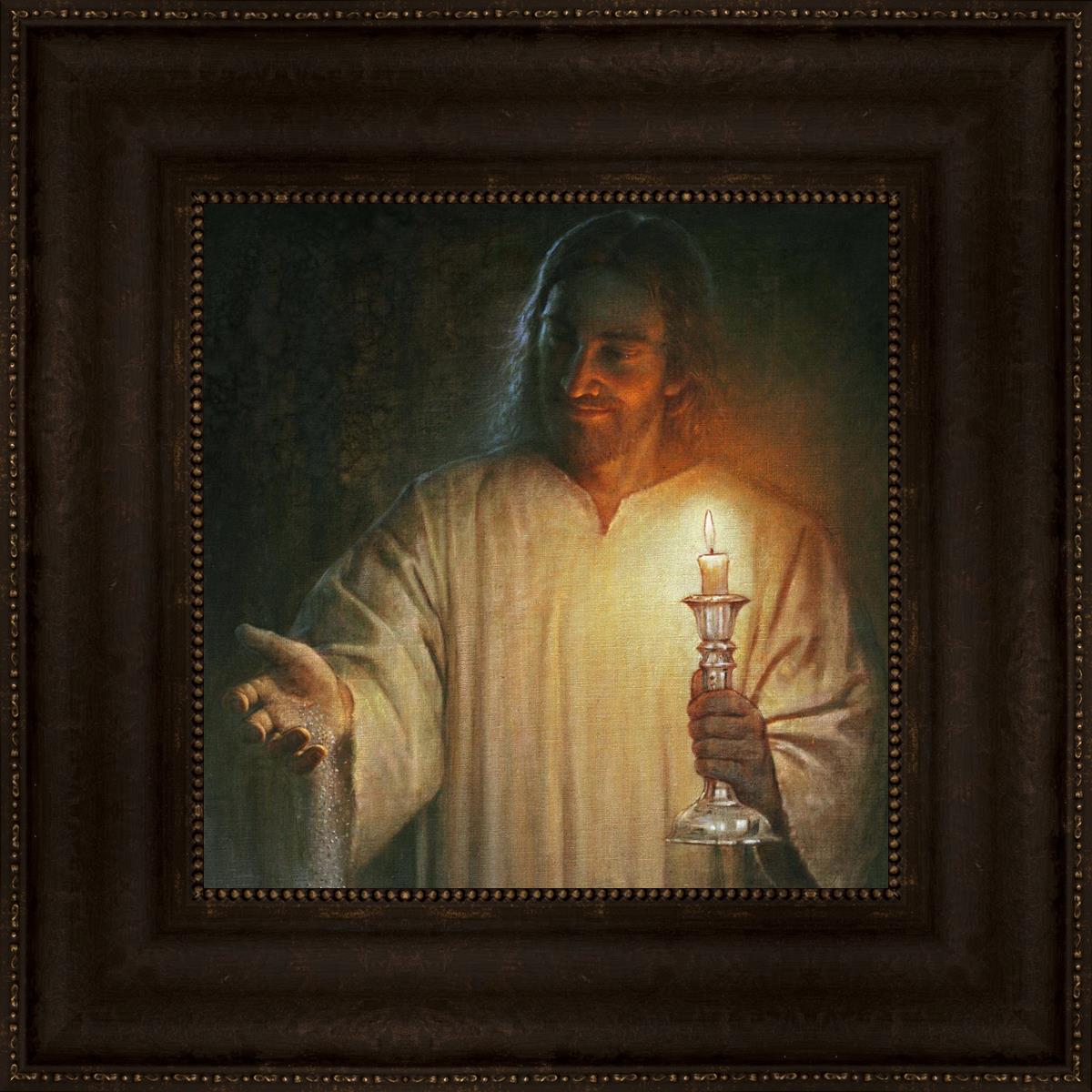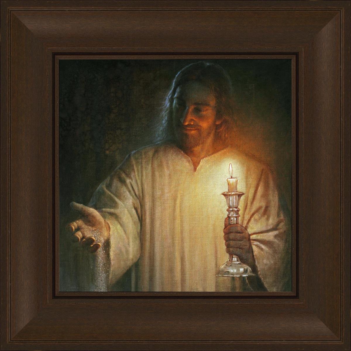 Salt and Light by Yongsung Kim depicts Jesus with a candle in one hand and salt pouring from the other. This painting is available in print and canvas.