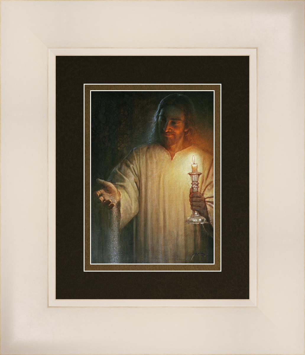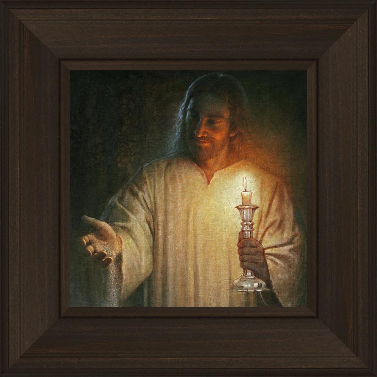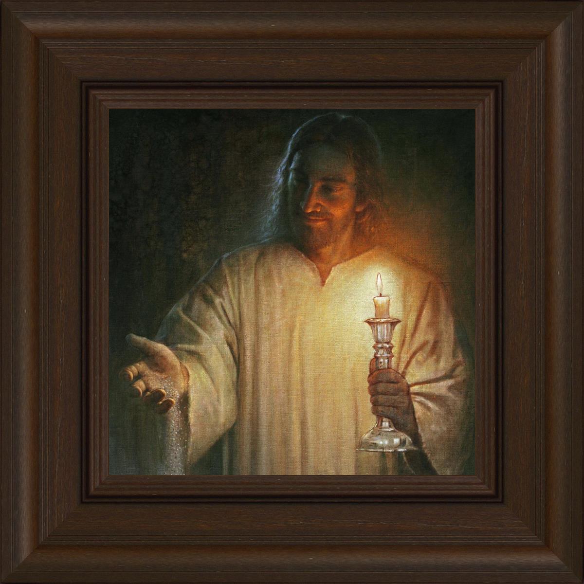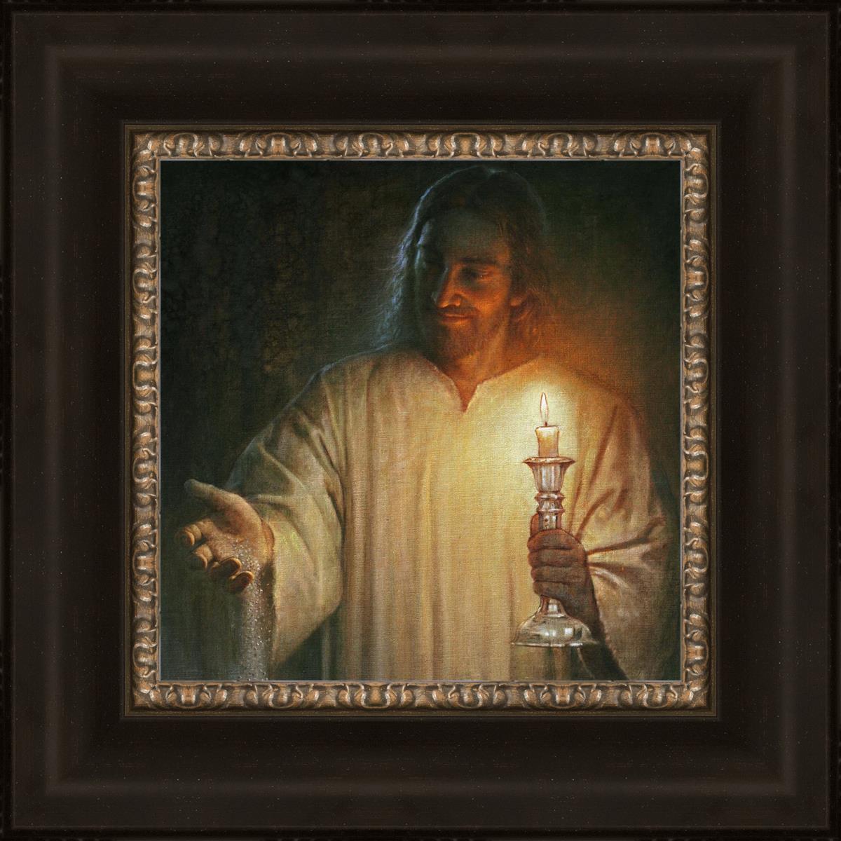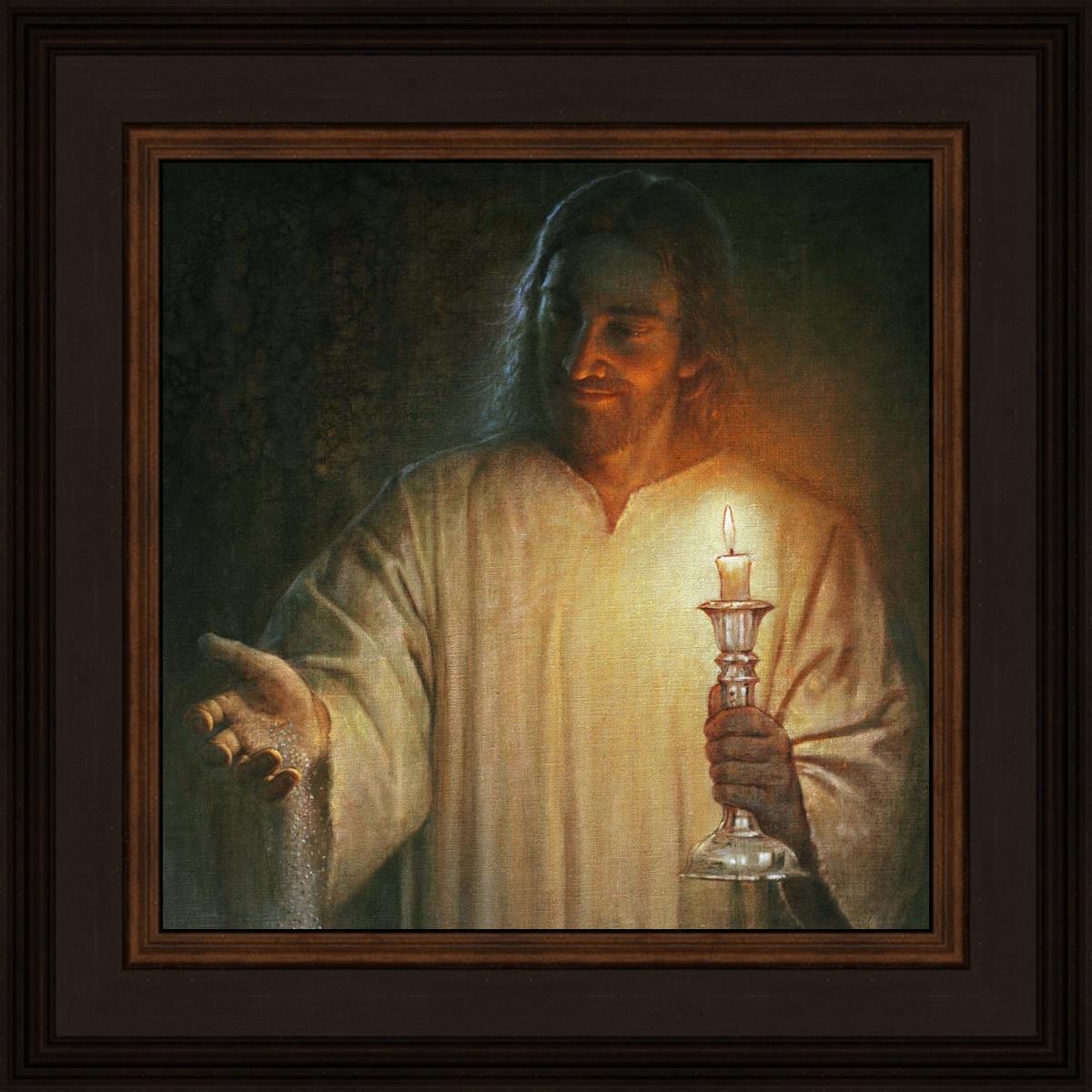 Salt and Light by Yongsung Kim depicts Jesus with a candle in one hand and salt pouring from the other. This painting is available in print and canvas.