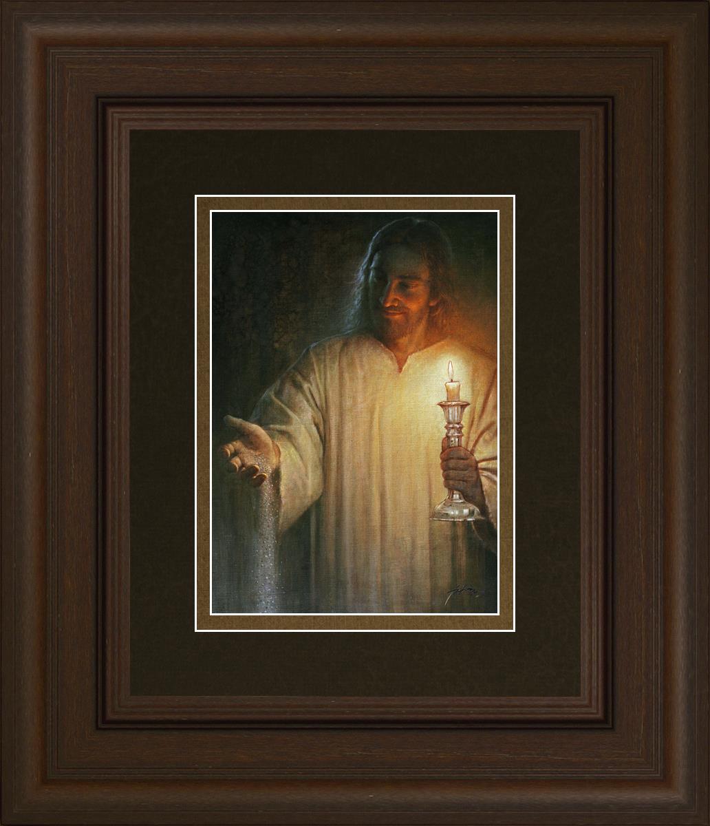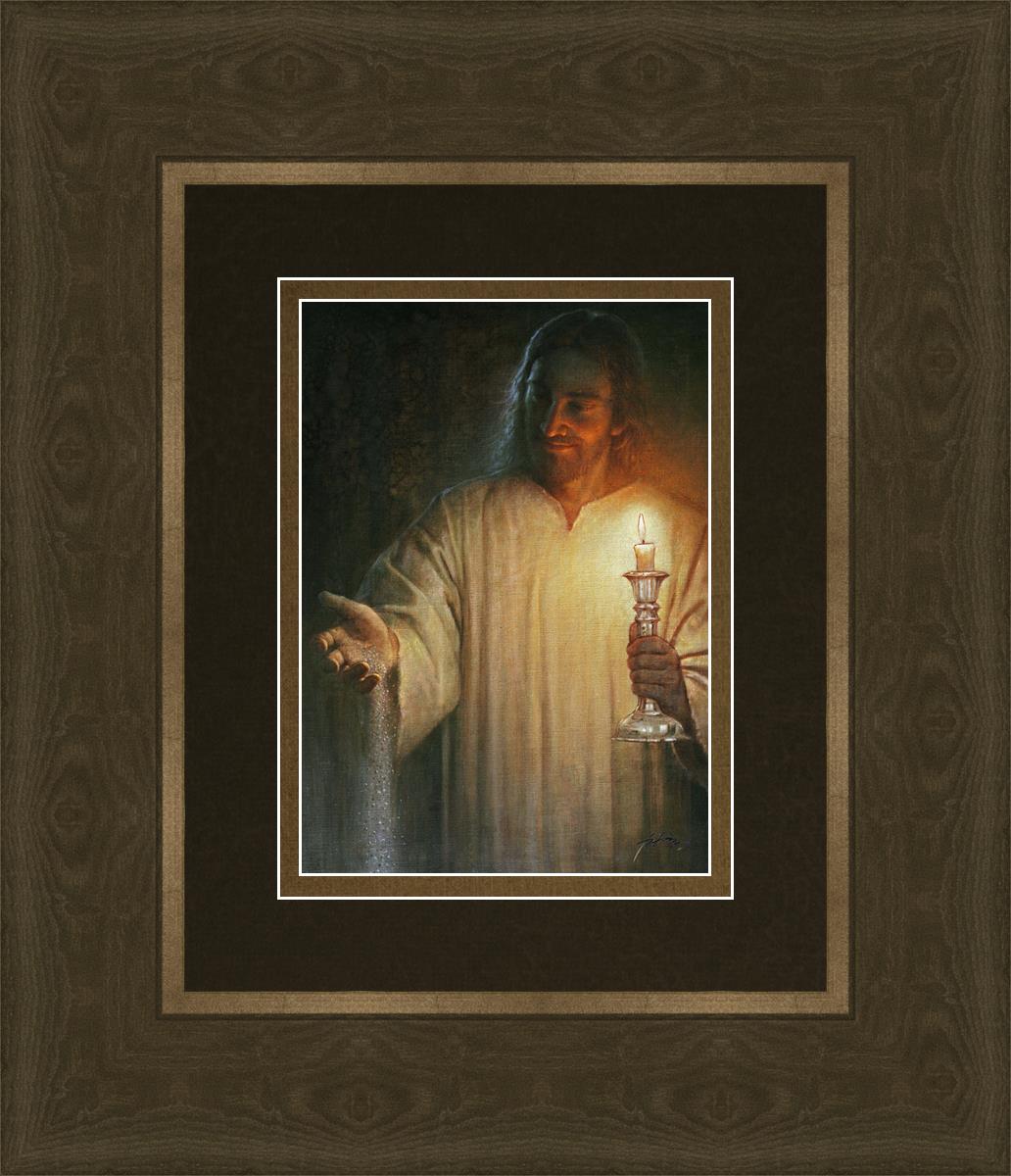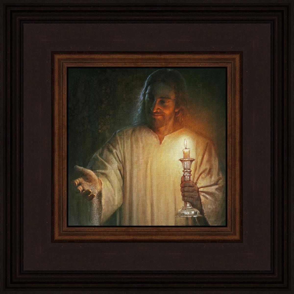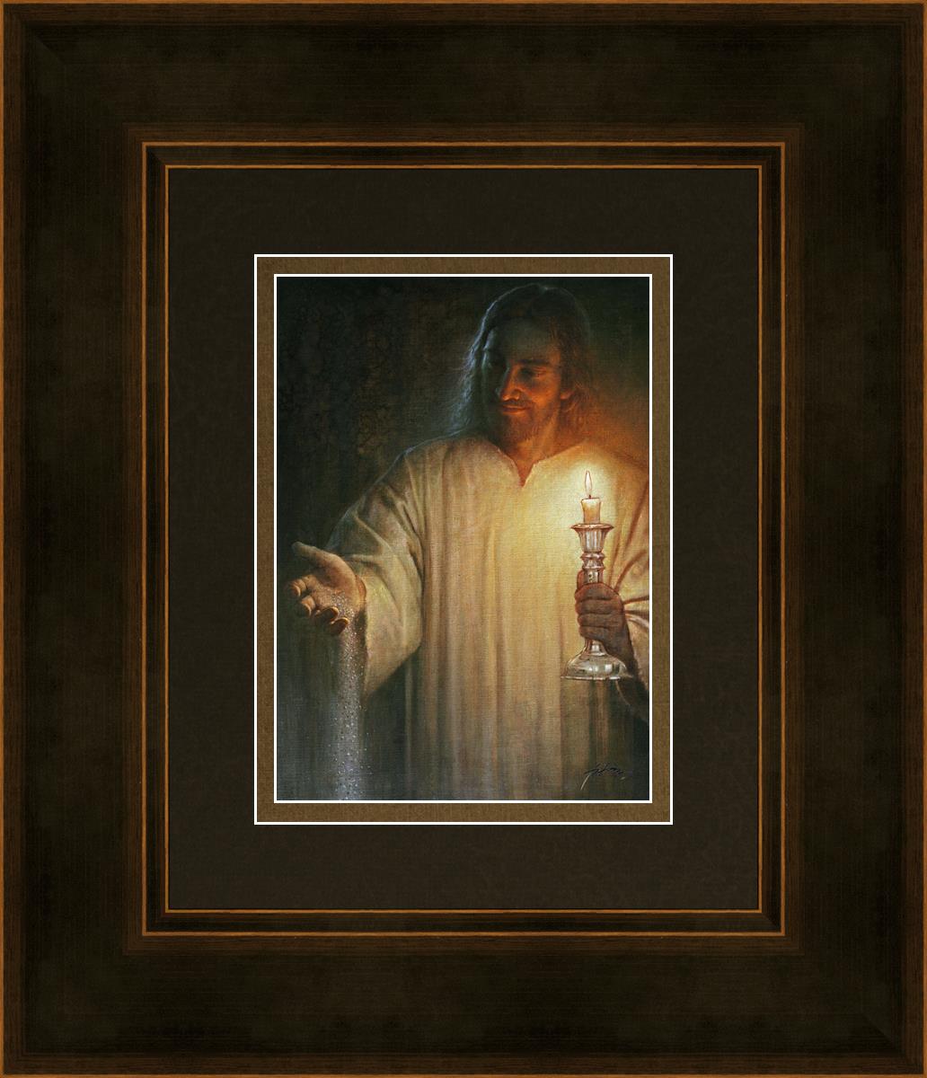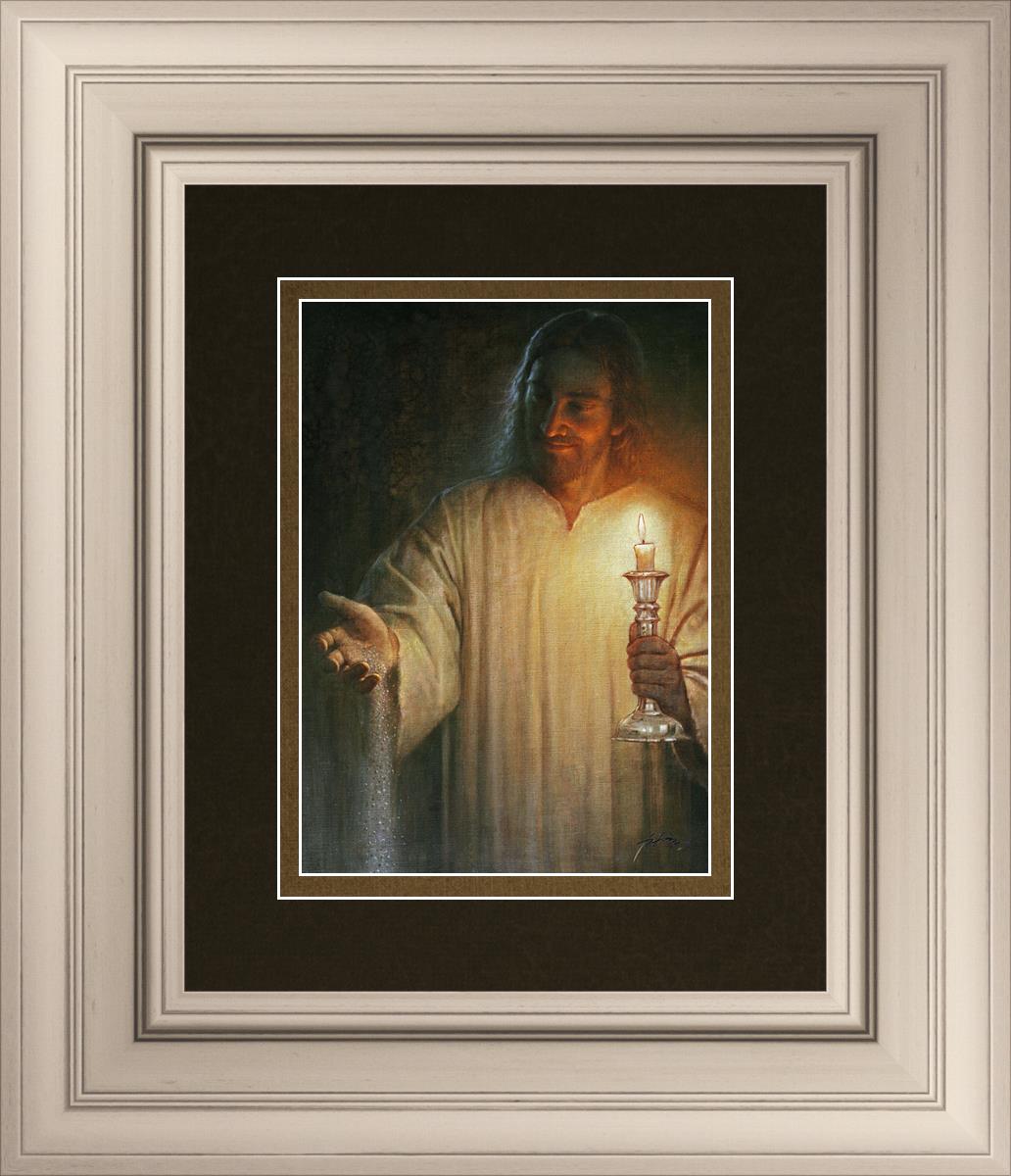 Salt and Light by Yongsung Kim depicts Jesus with a candle in one hand and salt pouring from the other. This painting is available in print and canvas.