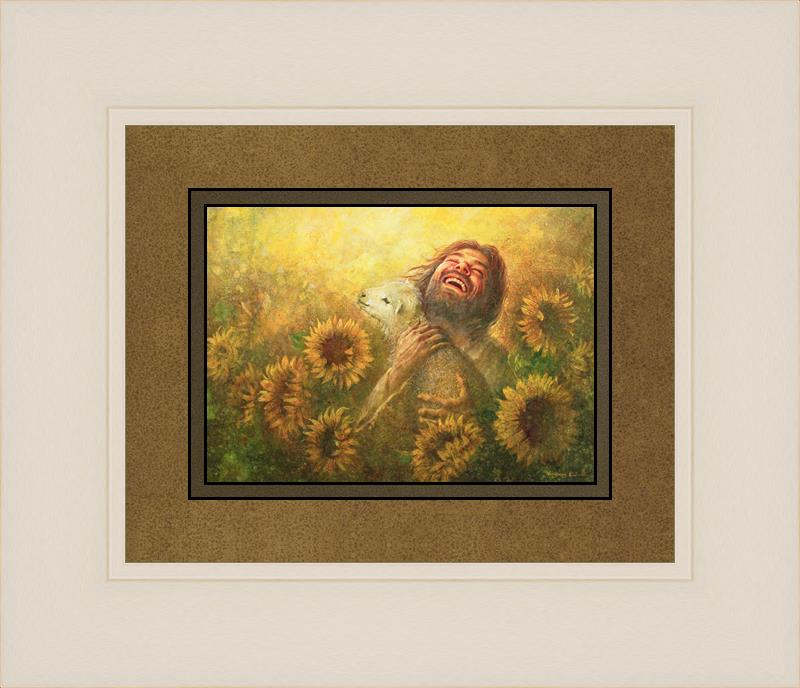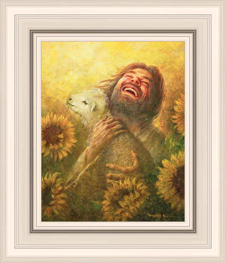 Seeds of Joy by Yongsung Kim depicts Jesus laughing while holding a lamb in His arms in a field of big beautiful sunflowers on a sunny day. This painting is available in print and canvas.