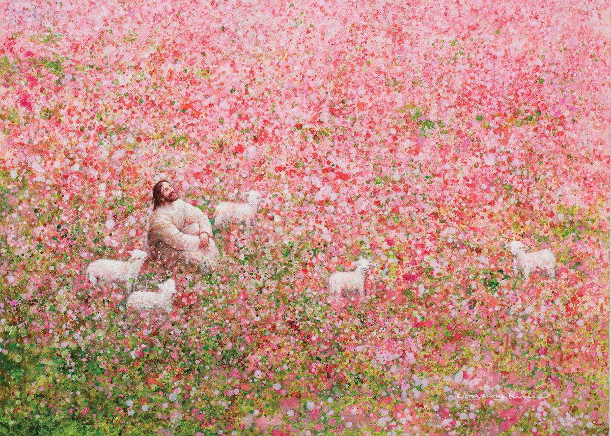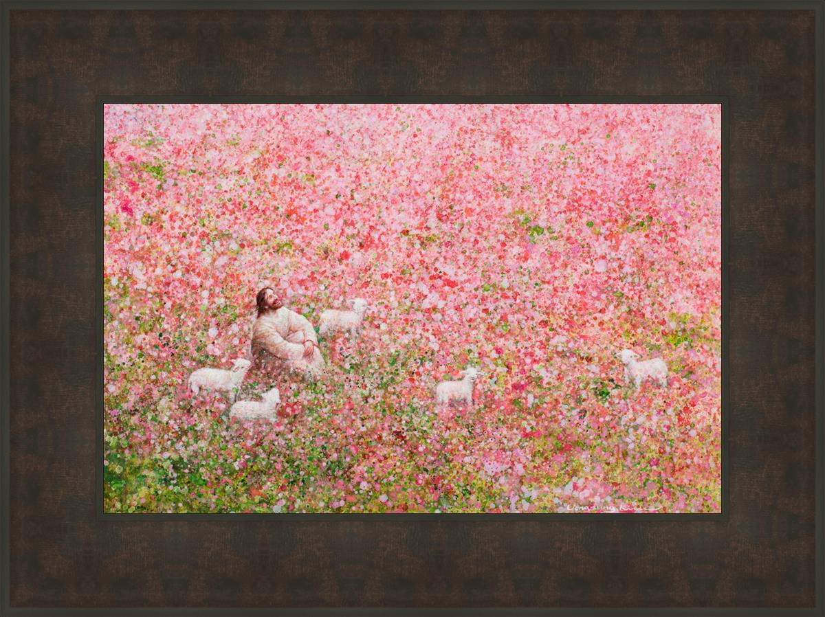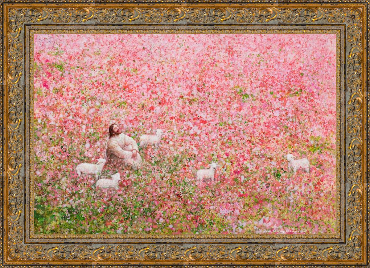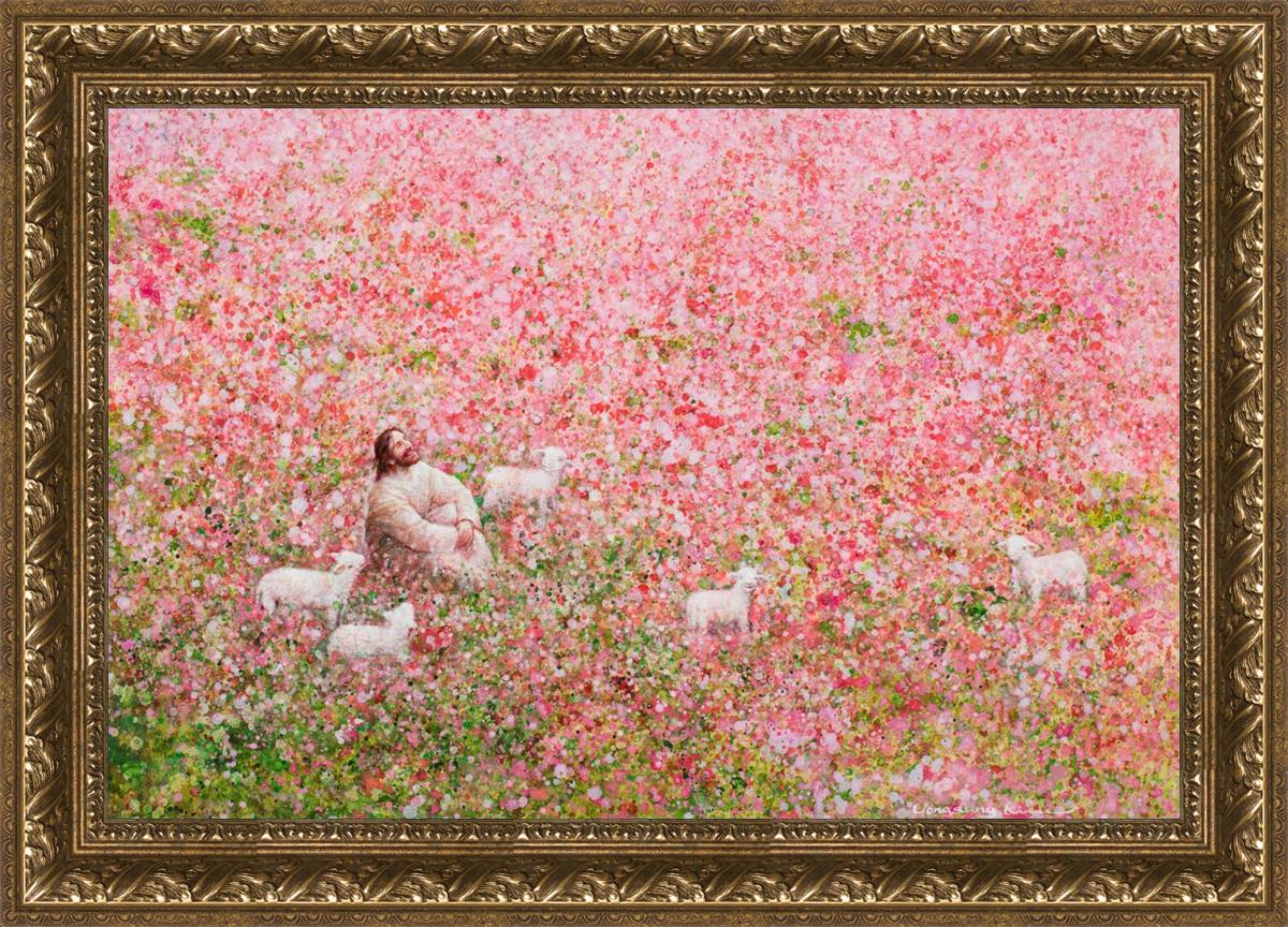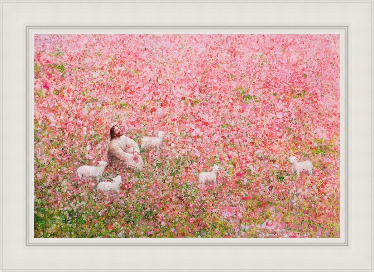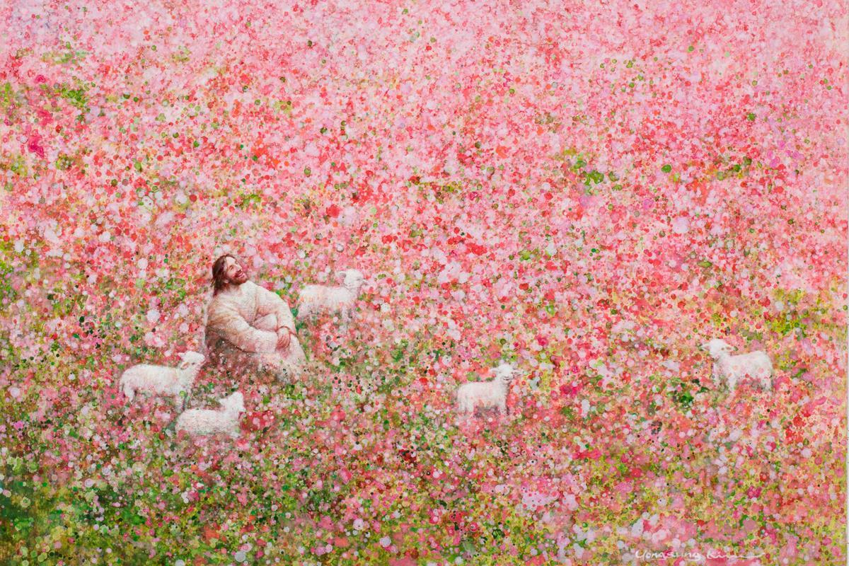 Shepherd's Rest is a painting by Yongsung Kim. This painting depicts Jesus Christ sitting with a lamb in a field of pink and red flowers.