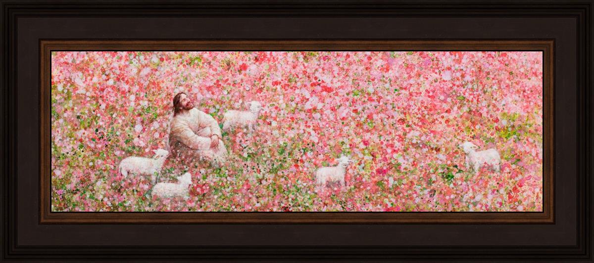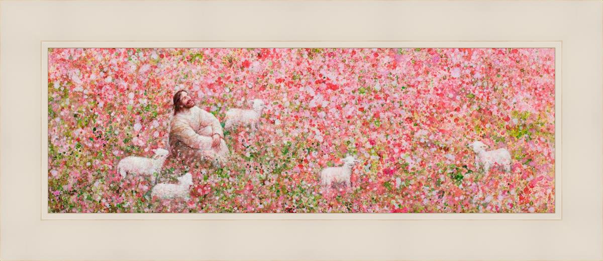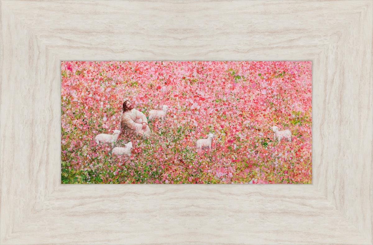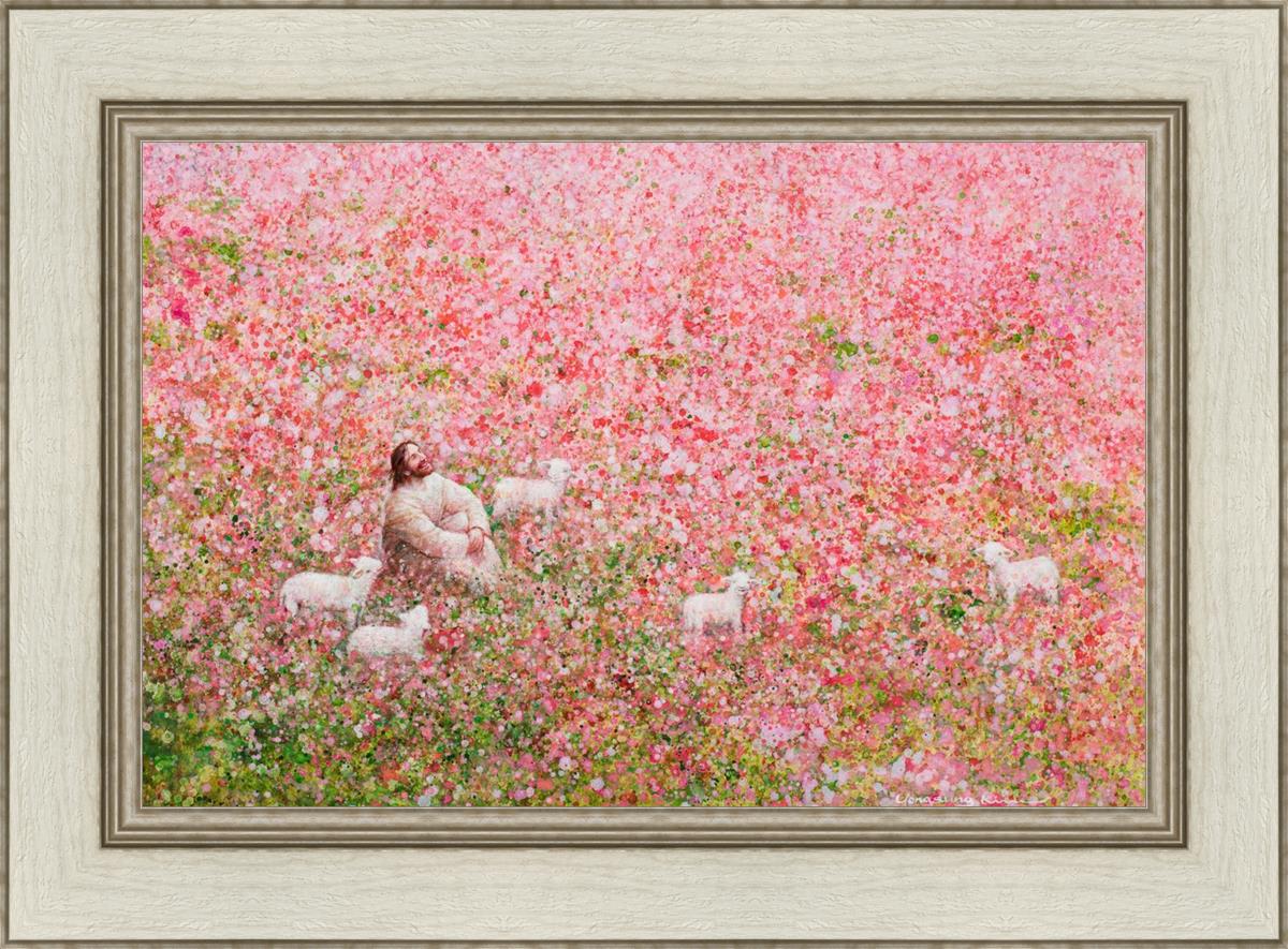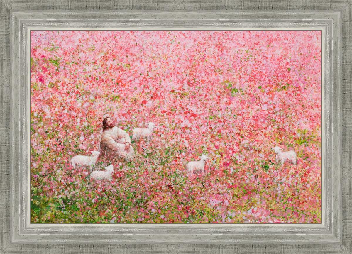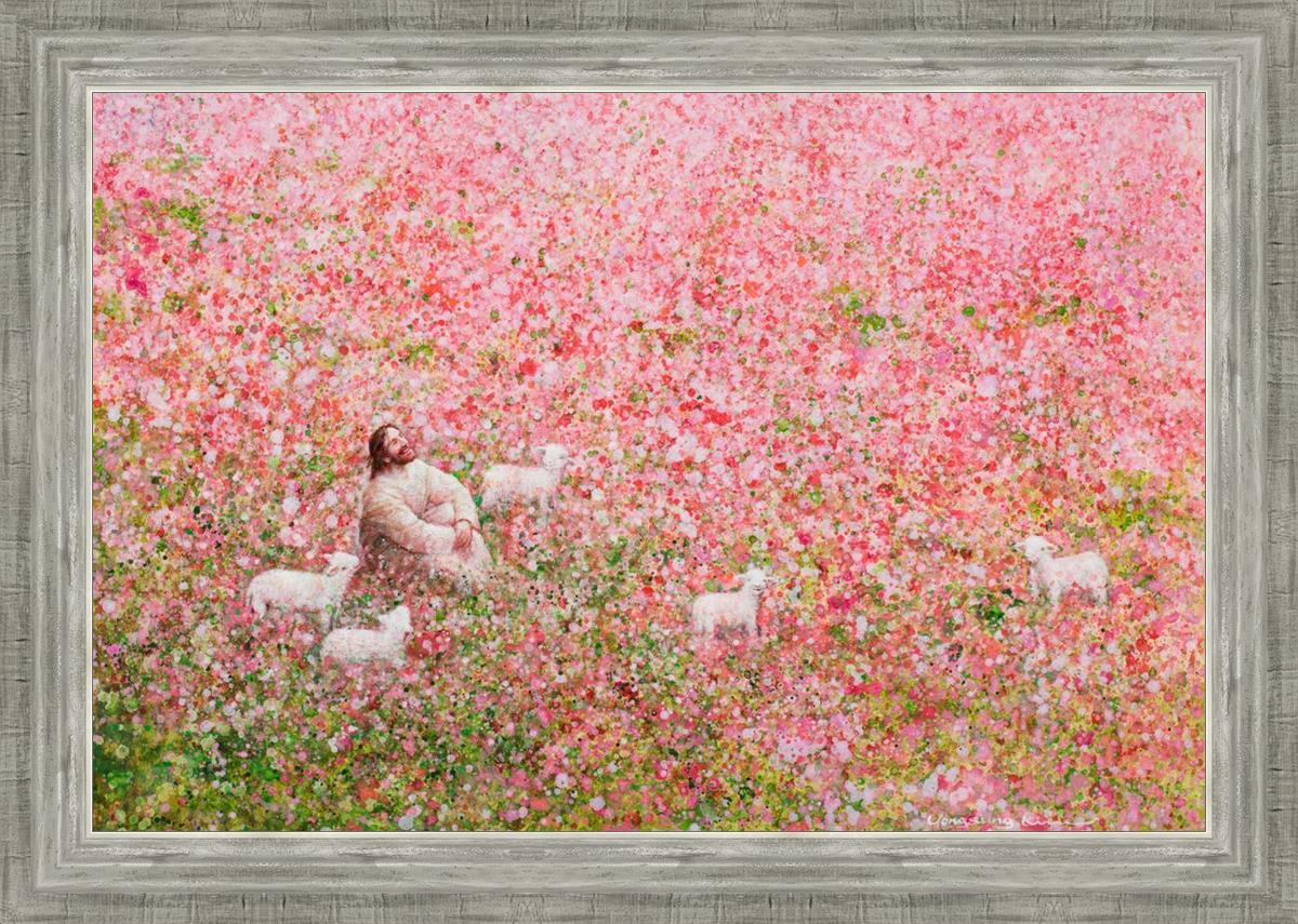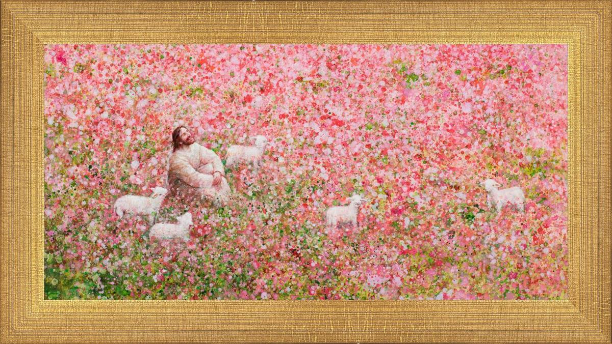 Shepherd's Rest is a painting by Yongsung Kim. This painting depicts Jesus Christ sitting with a lamb in a field of pink and red flowers.