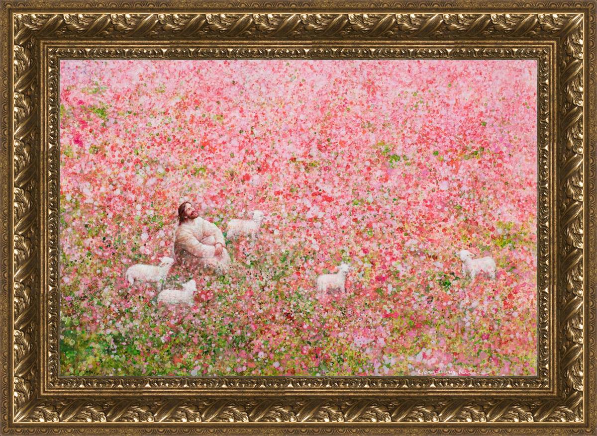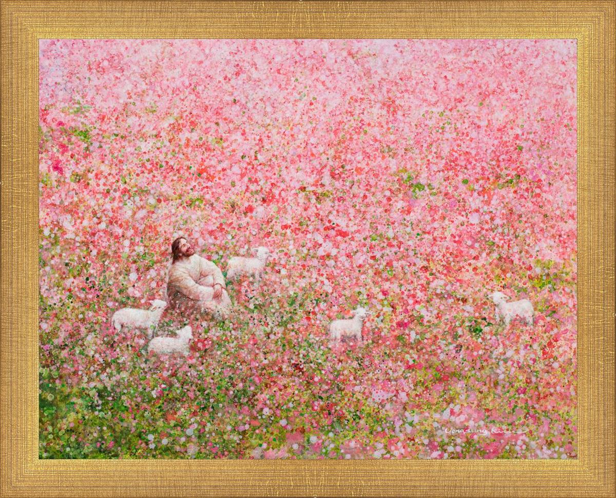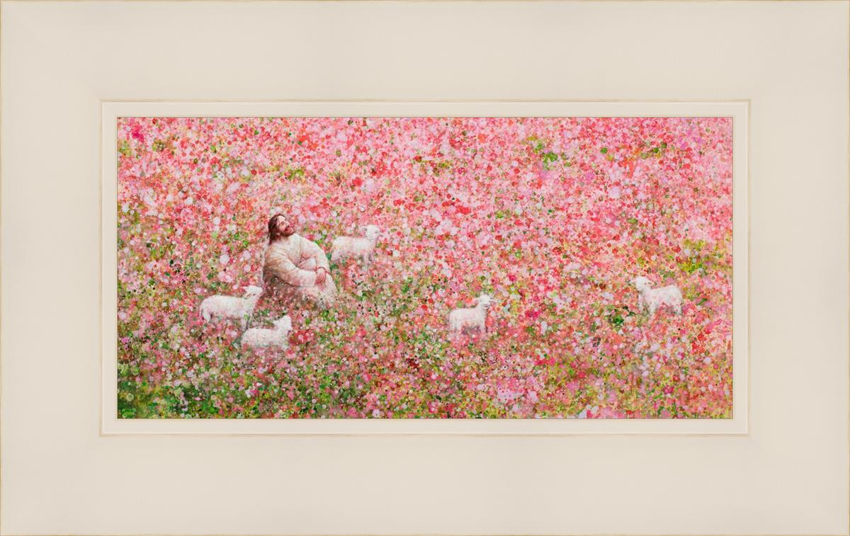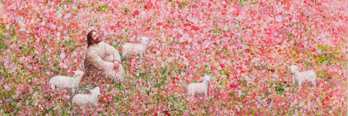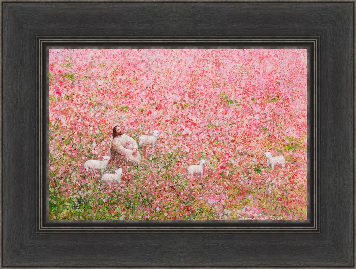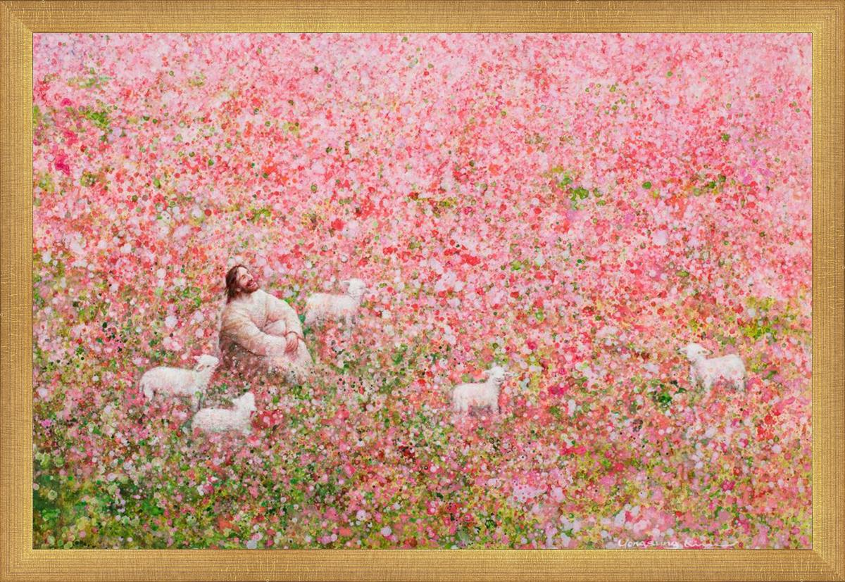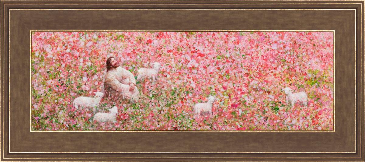 Shepherd's Rest is a painting by Yongsung Kim. This painting depicts Jesus Christ sitting with a lamb in a field of pink and red flowers.