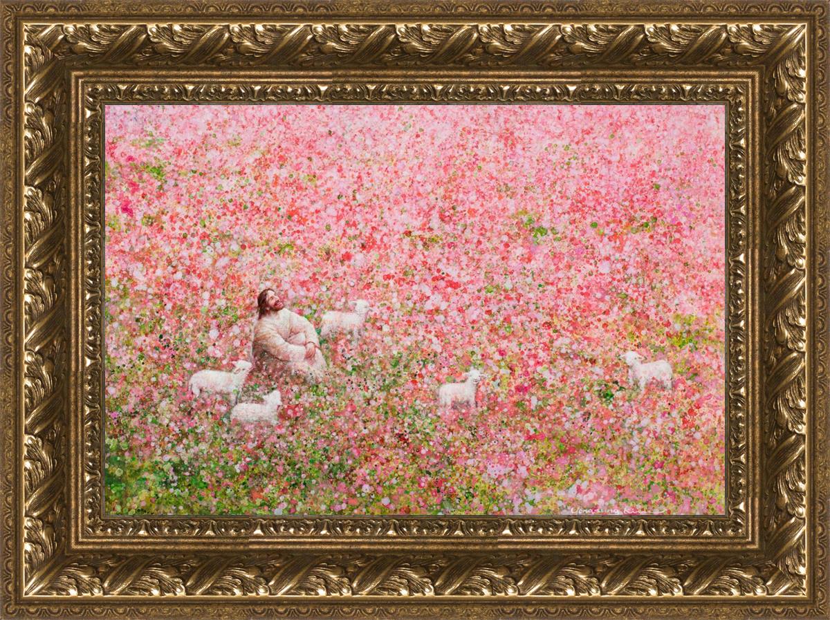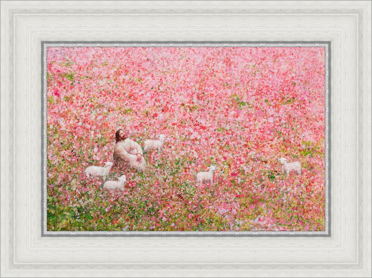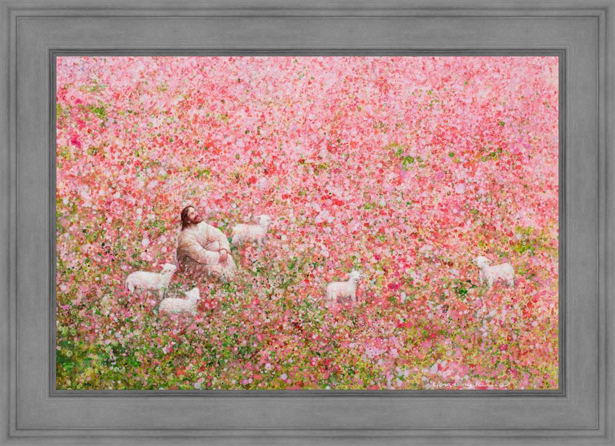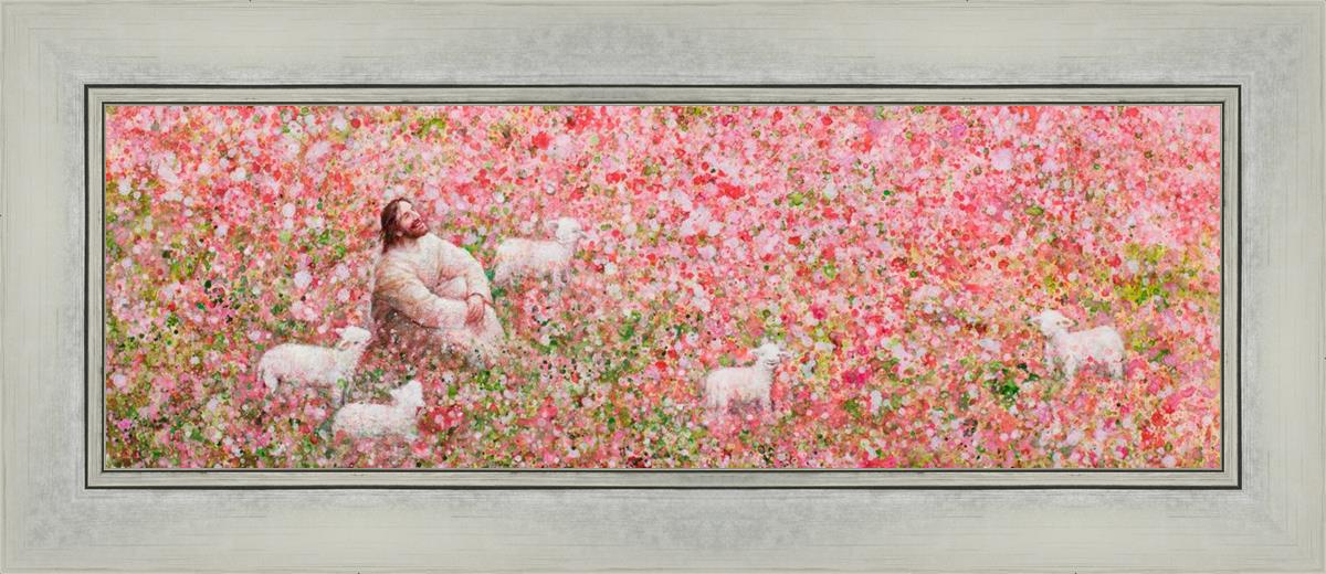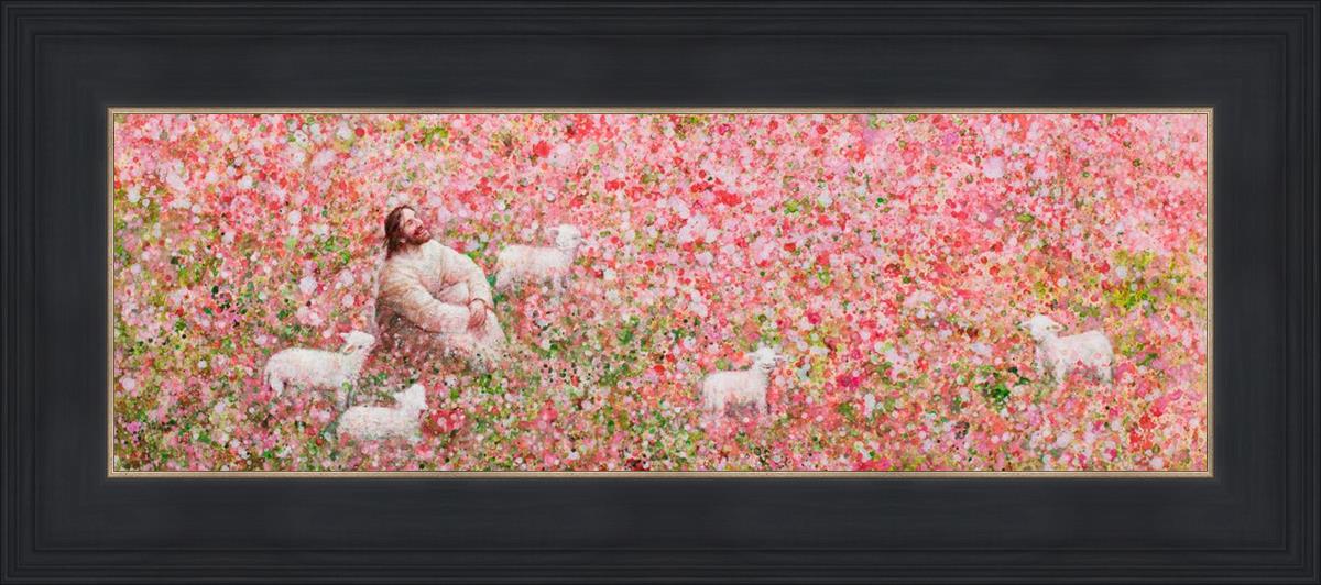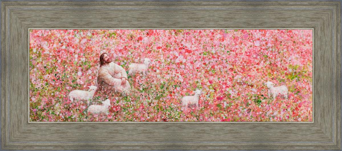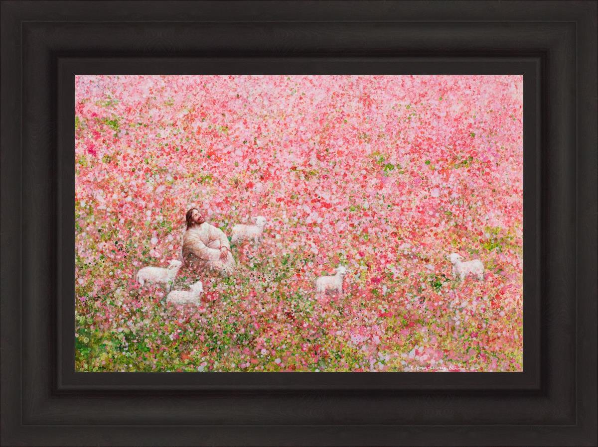 Shepherd's Rest is a painting by Yongsung Kim. This painting depicts Jesus Christ sitting with a lamb in a field of pink and red flowers.