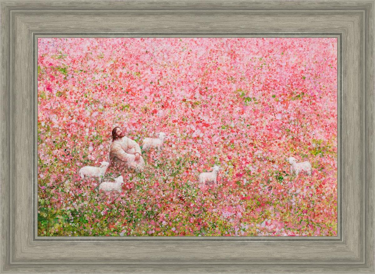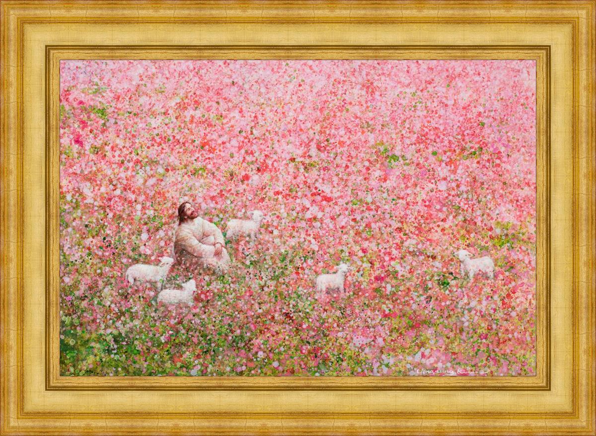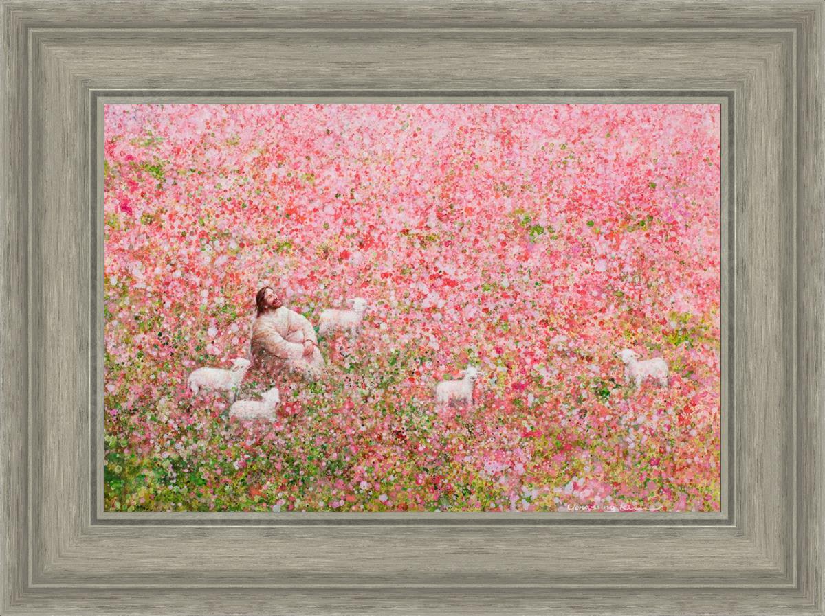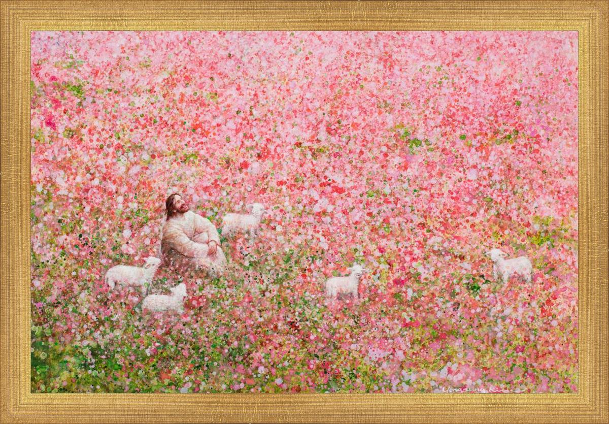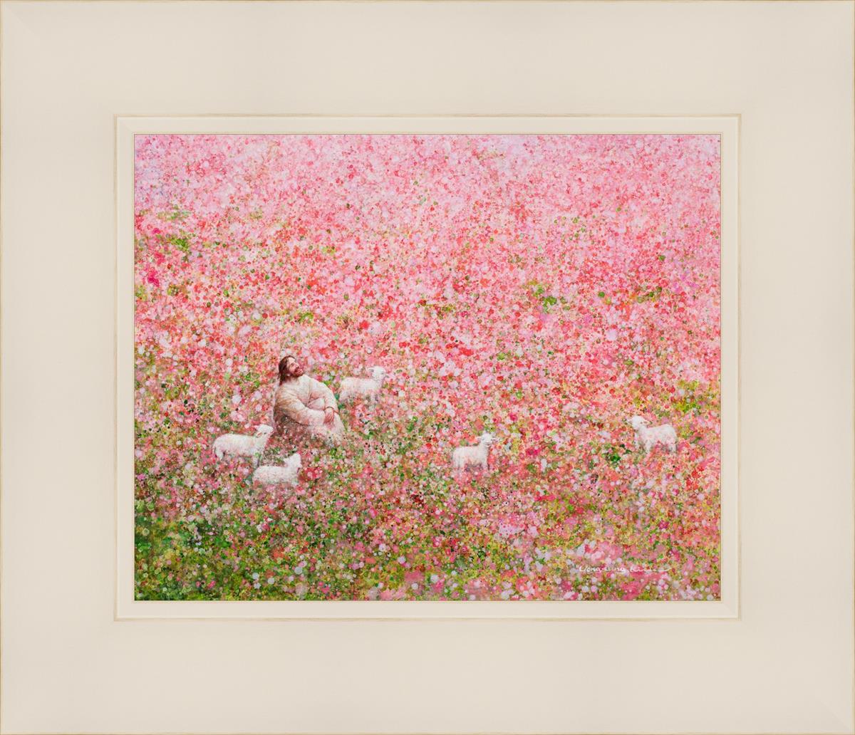 Shepherd's Rest is a painting by Yongsung Kim. This painting depicts Jesus Christ sitting with a lamb in a field of pink and red flowers.