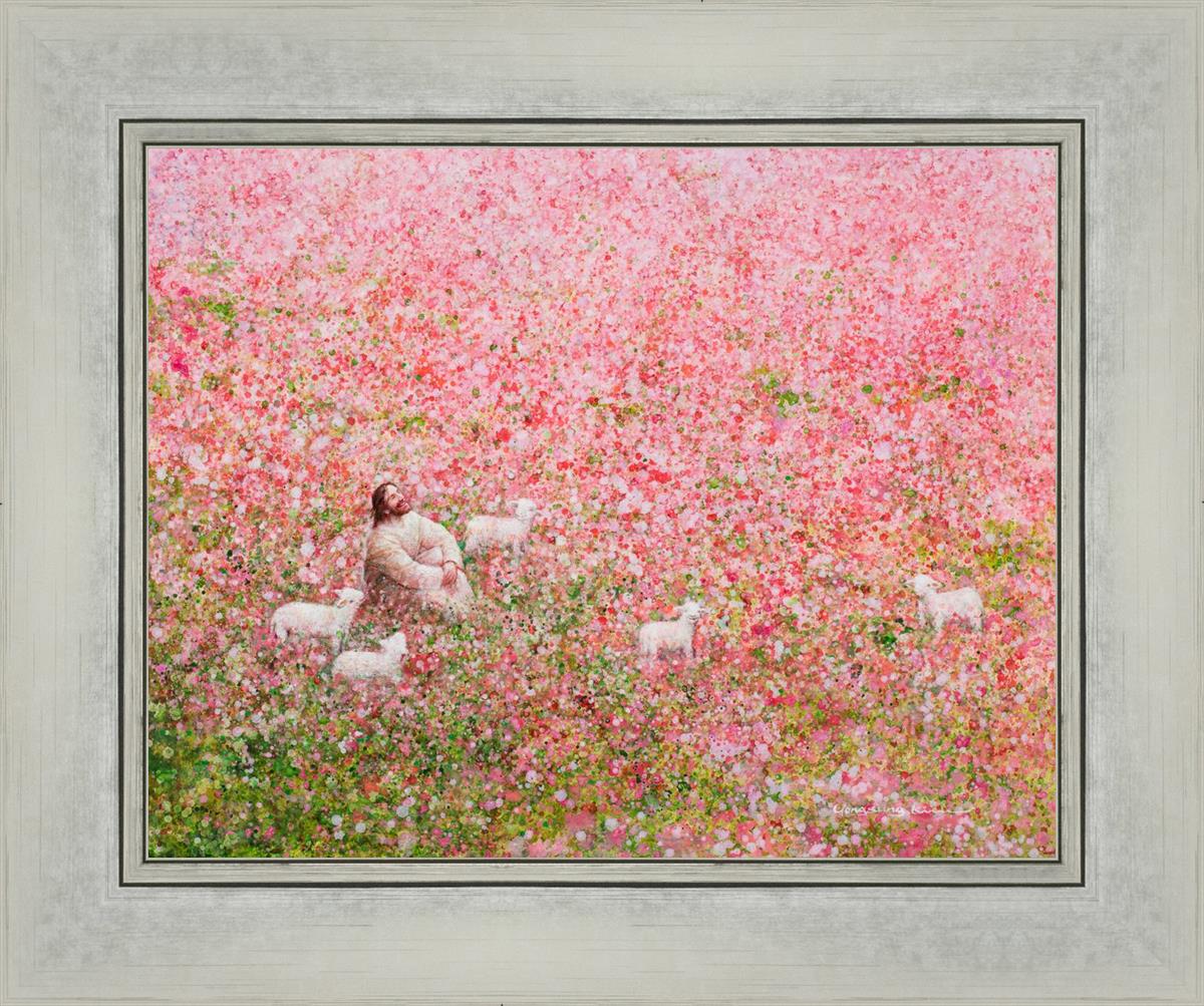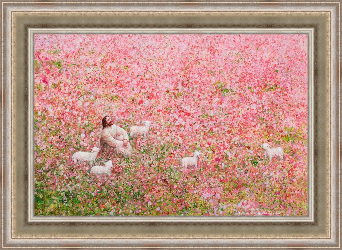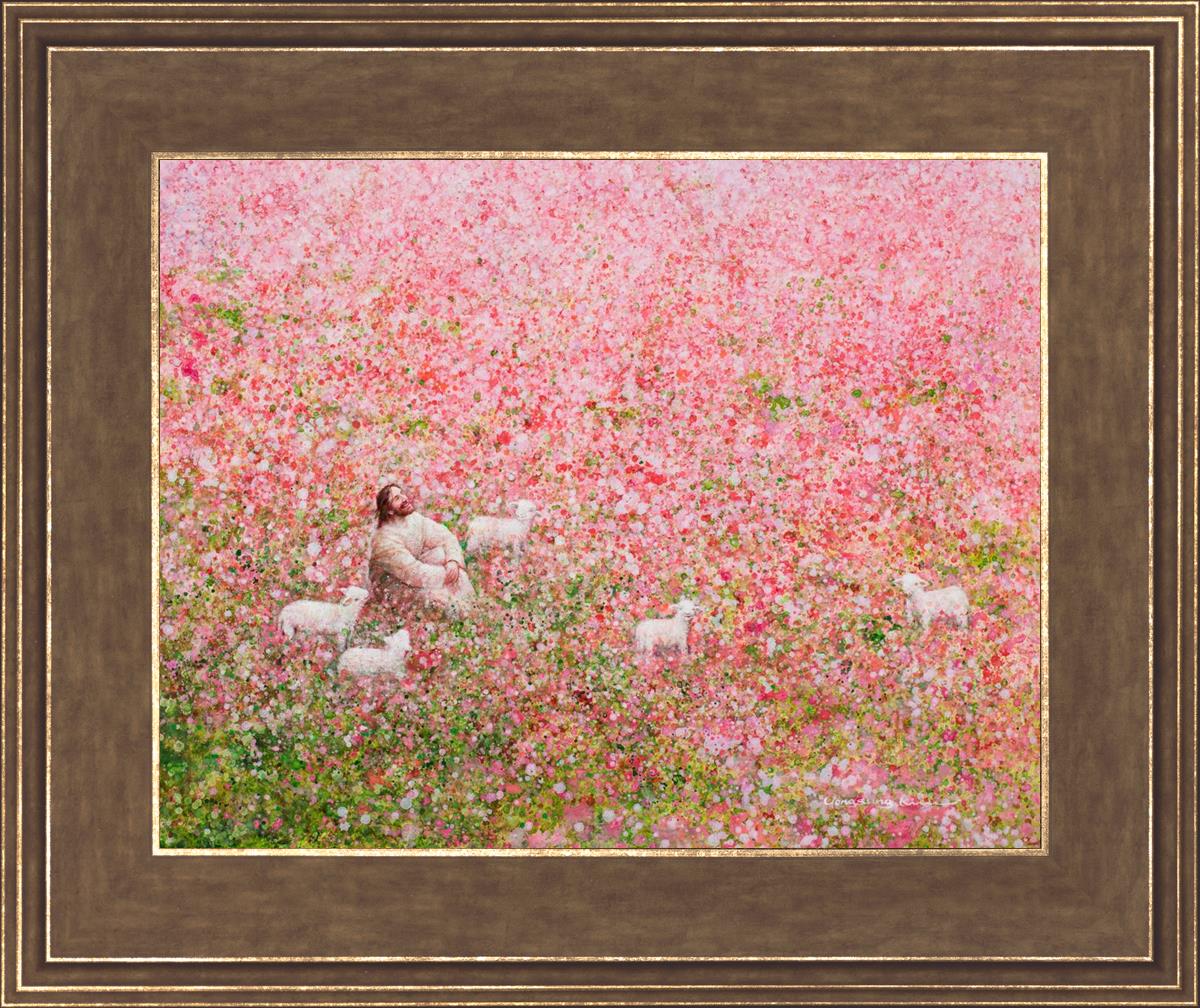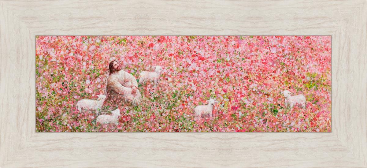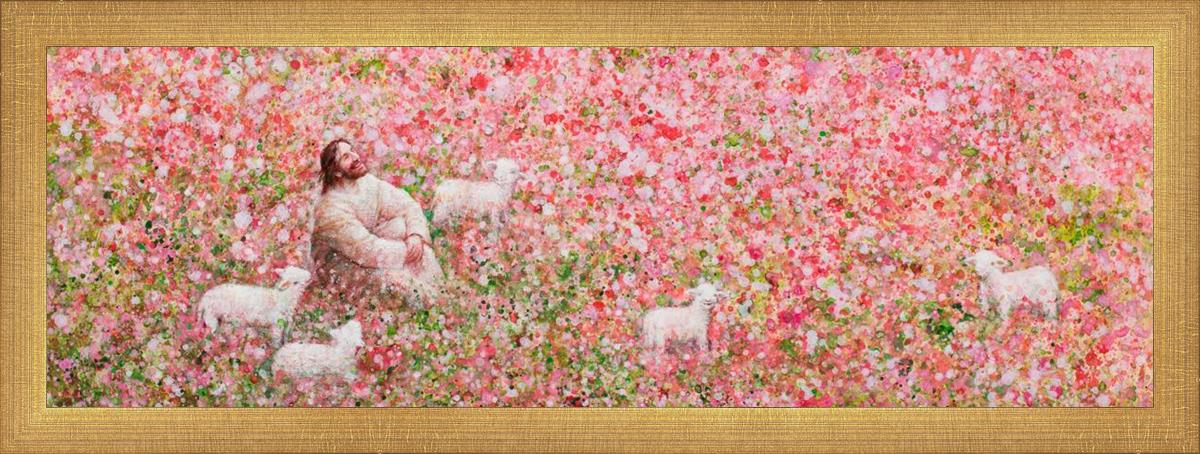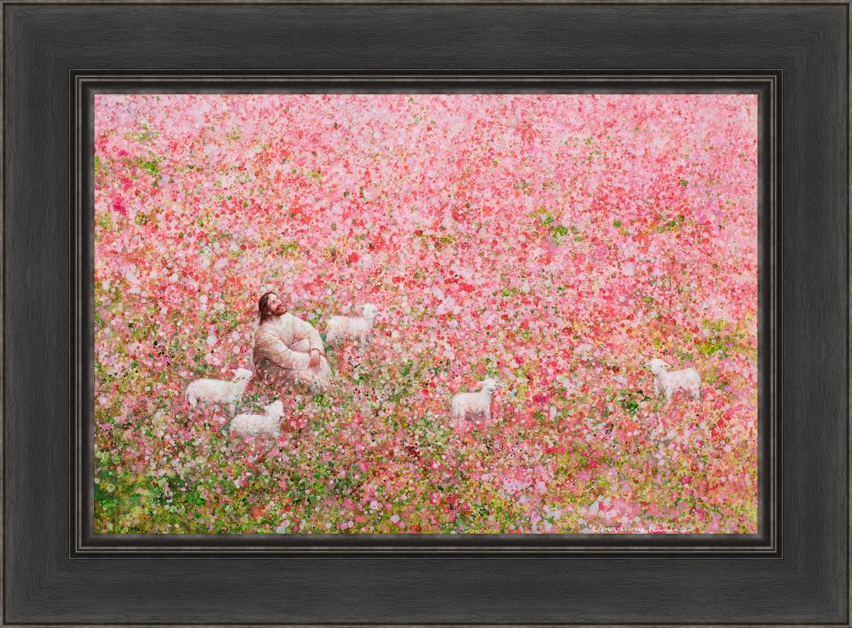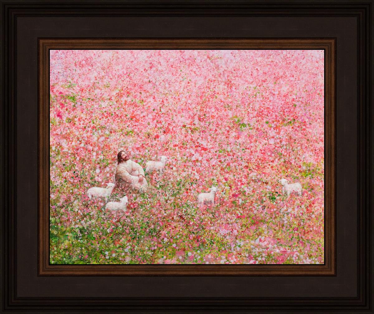 Shepherd's Rest is a painting by Yongsung Kim. This painting depicts Jesus Christ sitting with a lamb in a field of pink and red flowers.