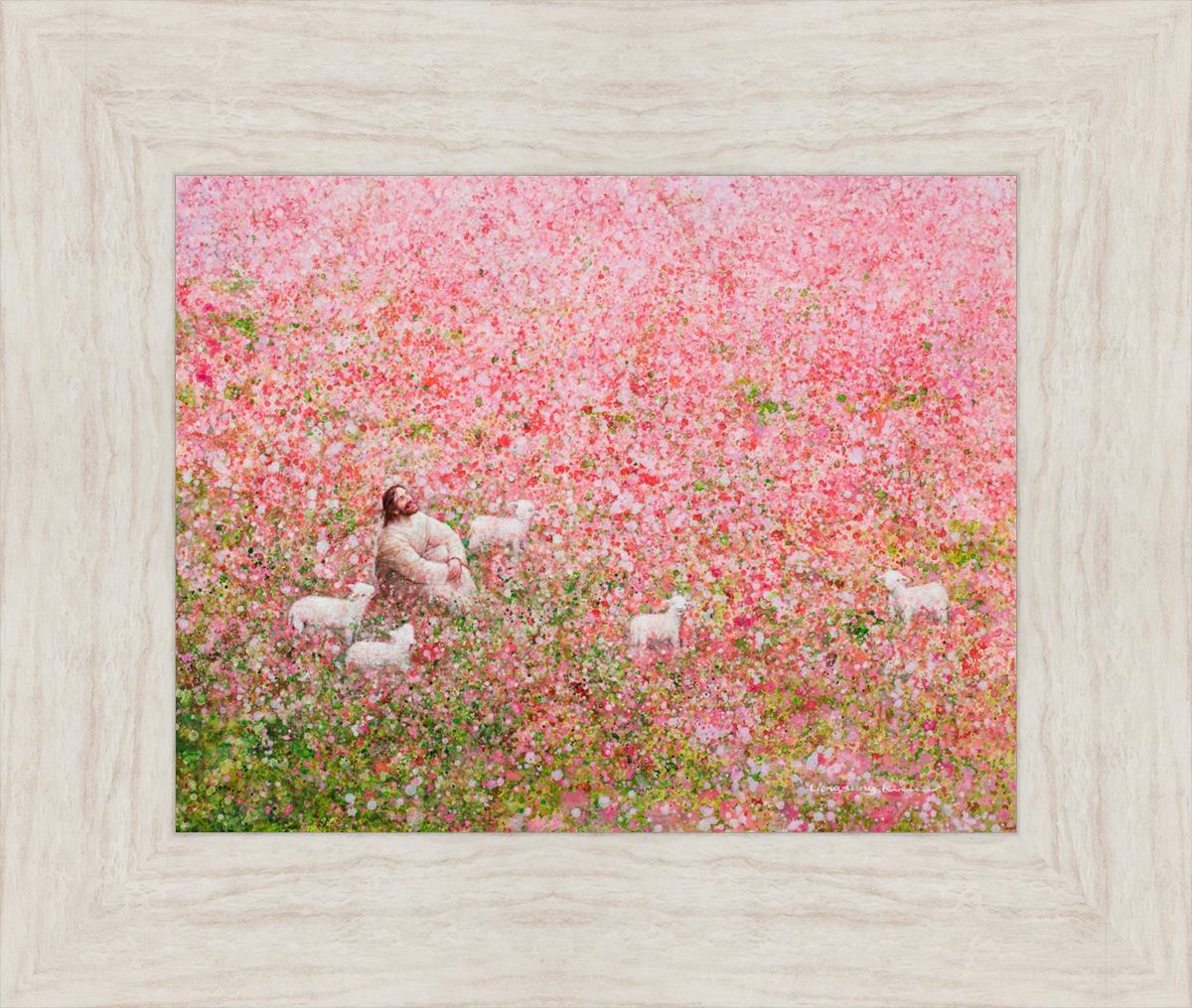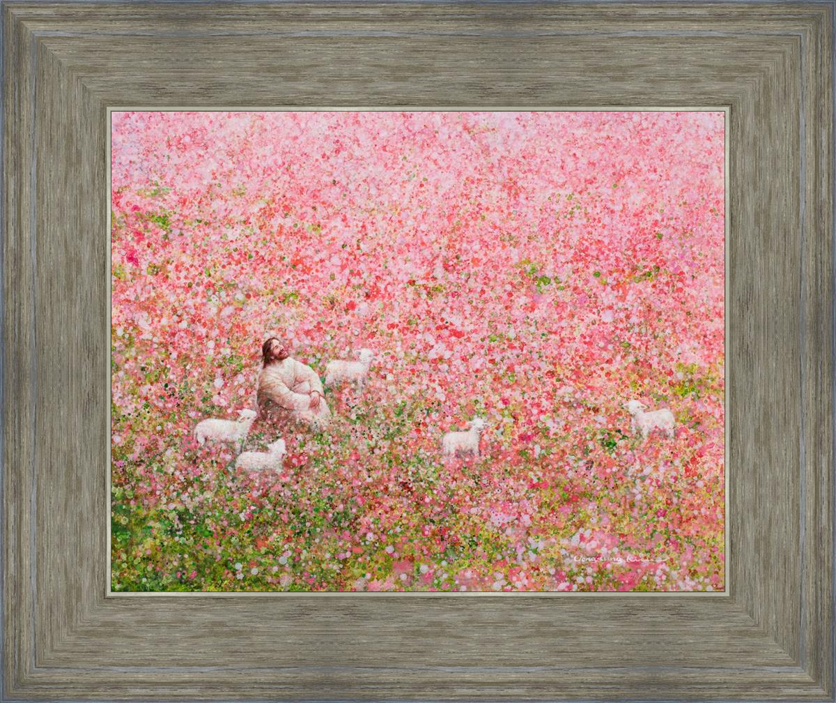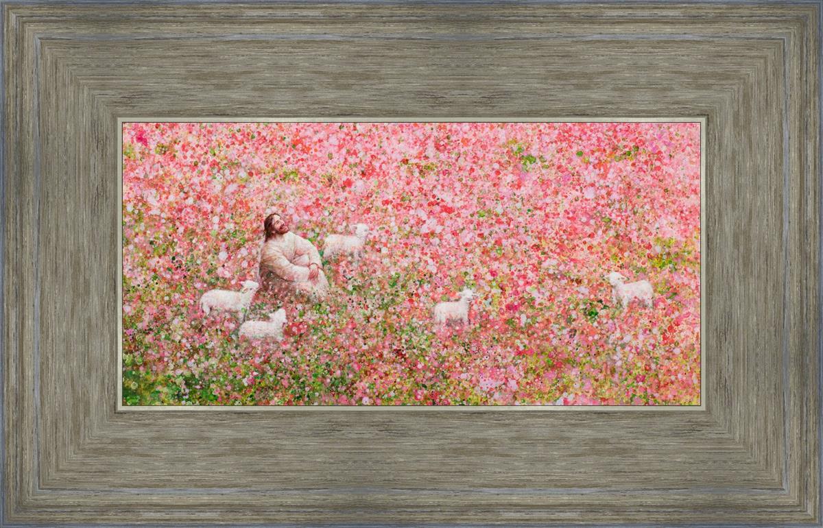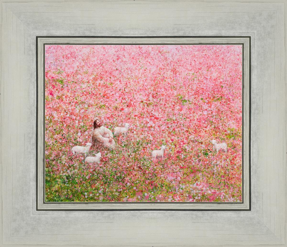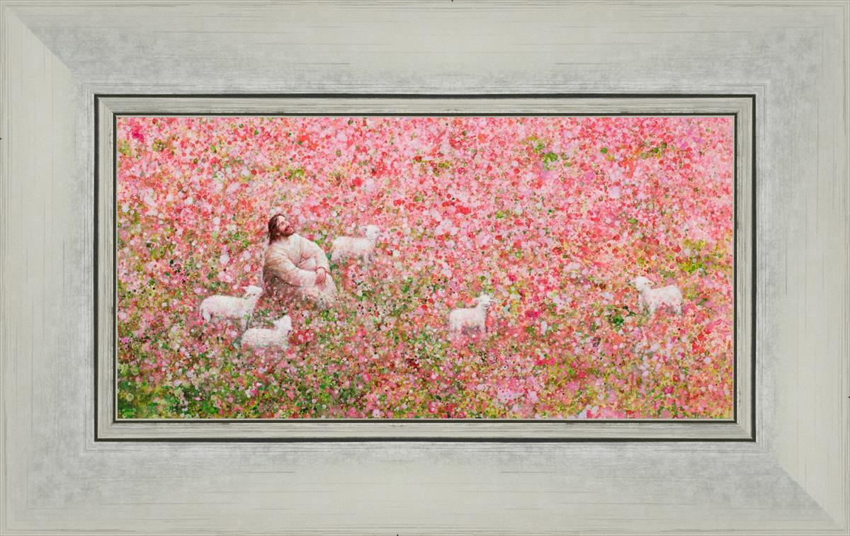 Shepherd's Rest is a painting by Yongsung Kim. This painting depicts Jesus Christ sitting with a lamb in a field of pink and red flowers.