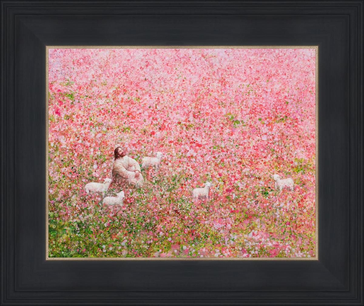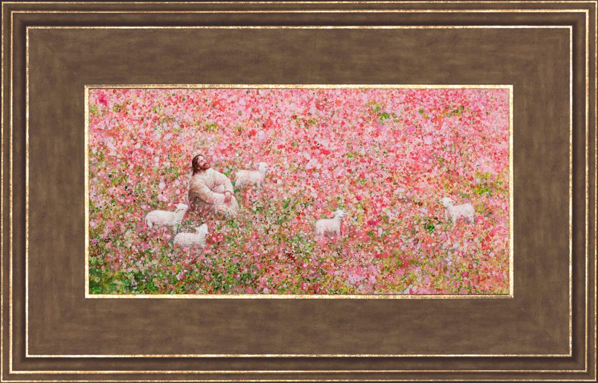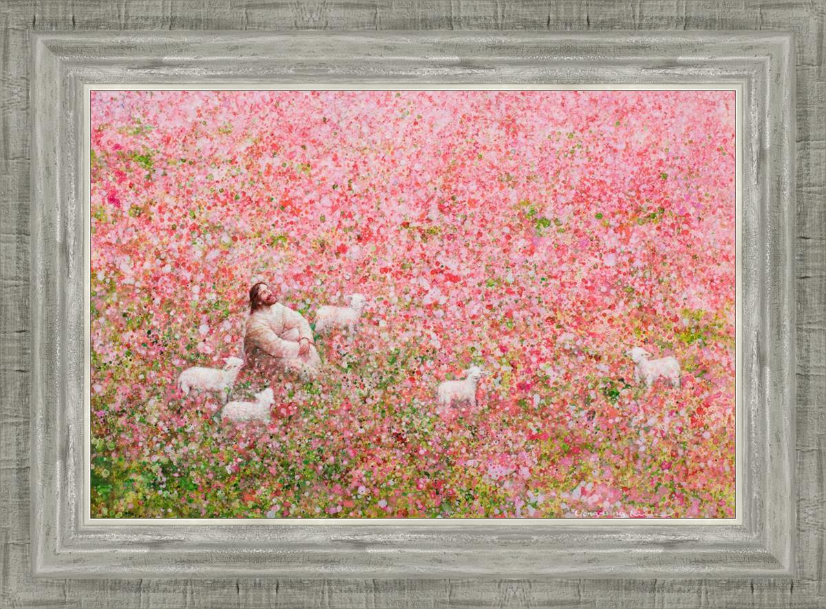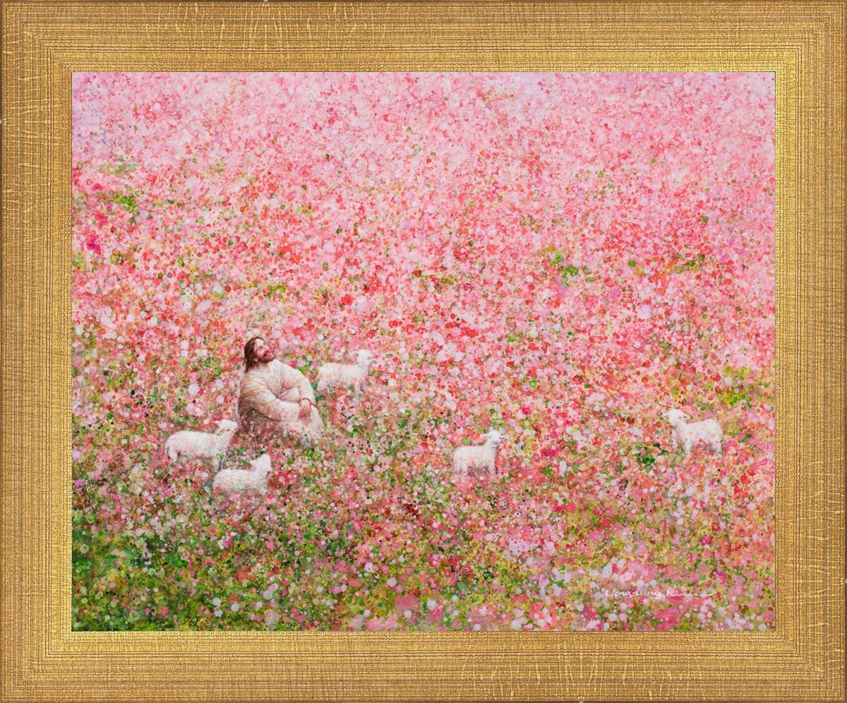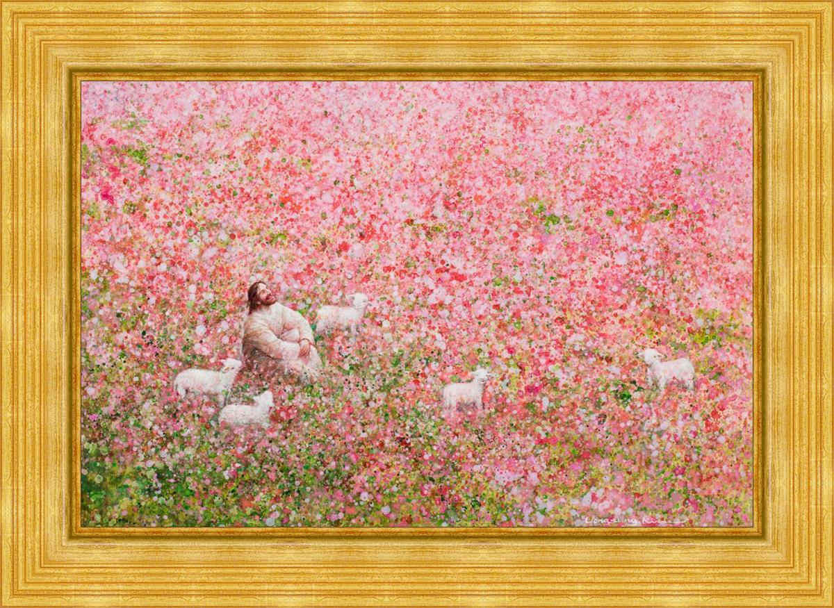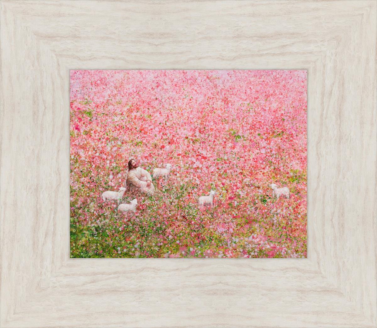 Shepherd's Rest is a painting by Yongsung Kim. This painting depicts Jesus Christ sitting with a lamb in a field of pink and red flowers.