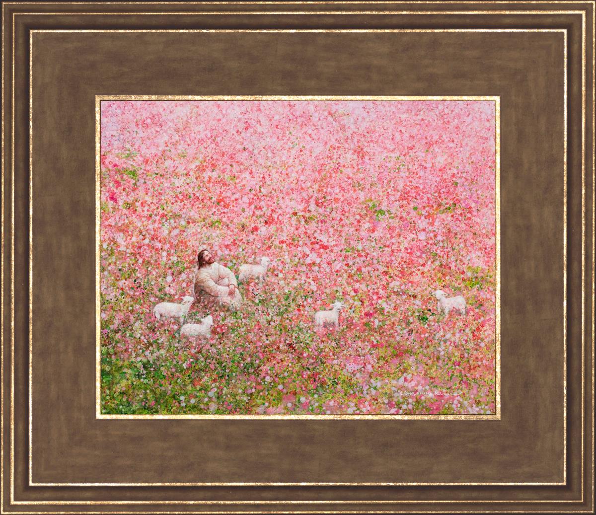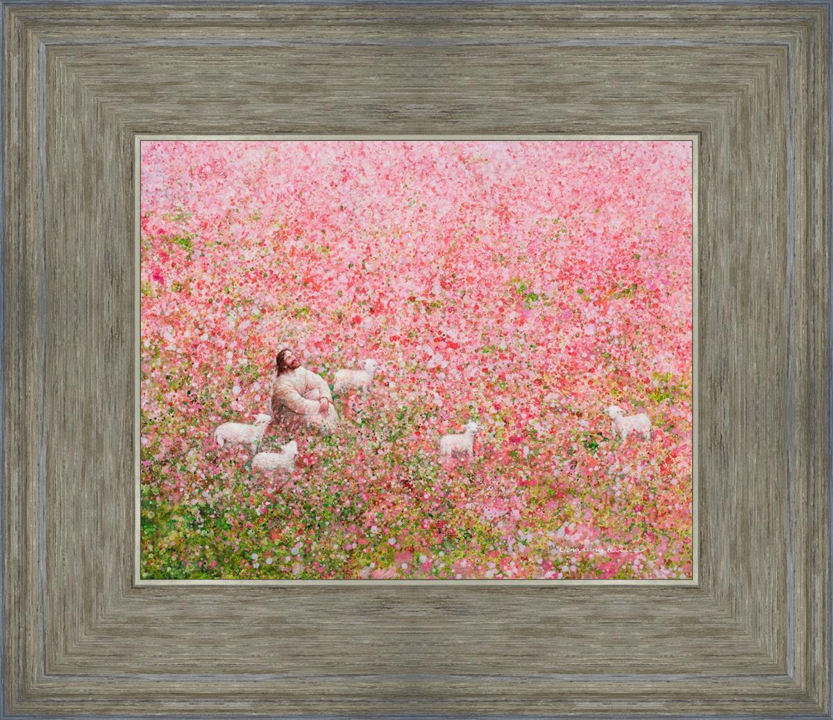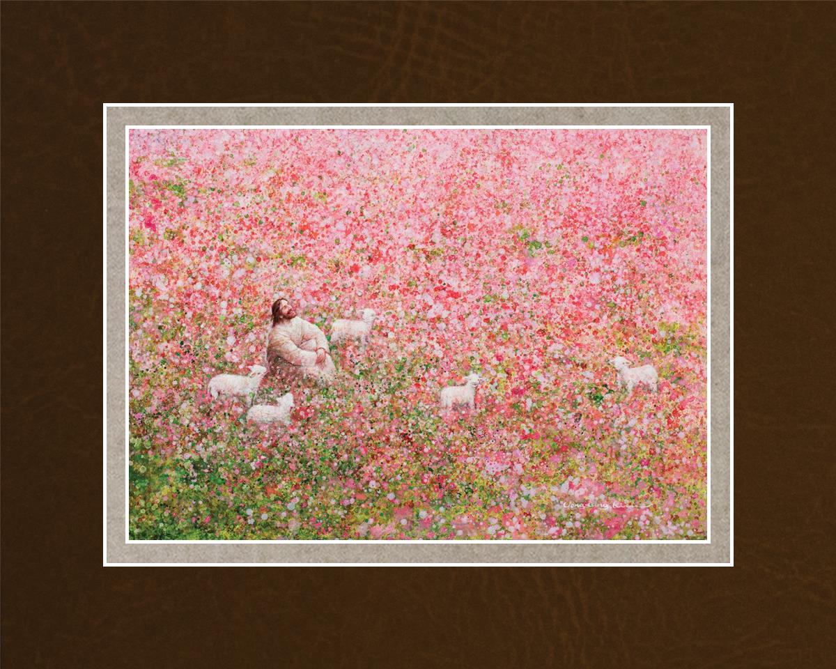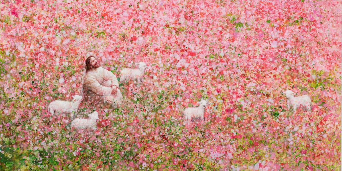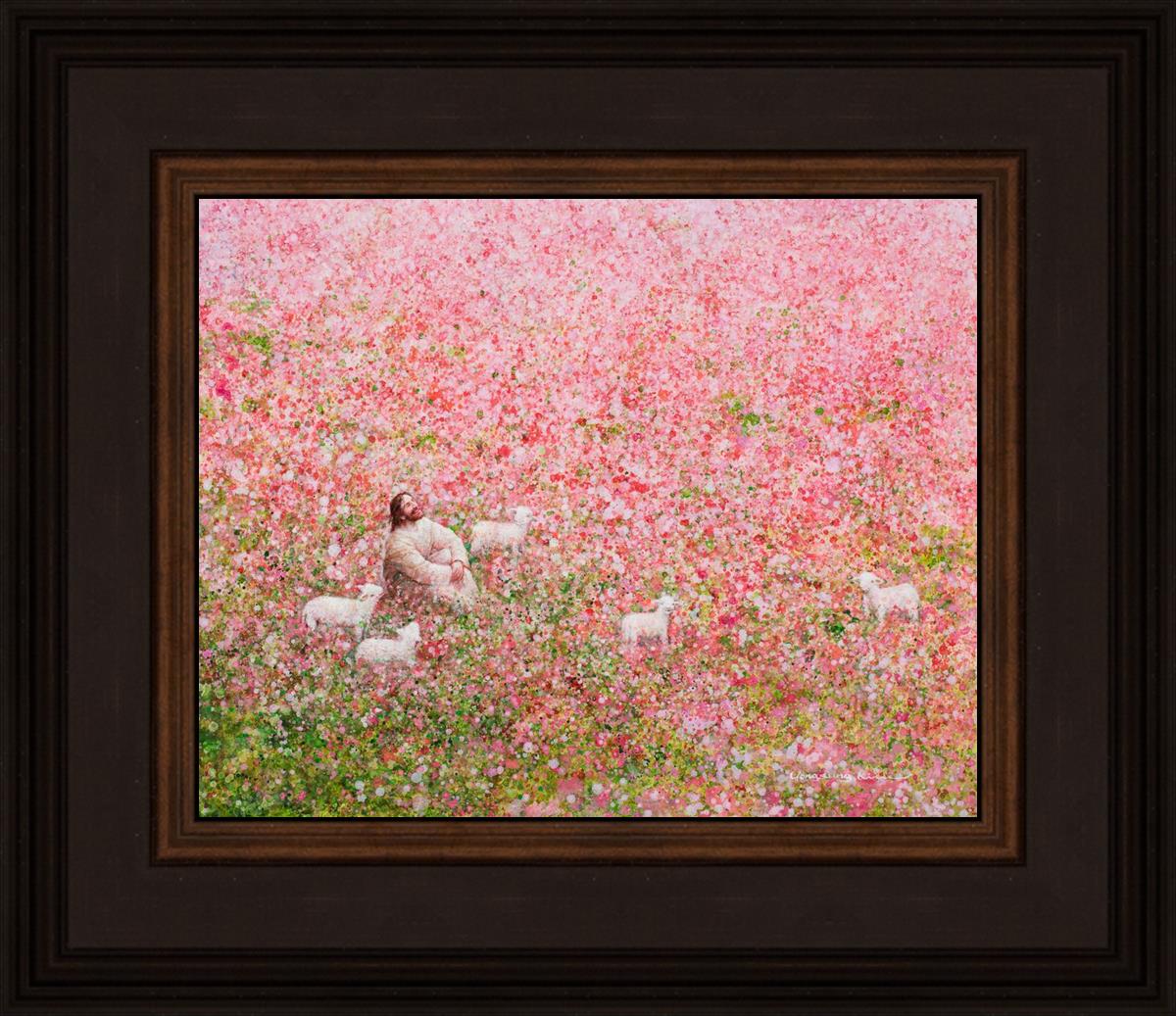 Shepherd's Rest is a painting by Yongsung Kim. This painting depicts Jesus Christ sitting with a lamb in a field of pink and red flowers.