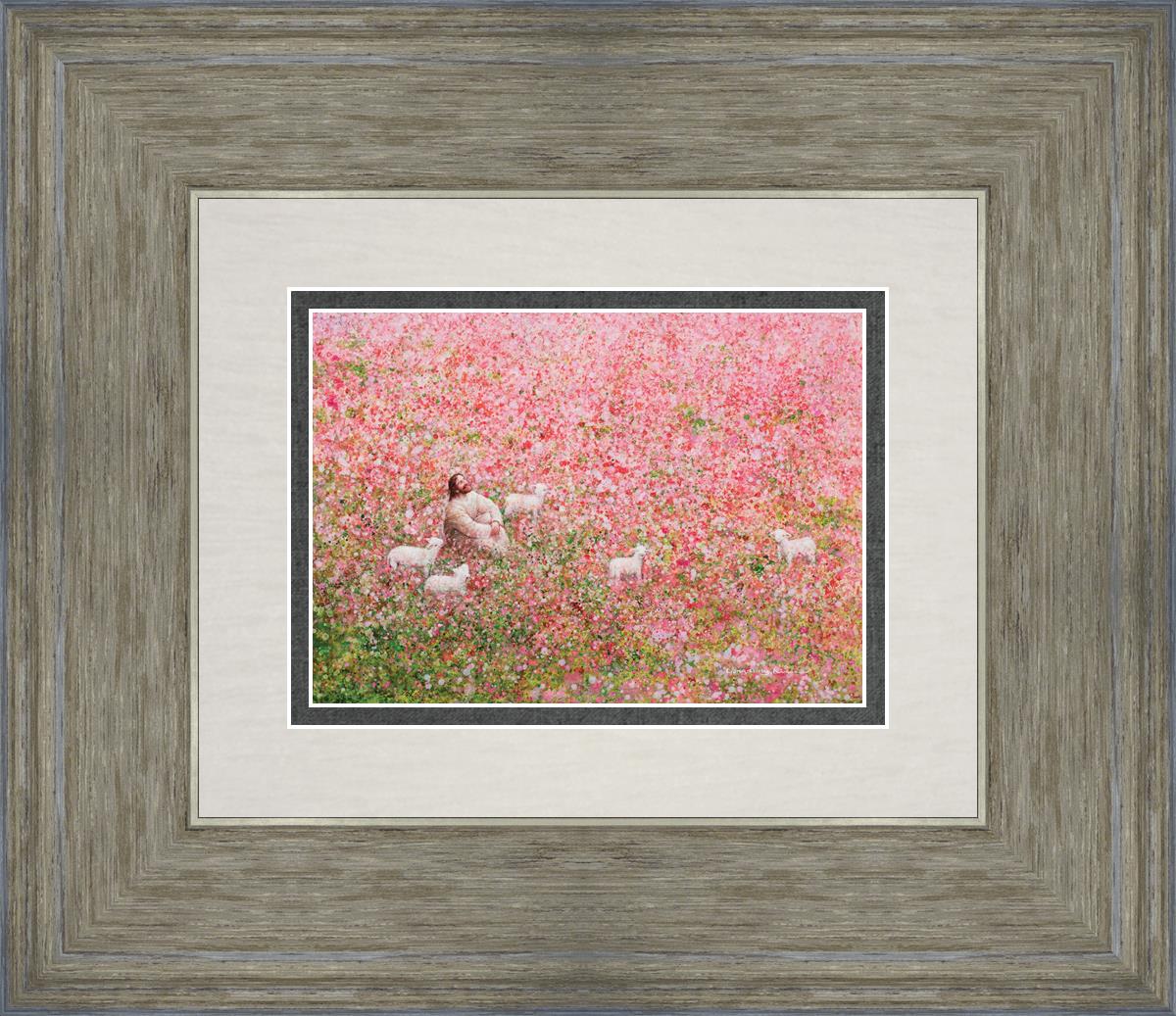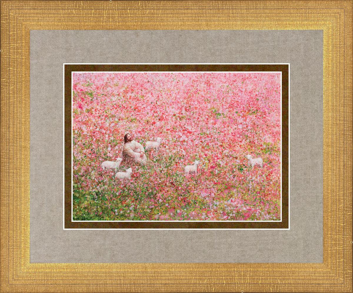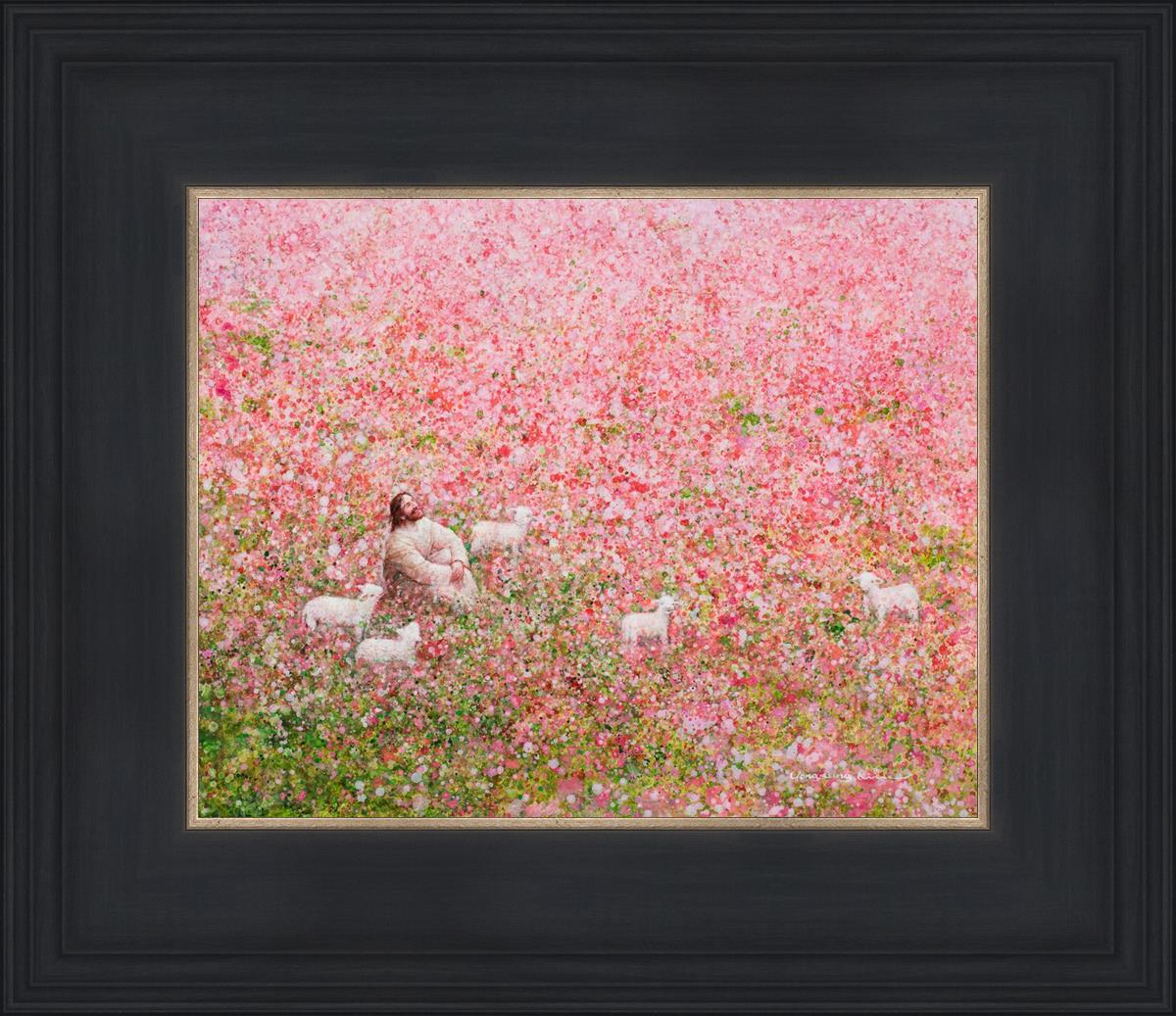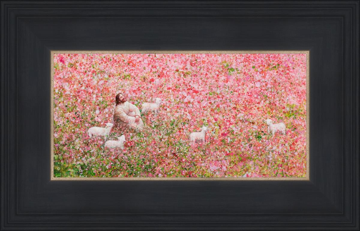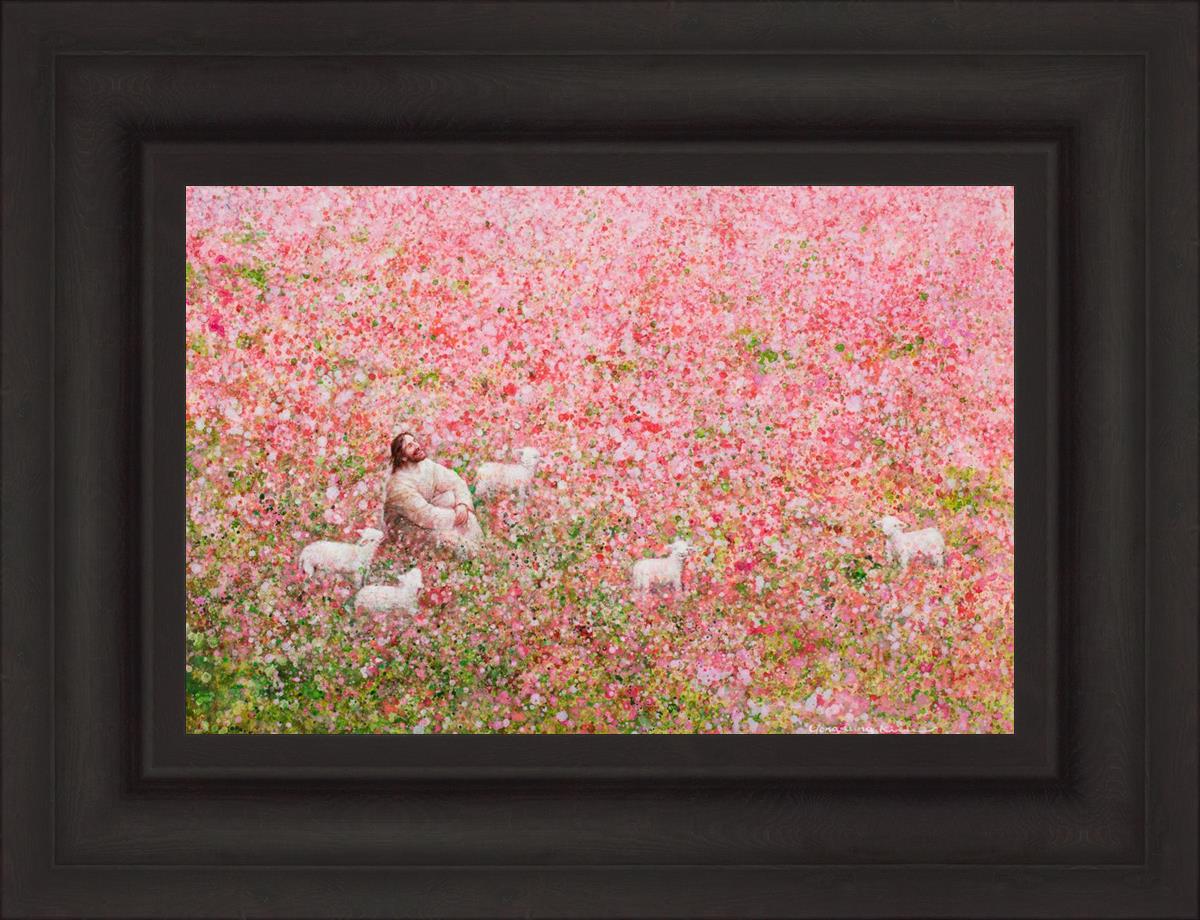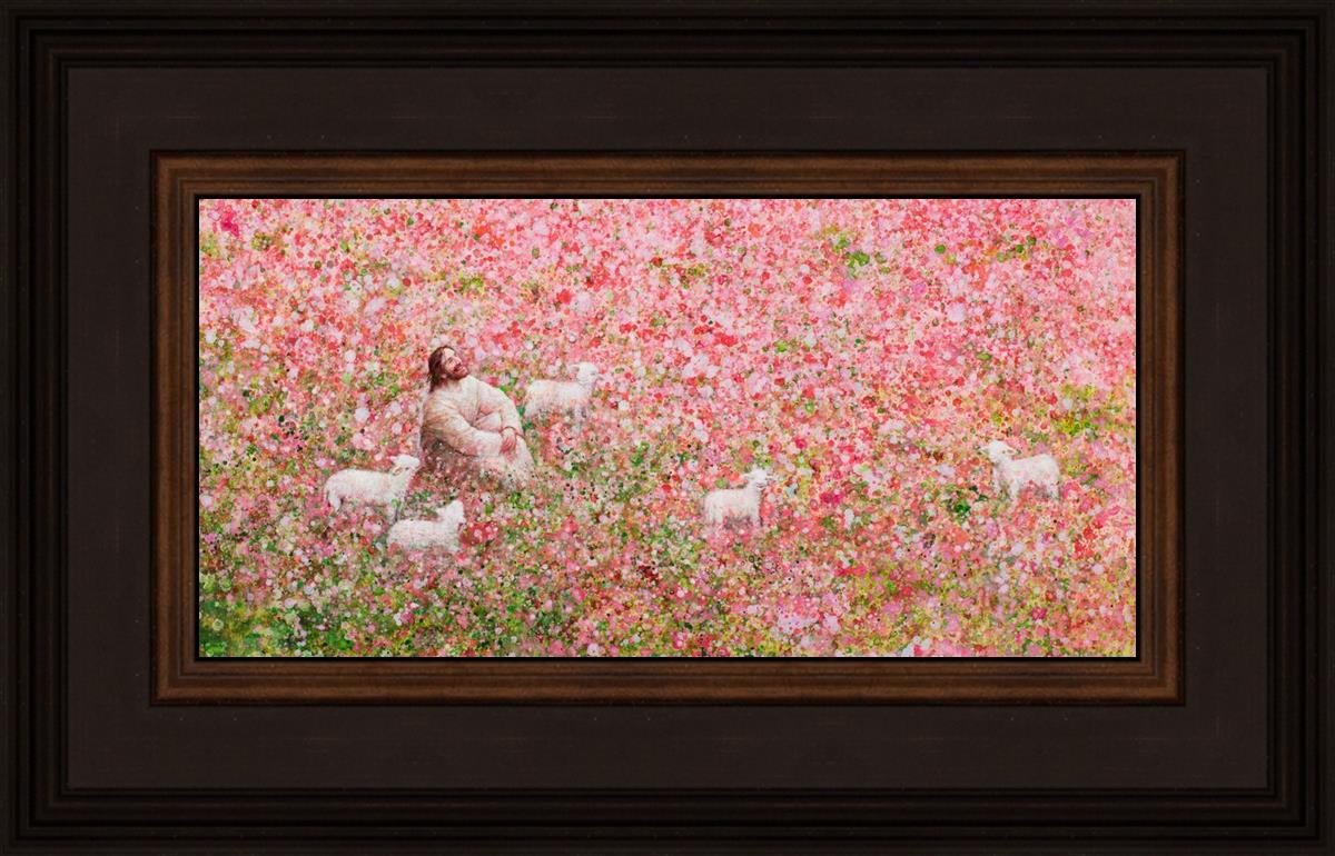 Shepherd's Rest is a painting by Yongsung Kim. This painting depicts Jesus Christ sitting with a lamb in a field of pink and red flowers.