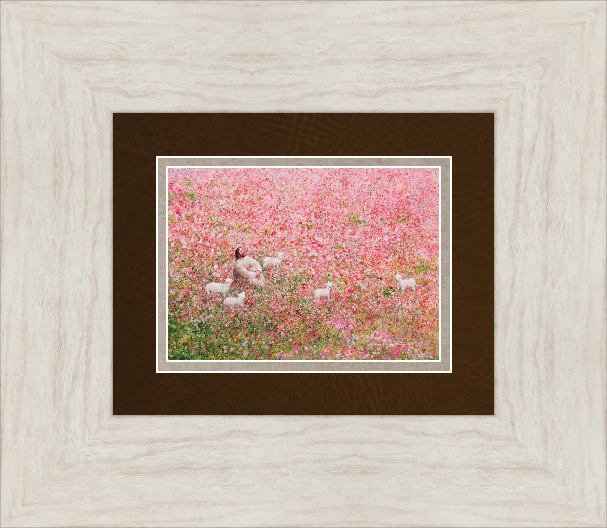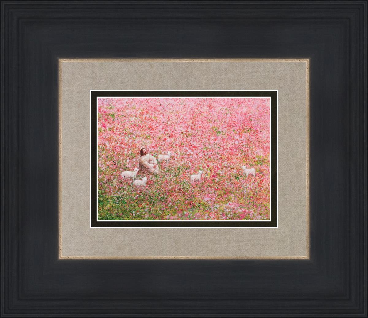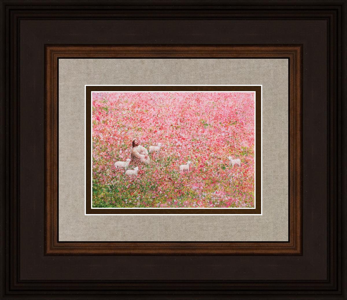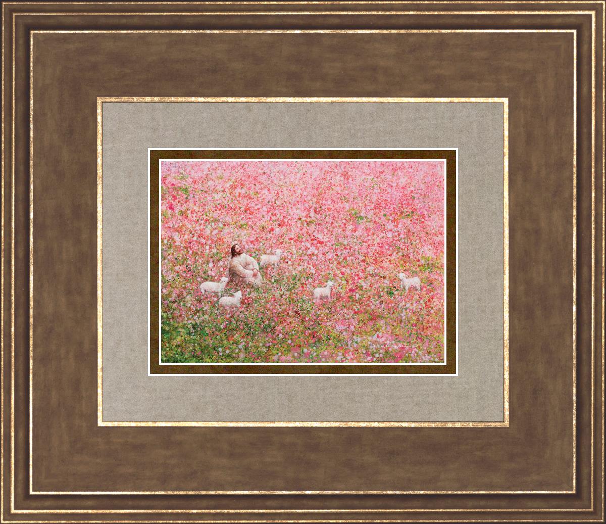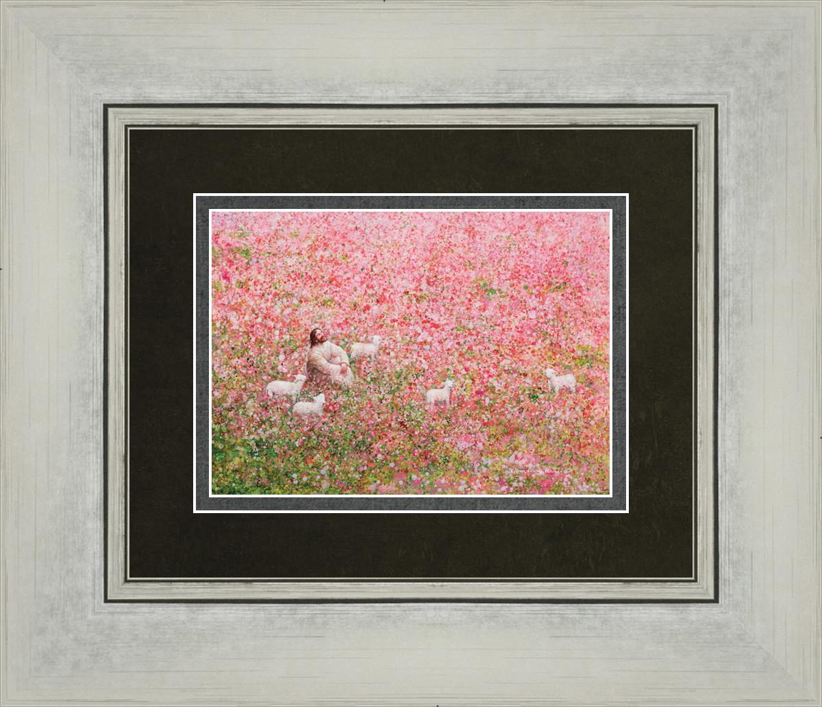 Shepherd's Rest is a painting by Yongsung Kim. This painting depicts Jesus Christ sitting with a lamb in a field of pink and red flowers.