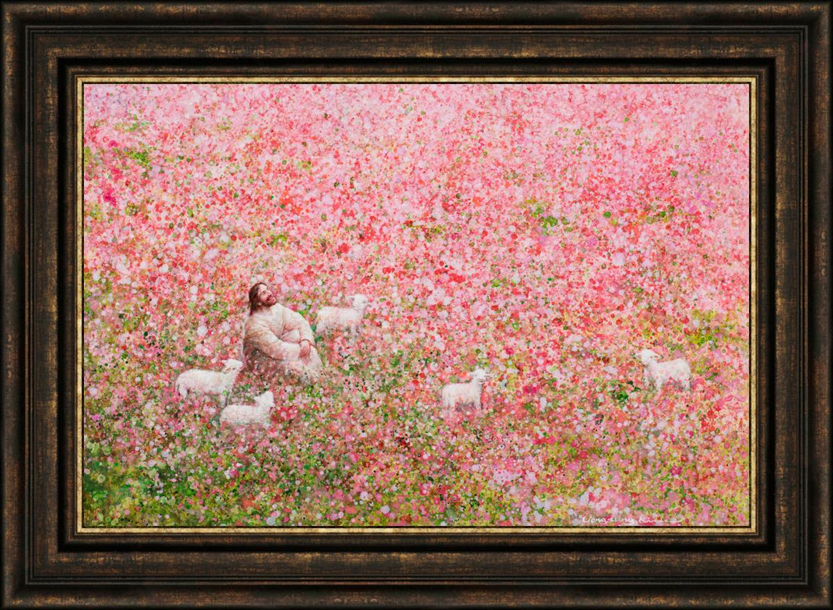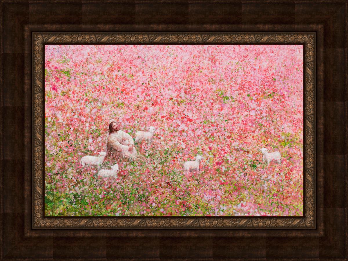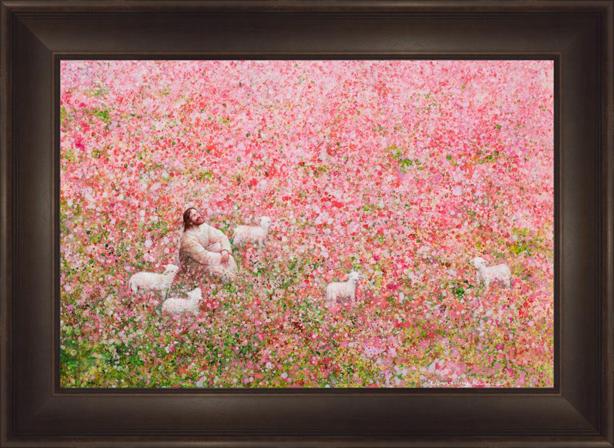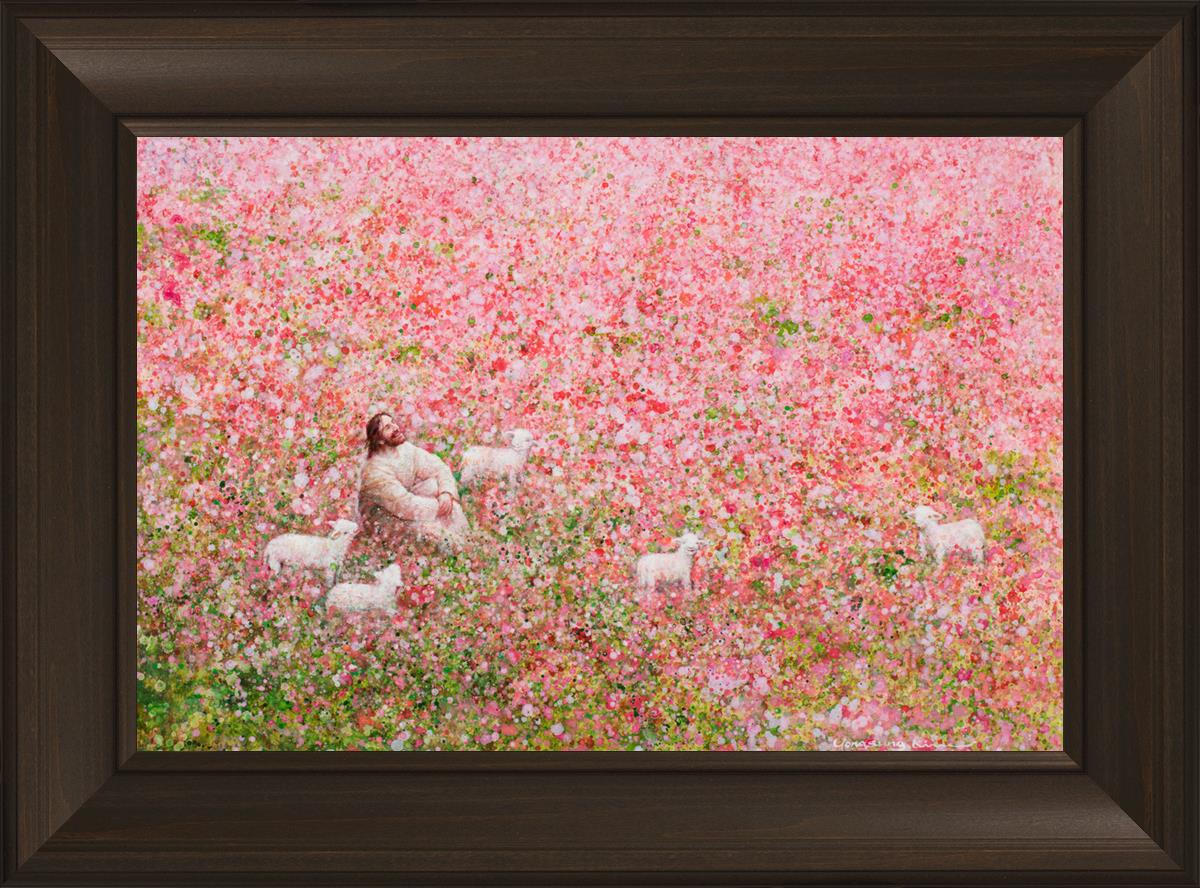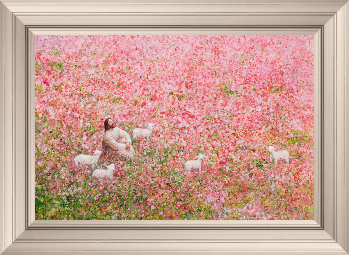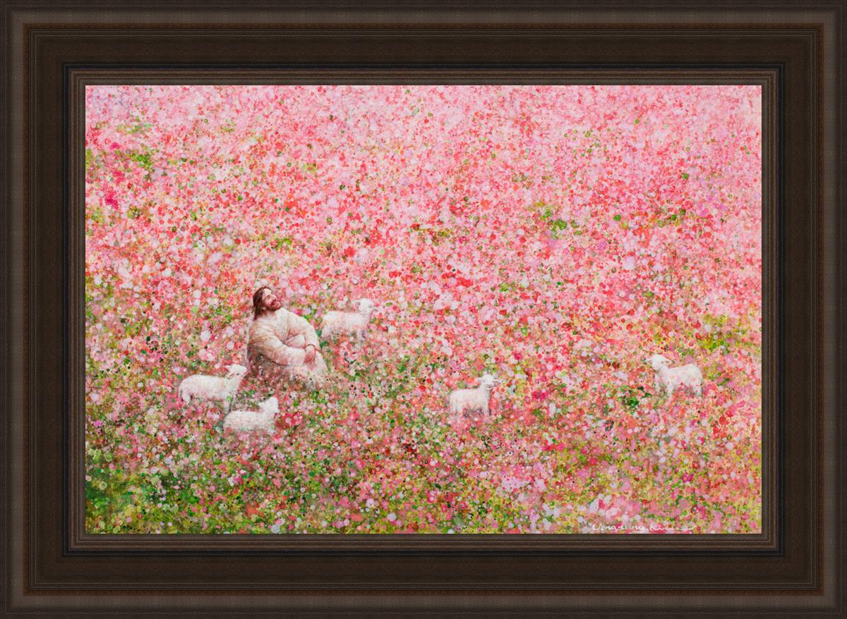 Shepherd's Rest by Yongsung Kim shows Jesus sitting down with His face lifted towards heaven in a field of pink flowers surrounded by lambs. This painting is available in print and canvas.