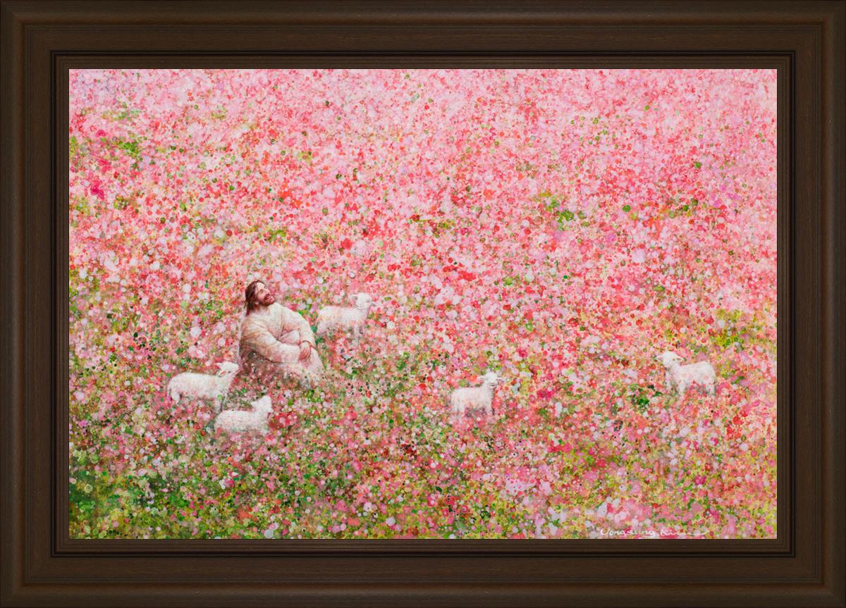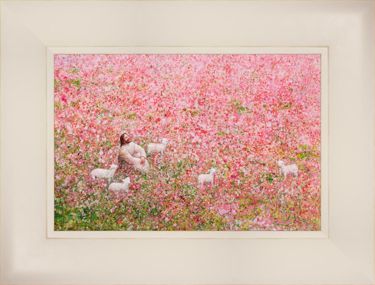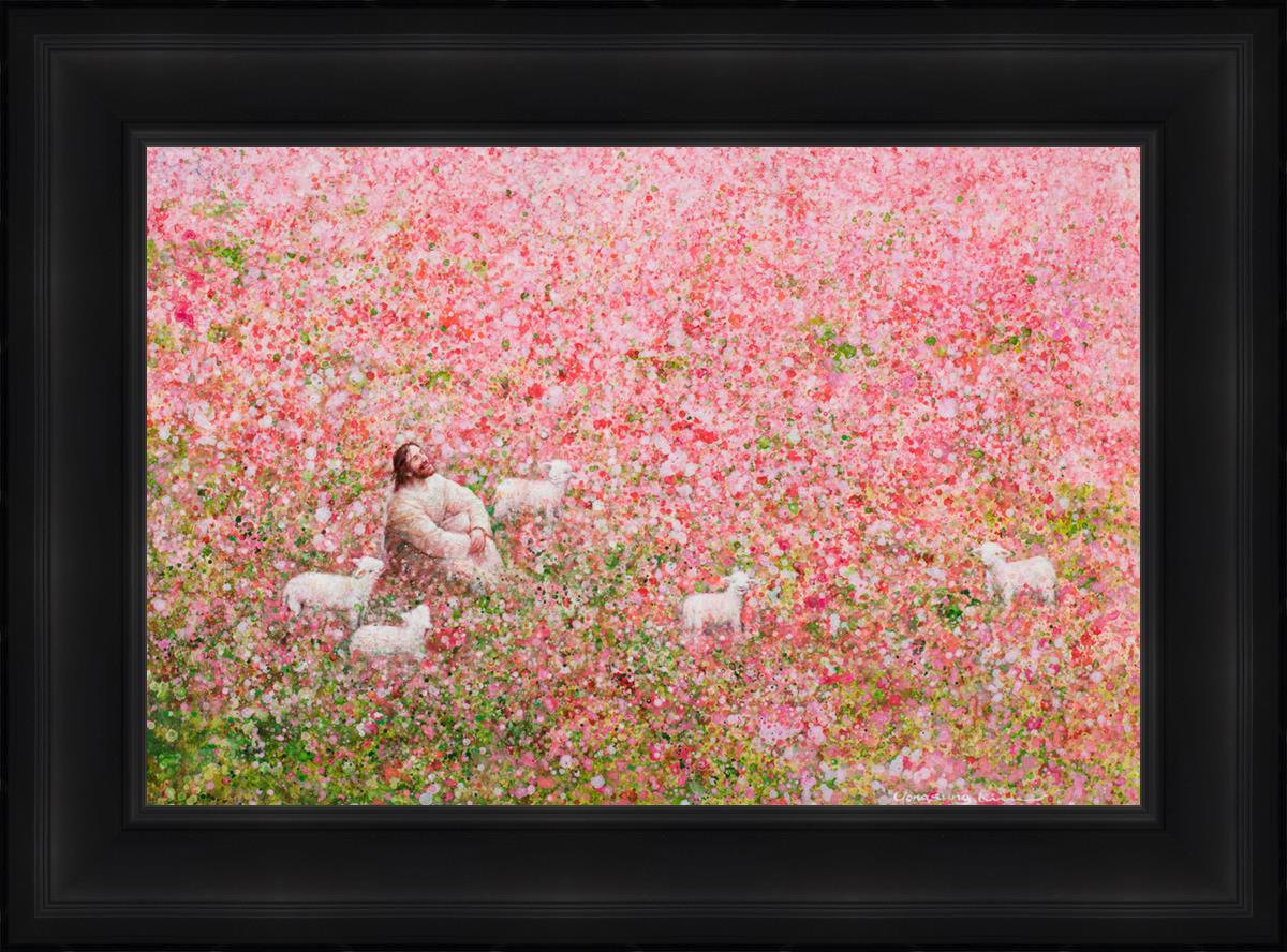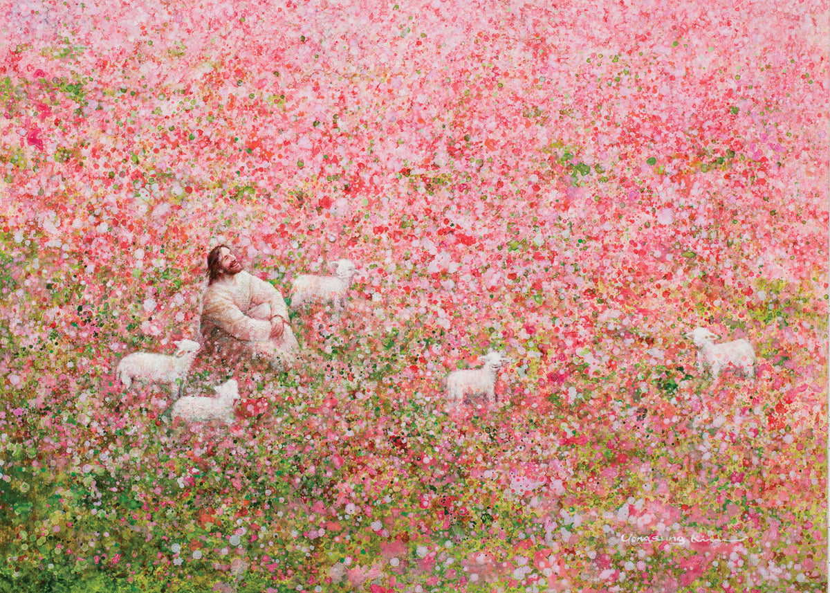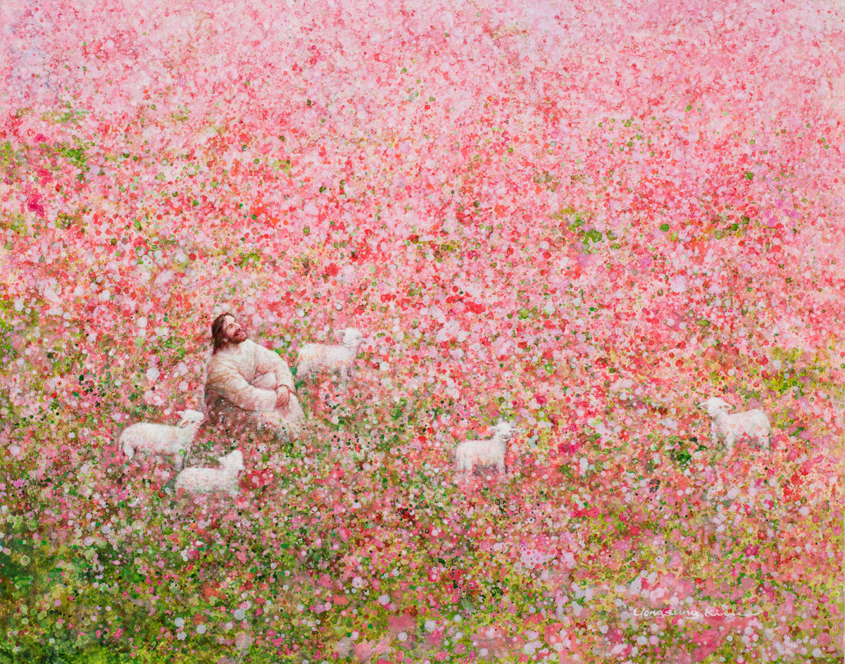 Shepherd's Rest by Yongsung Kim shows Jesus sitting down with His face lifted towards heaven in a field of pink flowers surrounded by lambs. This painting is available in print and canvas.