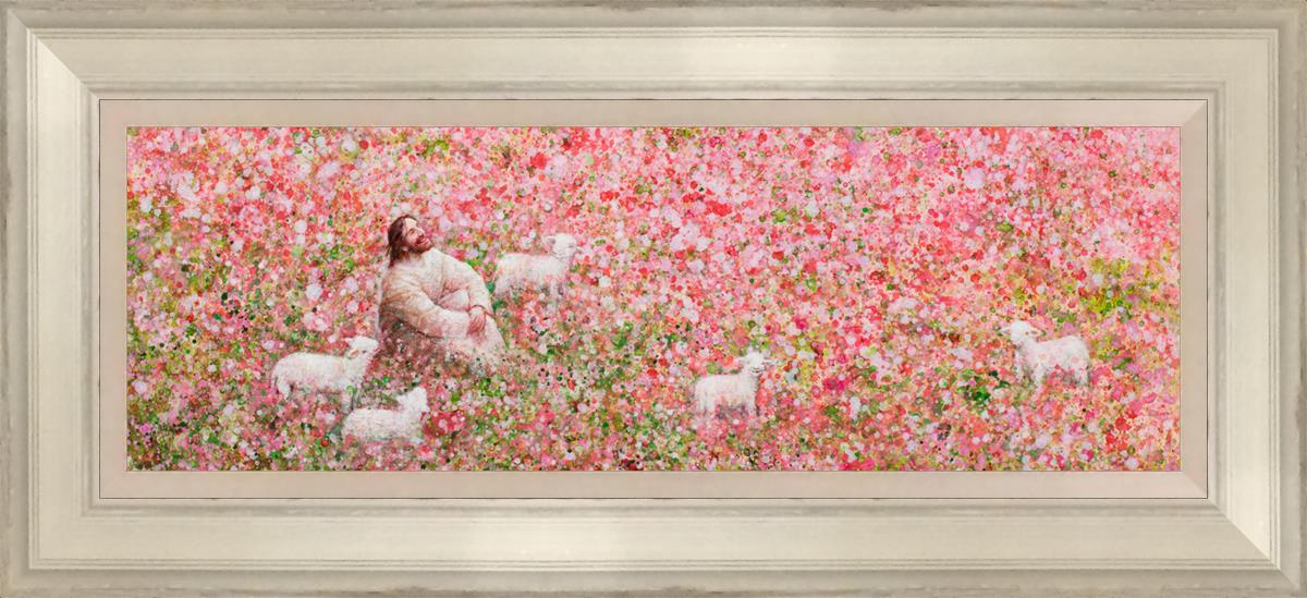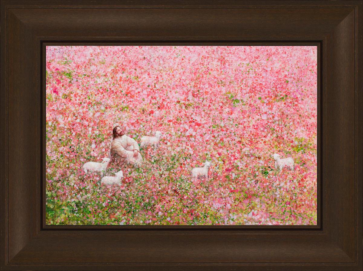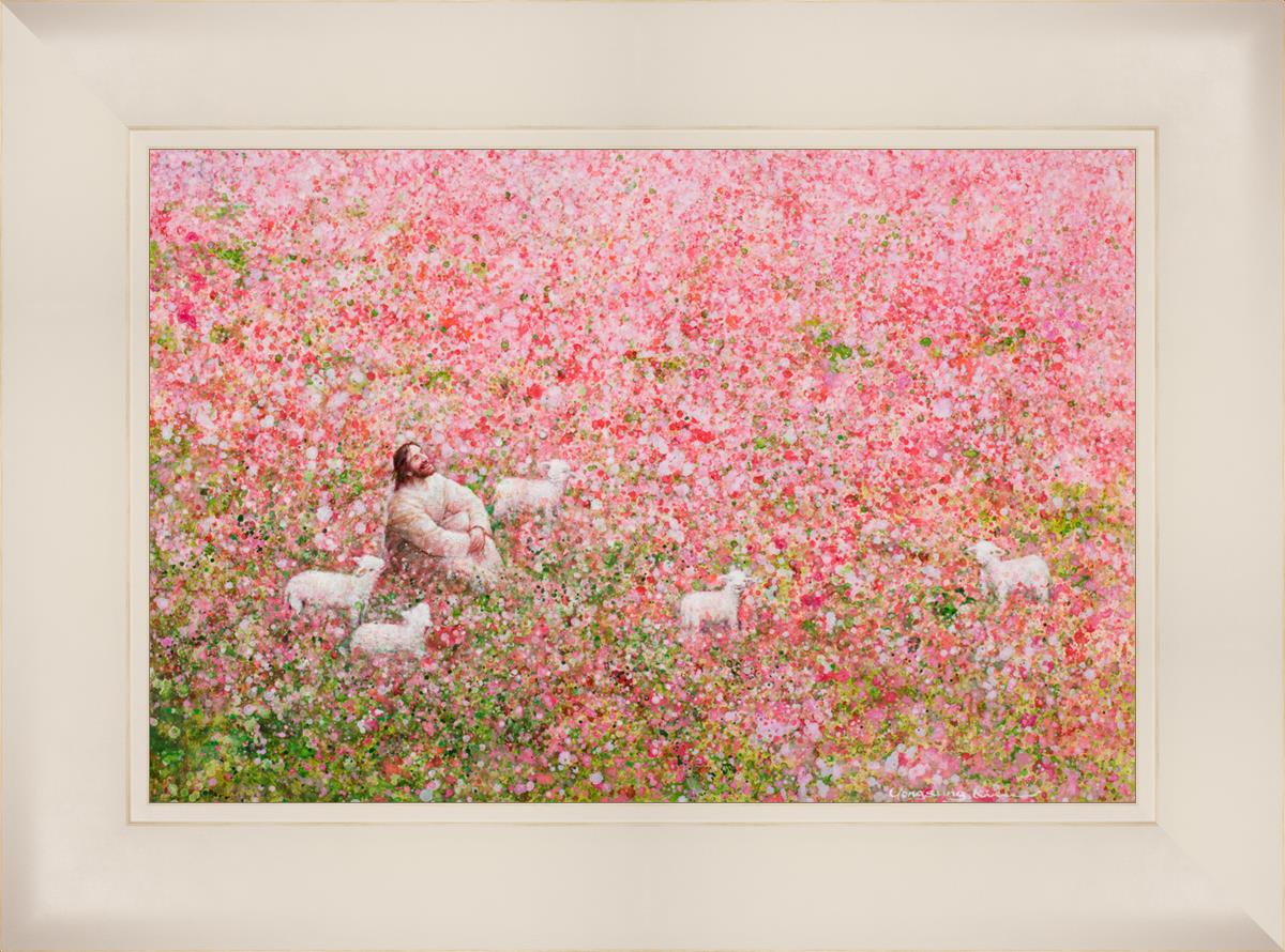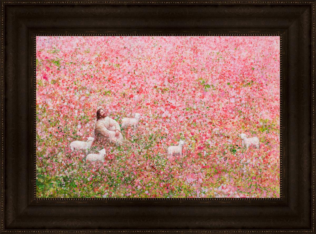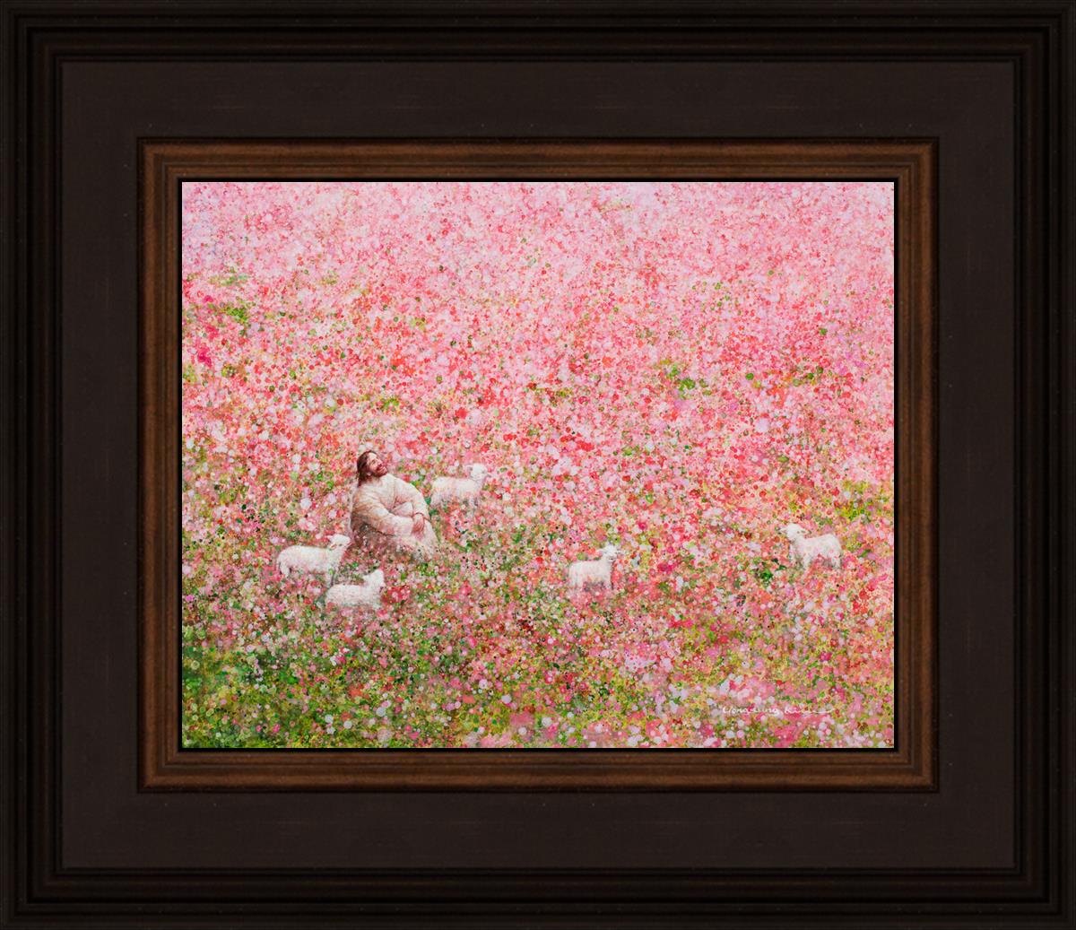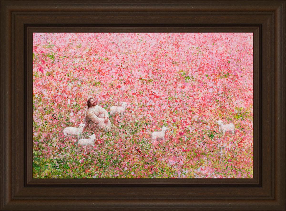 Shepherd's Rest by Yongsung Kim shows Jesus sitting down with His face lifted towards heaven in a field of pink flowers surrounded by lambs. This painting is available in print and canvas.