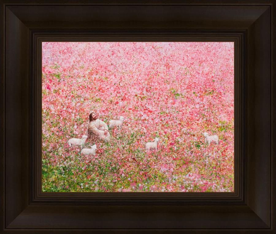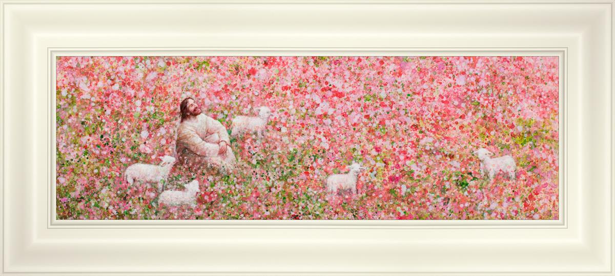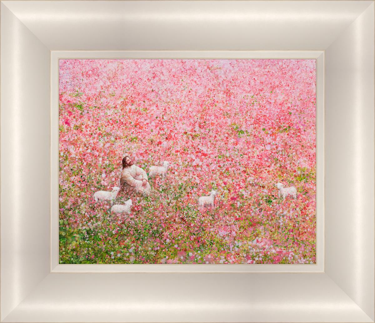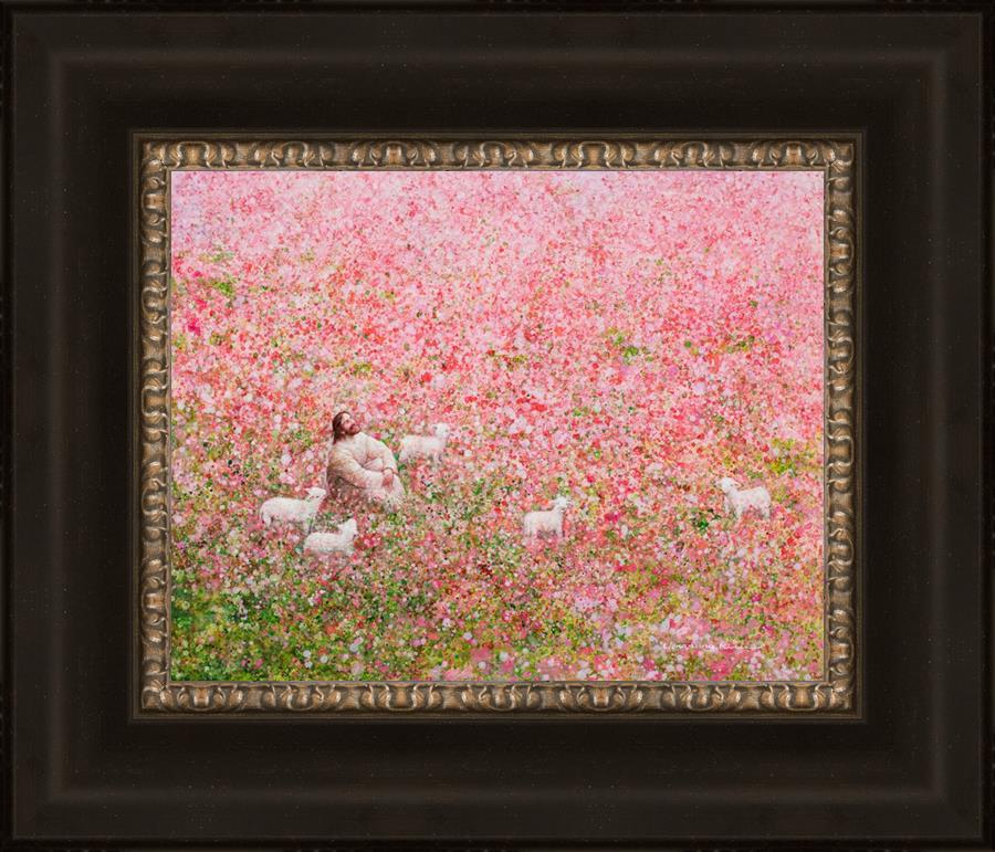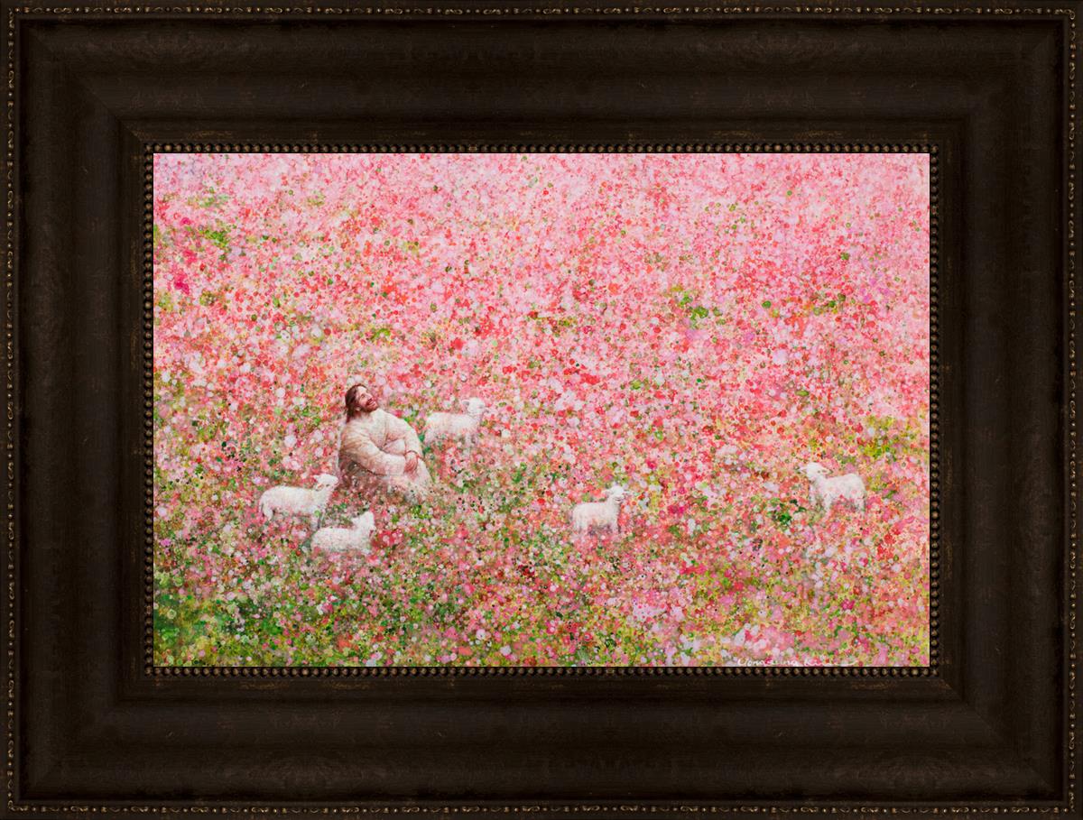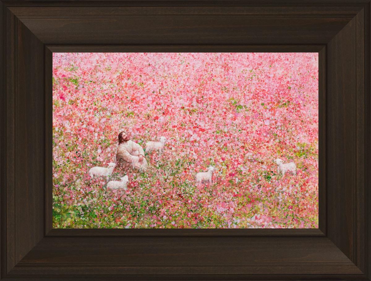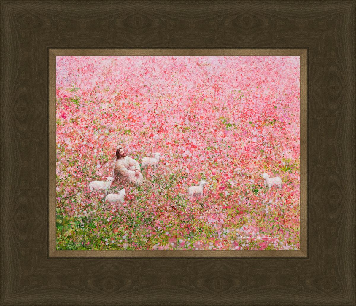 Shepherd's Rest by Yongsung Kim shows Jesus sitting down with His face lifted towards heaven in a field of pink flowers surrounded by lambs. This painting is available in print and canvas.