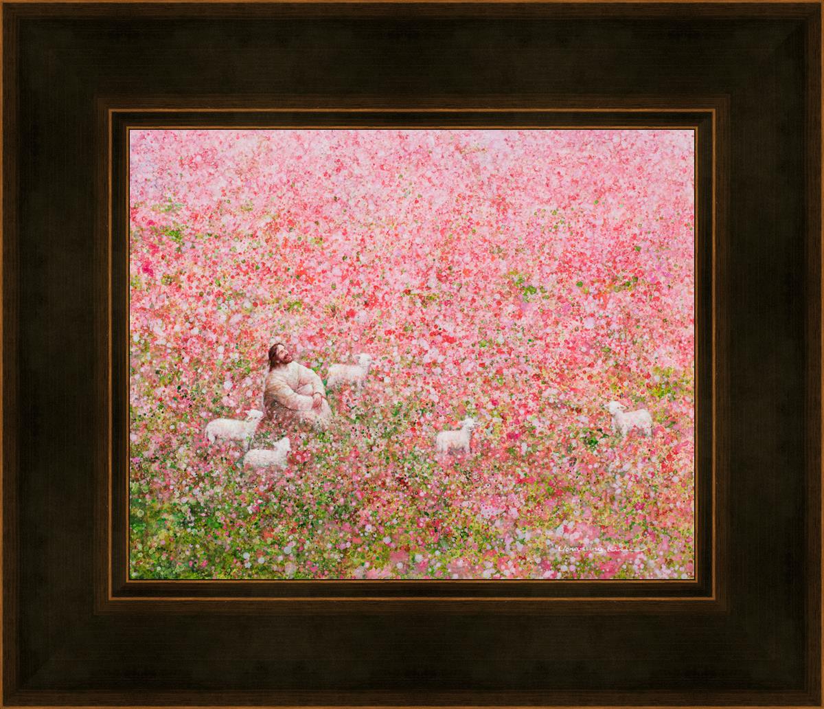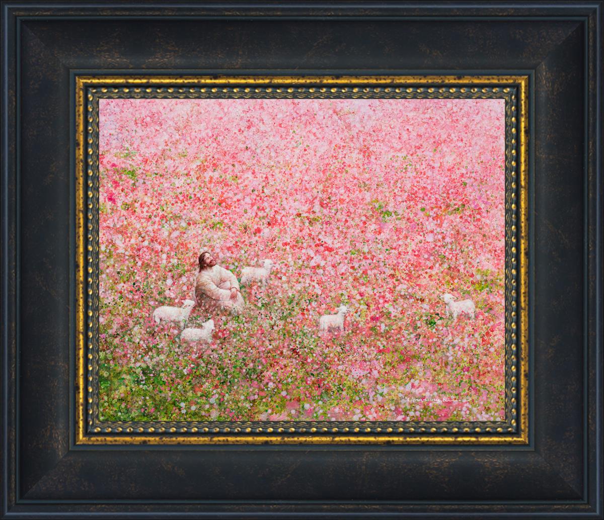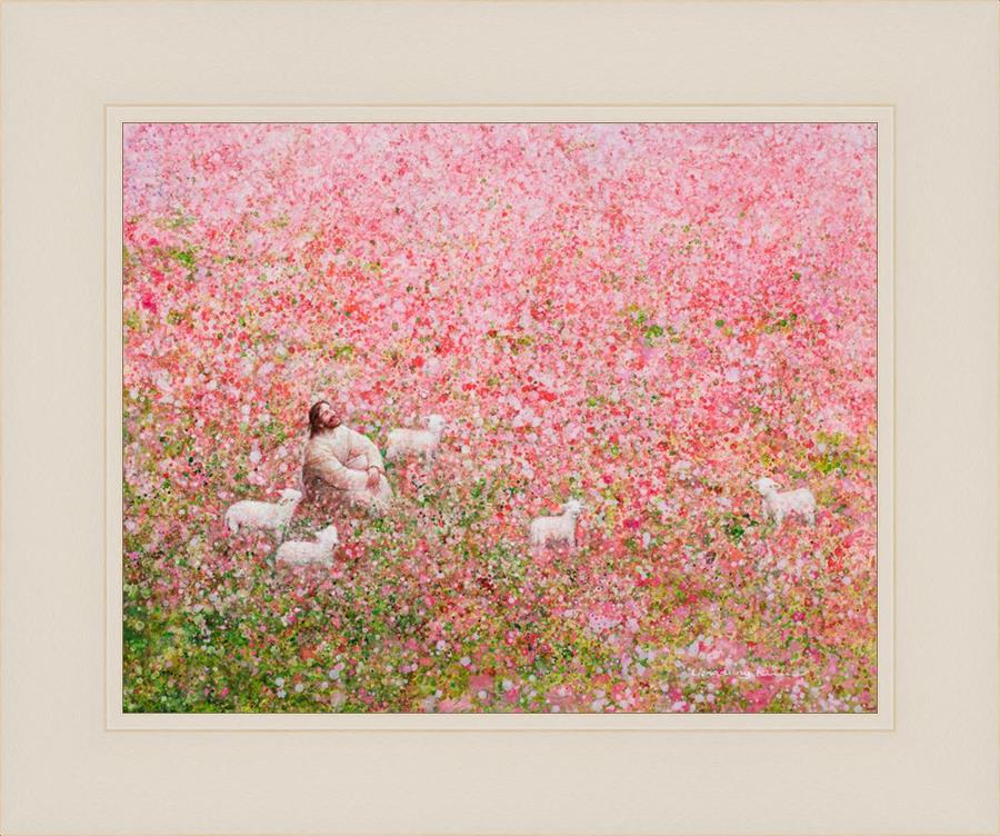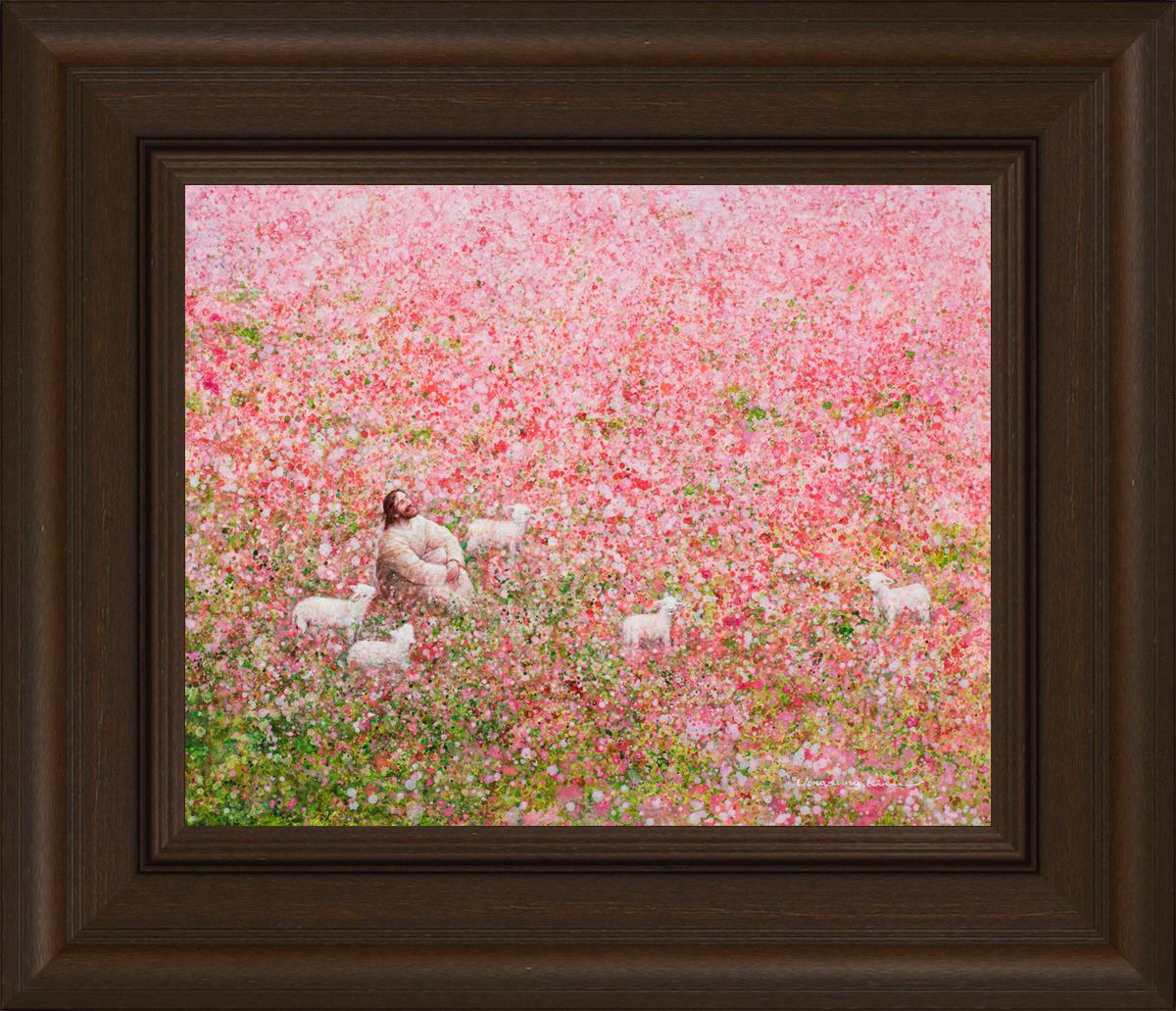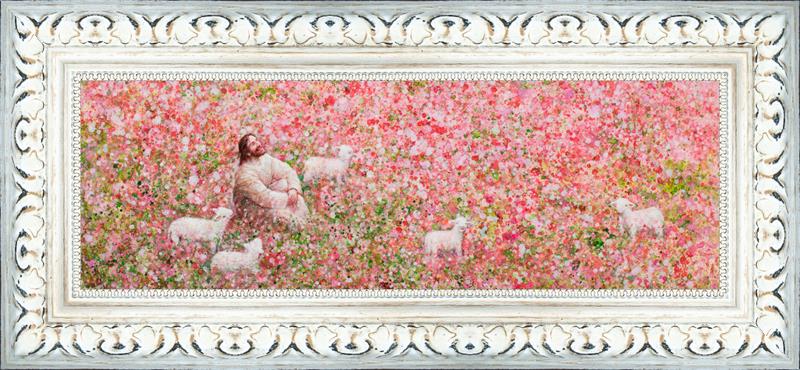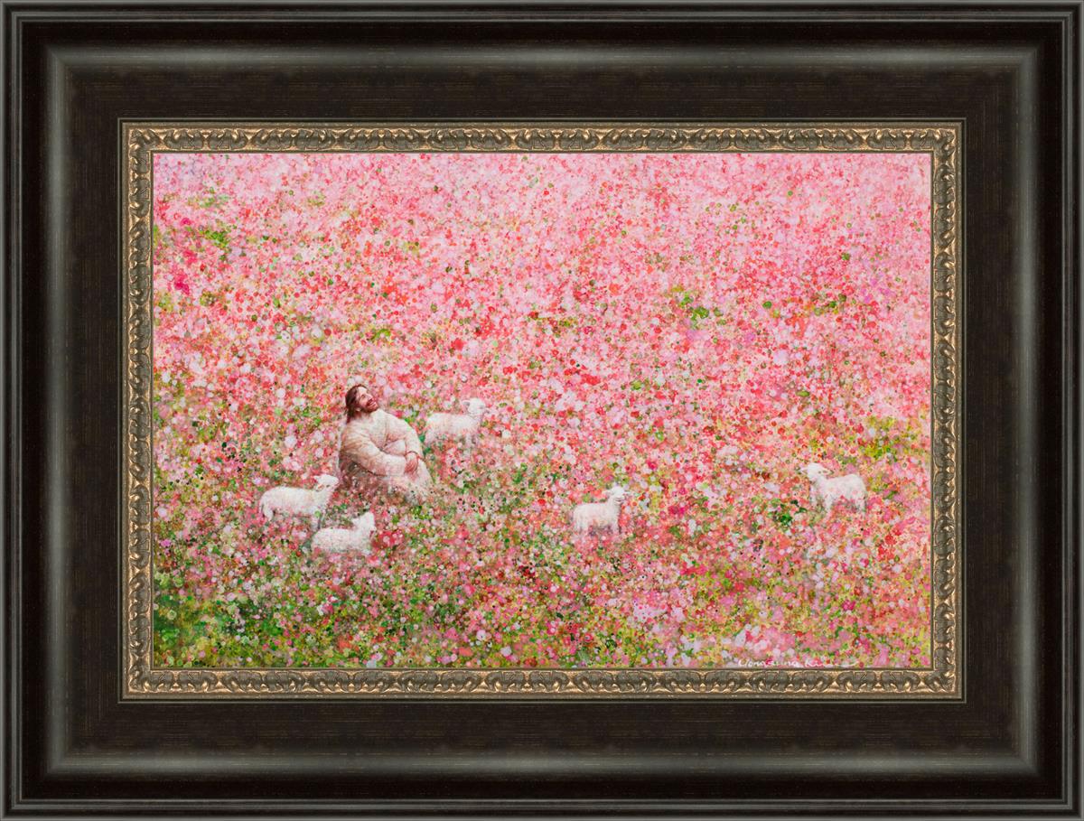 Shepherd's Rest by Yongsung Kim shows Jesus sitting down with His face lifted towards heaven in a field of pink flowers surrounded by lambs. This painting is available in print and canvas.