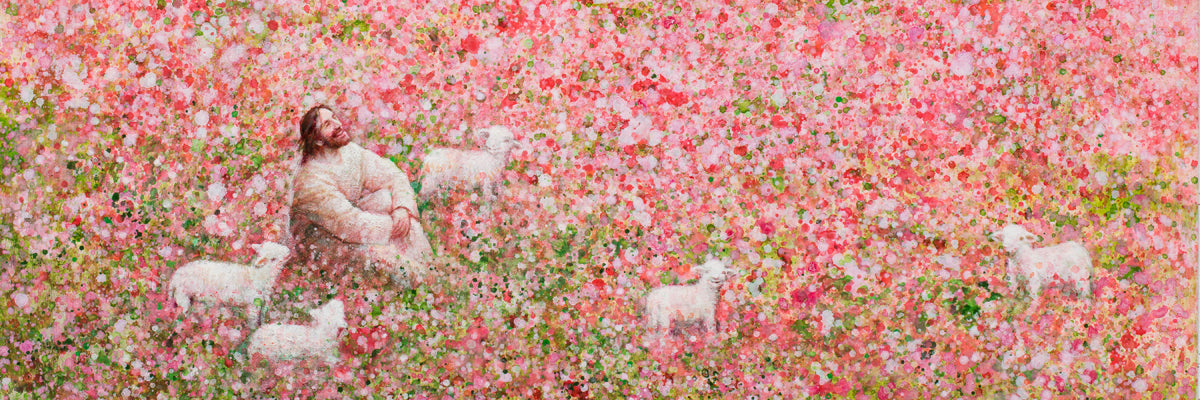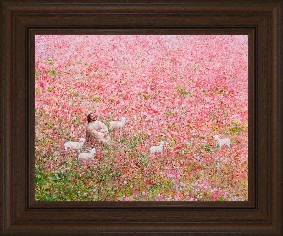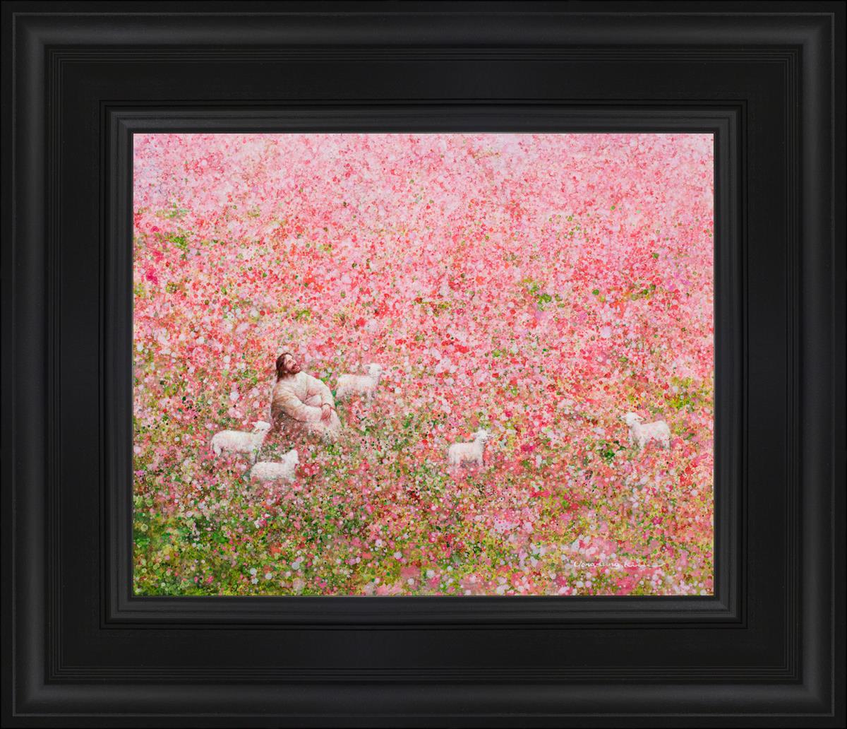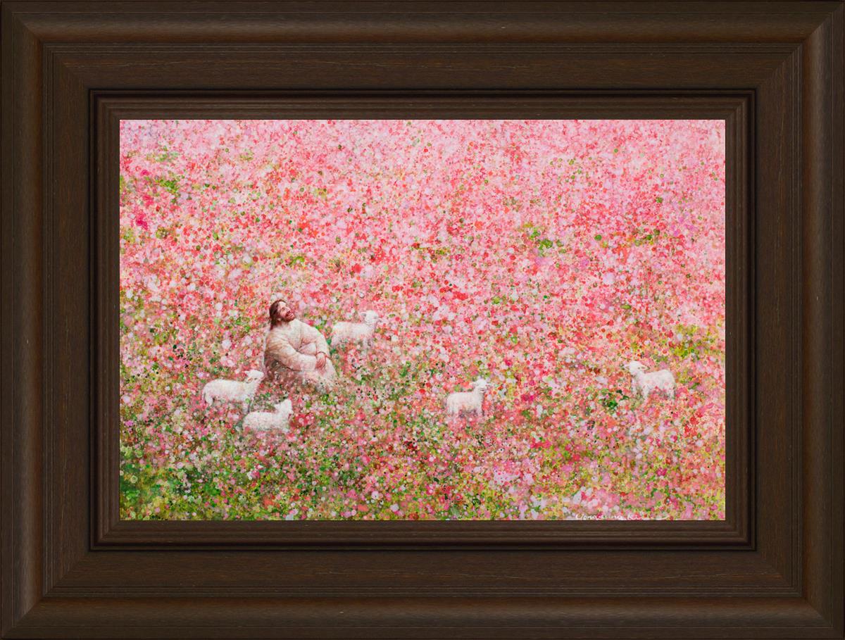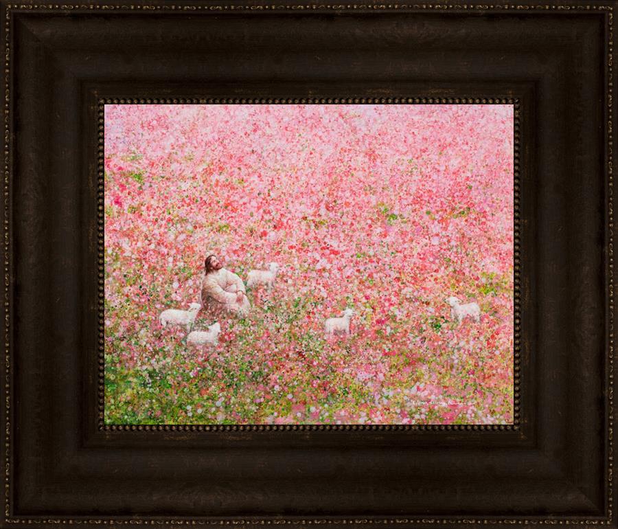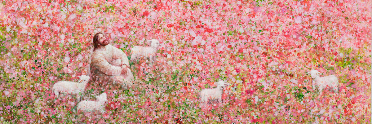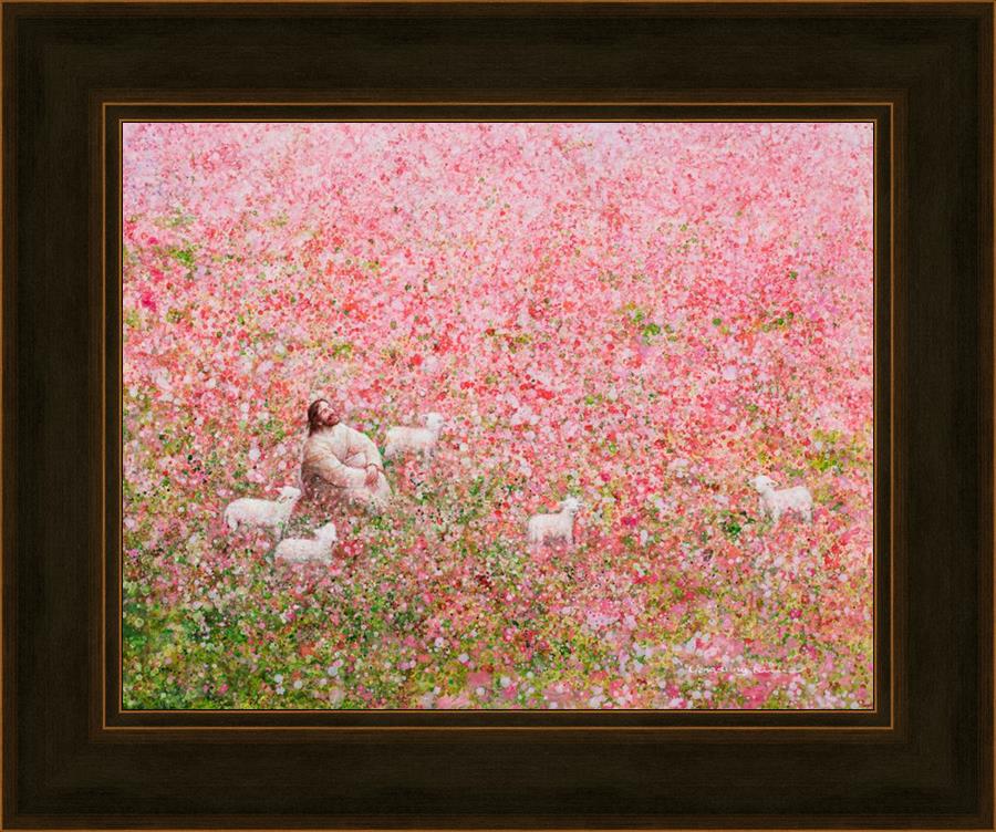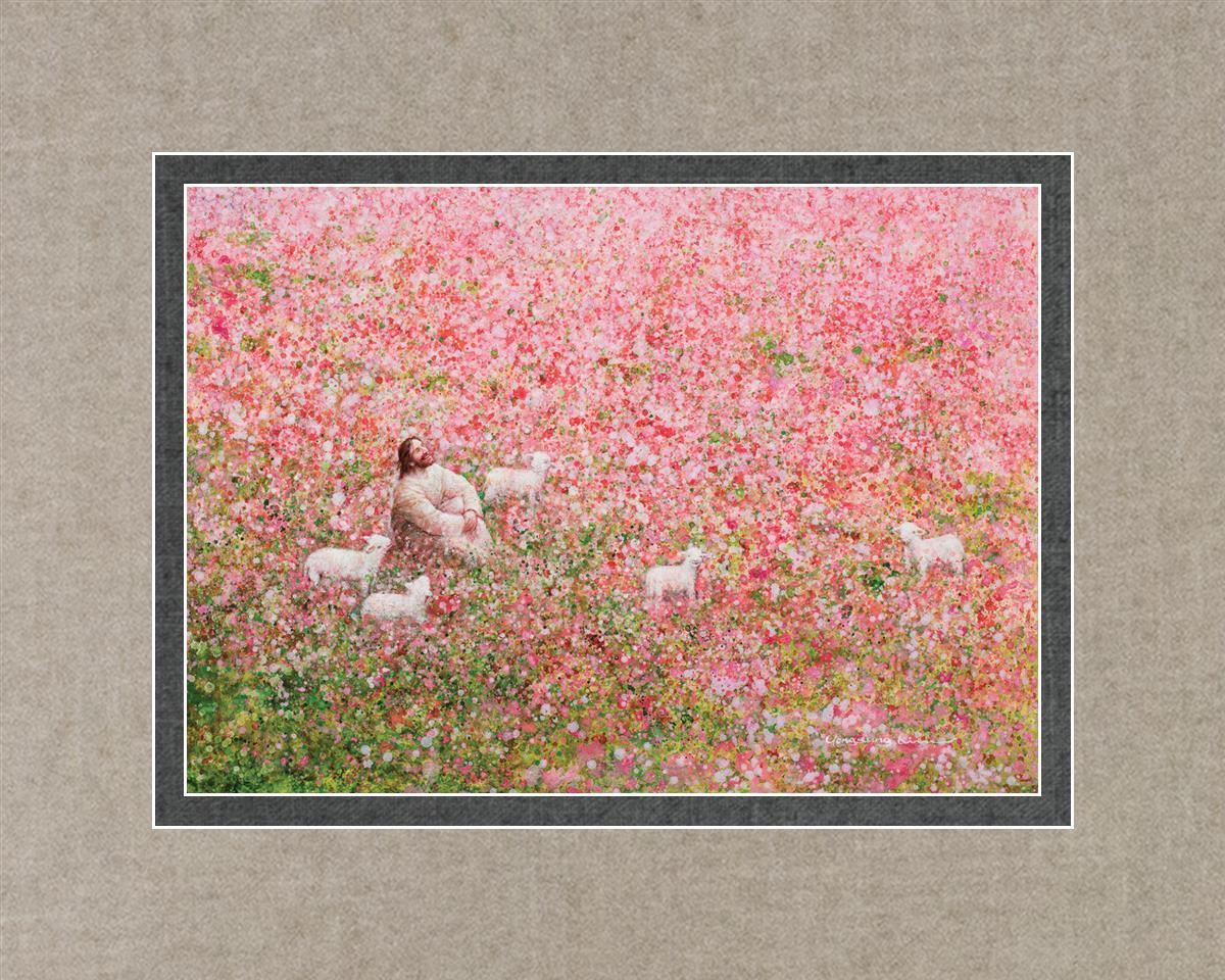 Shepherd's Rest by Yongsung Kim shows Jesus sitting down with His face lifted towards heaven in a field of pink flowers surrounded by lambs. This painting is available in print and canvas.