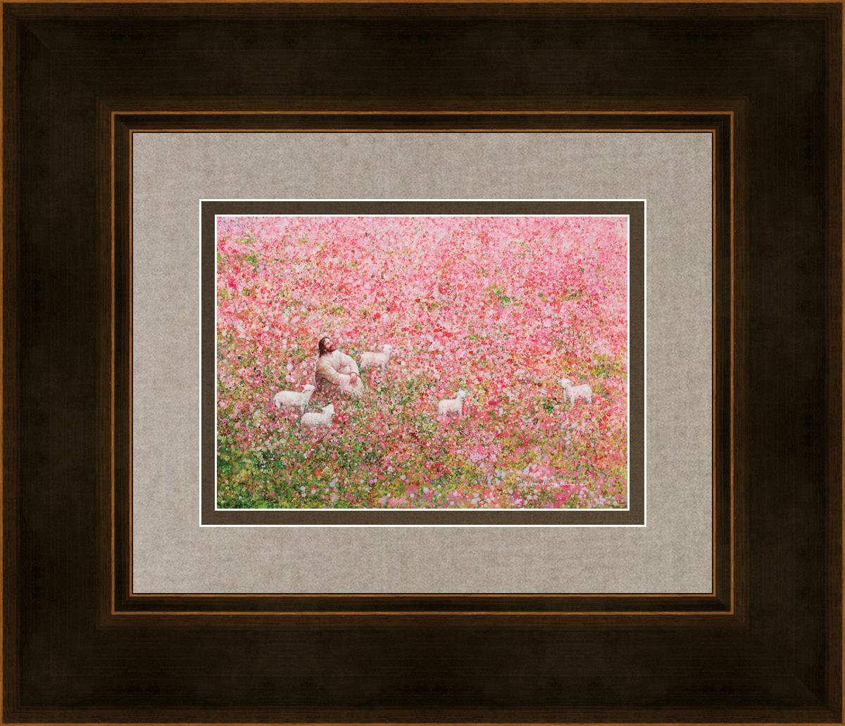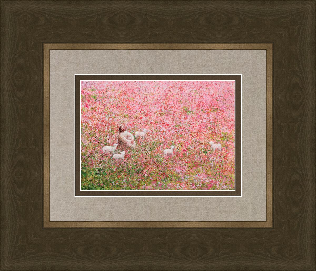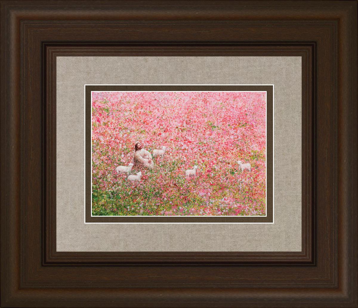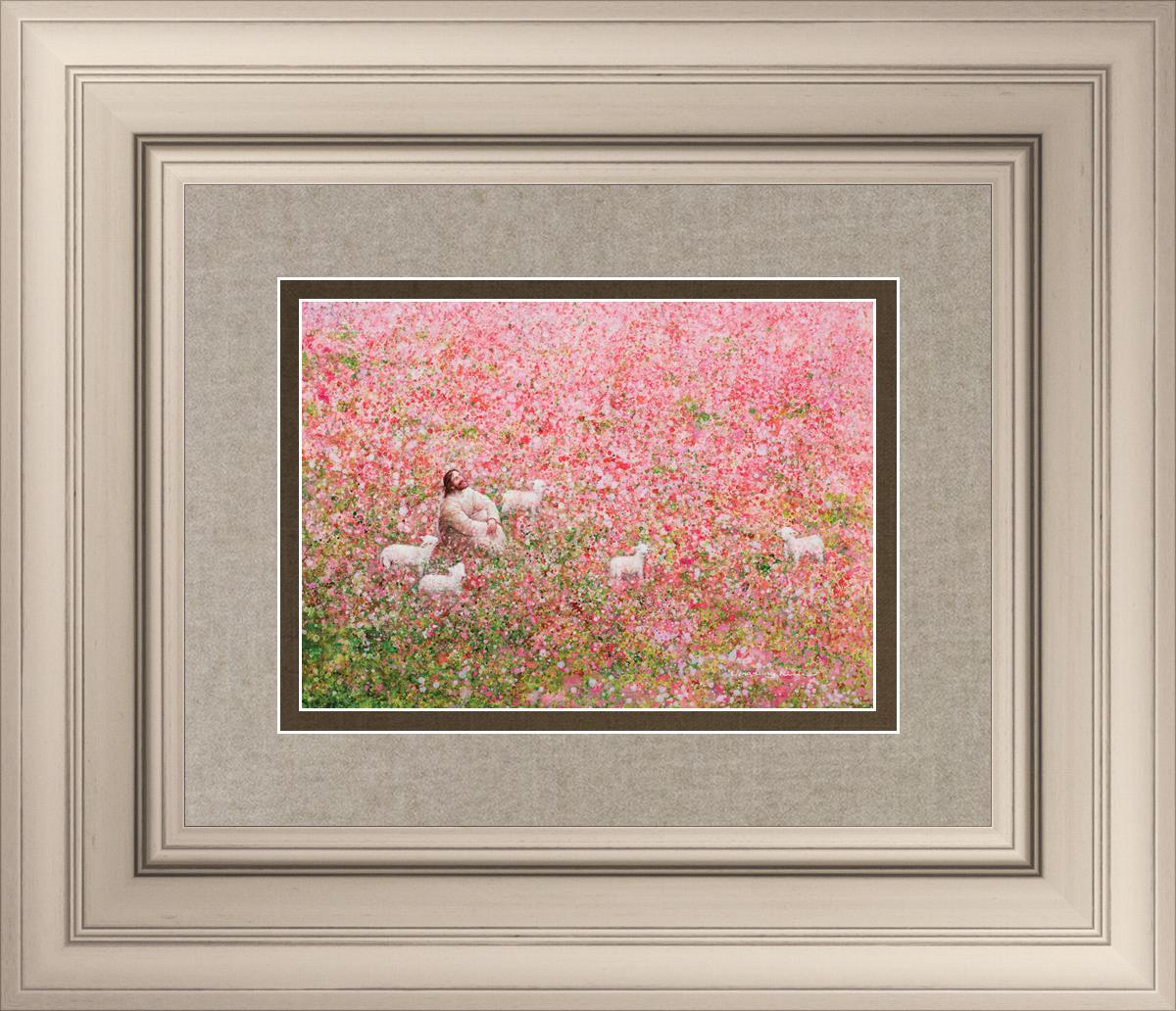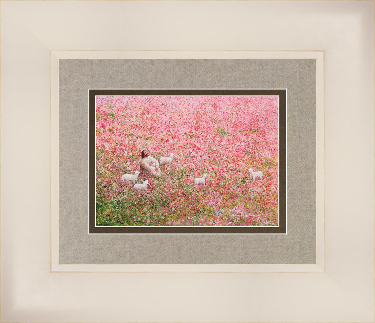 Shepherd's Rest by Yongsung Kim shows Jesus sitting down with His face lifted towards heaven in a field of pink flowers surrounded by lambs. This painting is available in print and canvas.