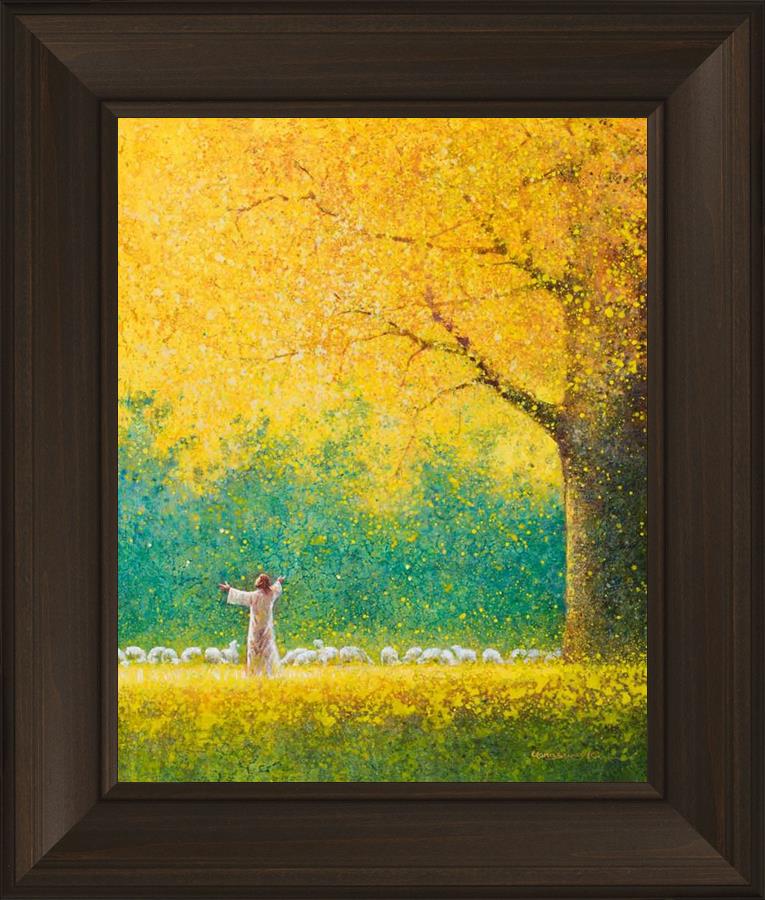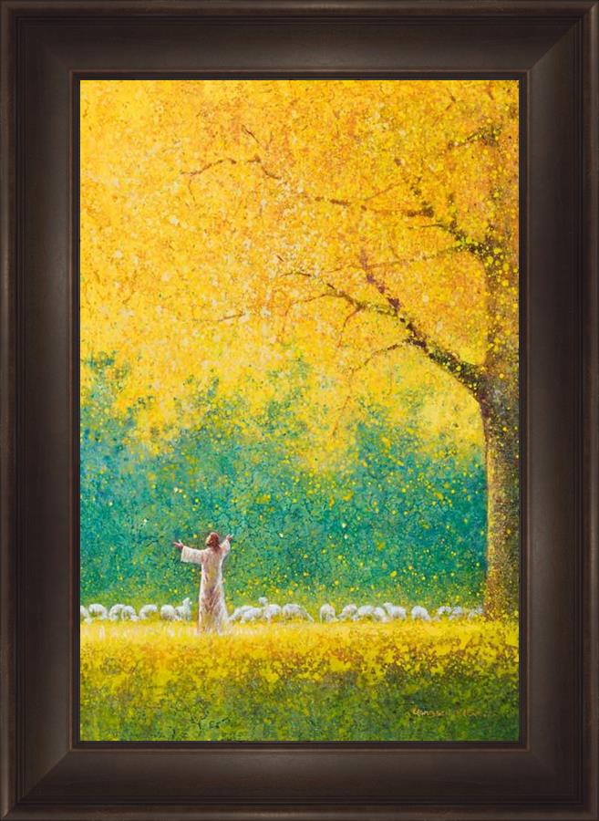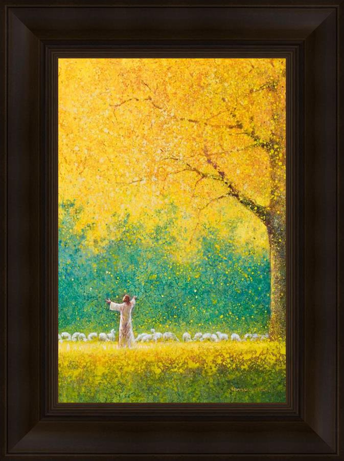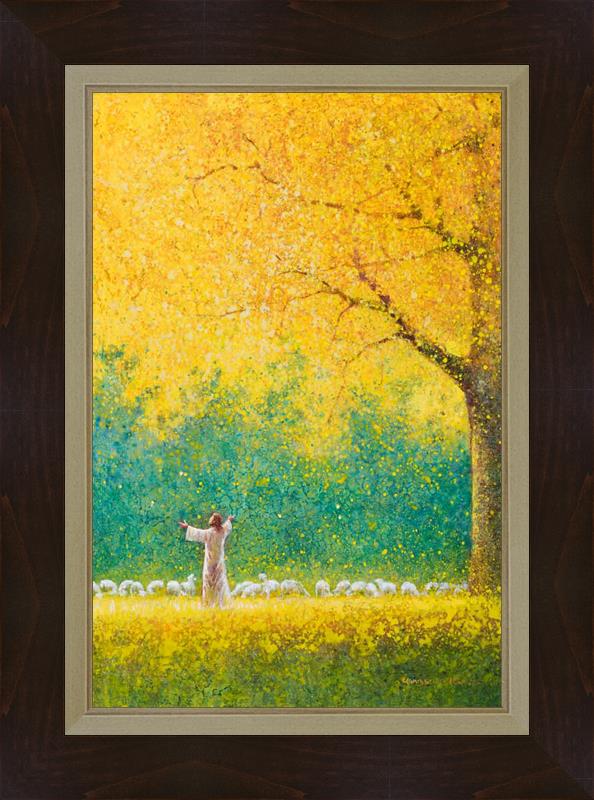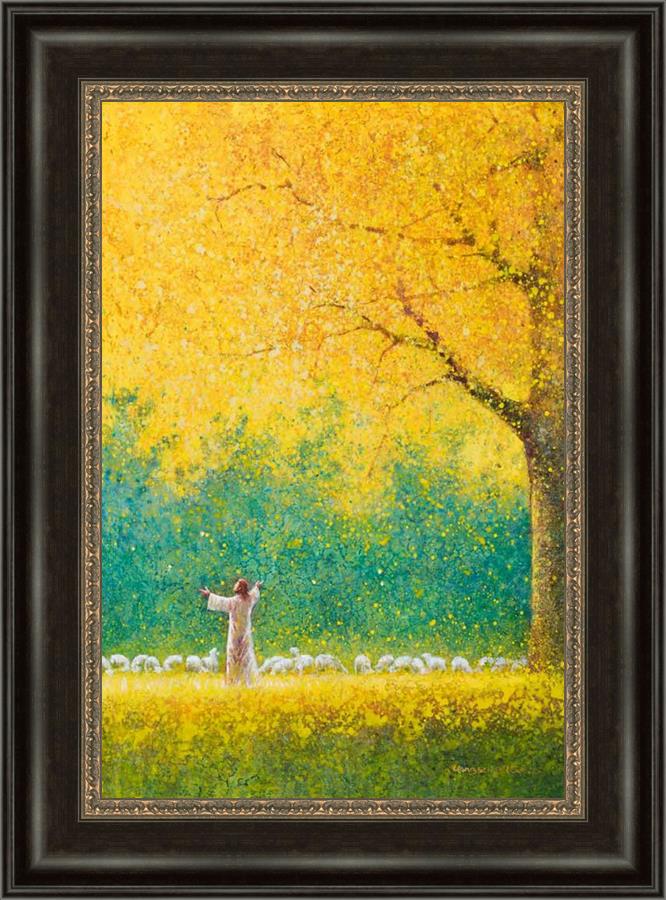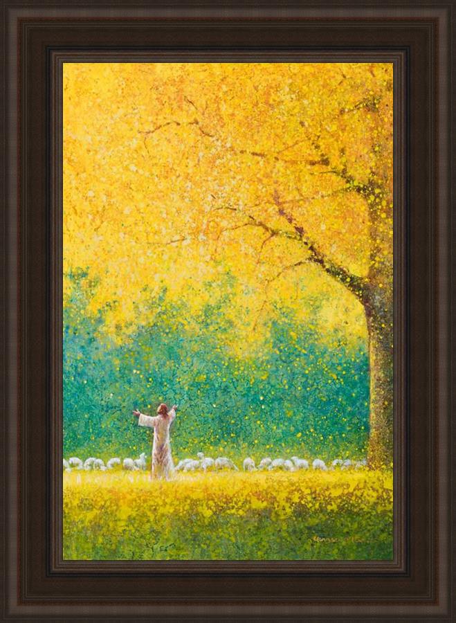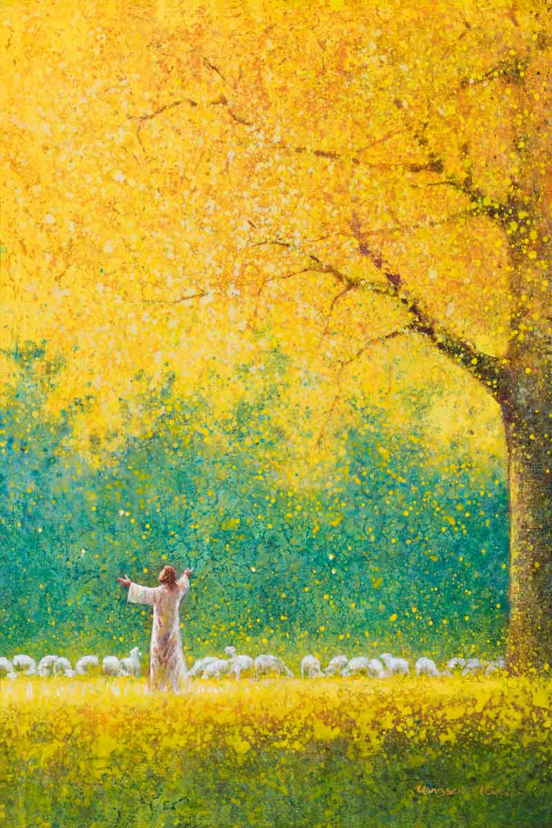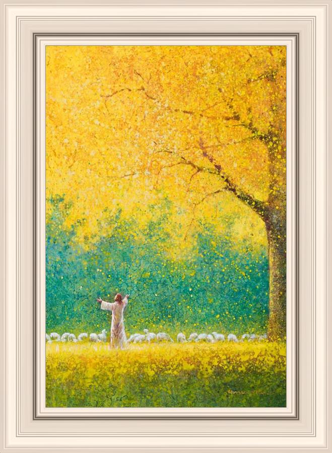 Sunshine In My Soul by Yongsung Kim depicts Jesus in a field with autumn leaves on the ground and outstretched hands standing under a tree with yellow leaves and a flock of sheep by Him. This painting is available in print and canvas.