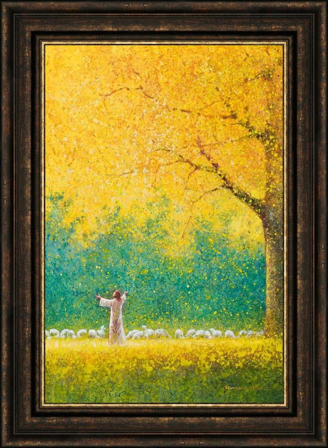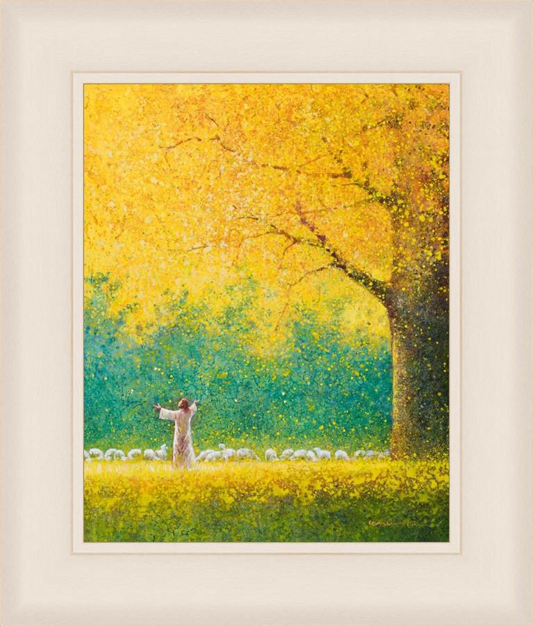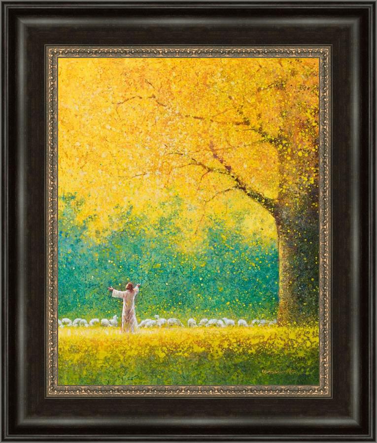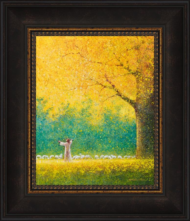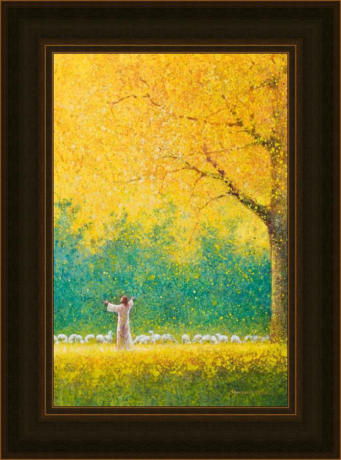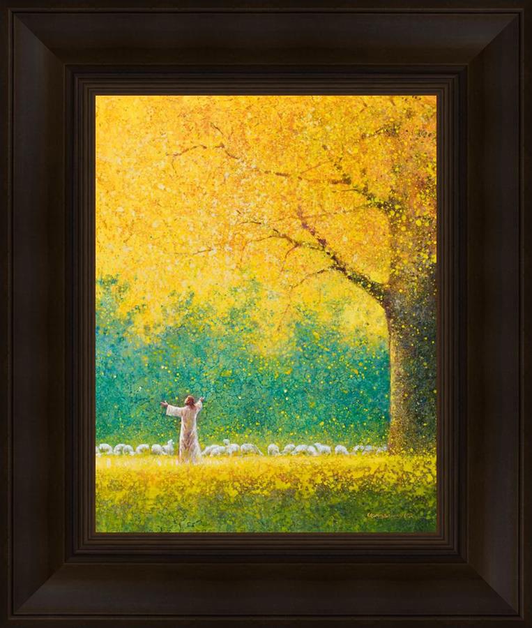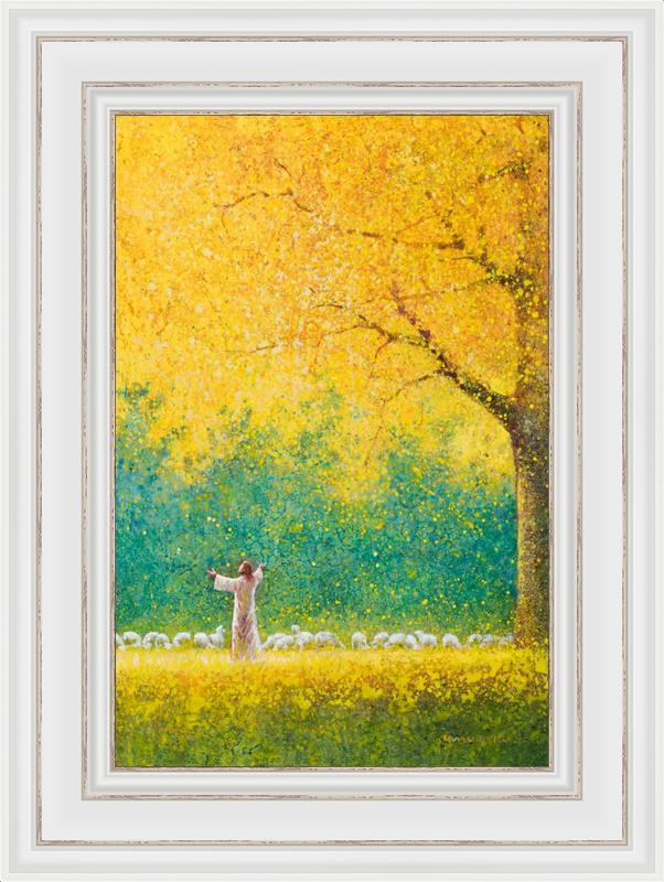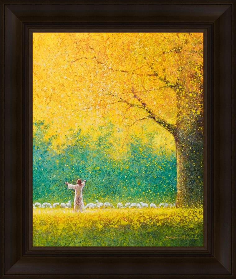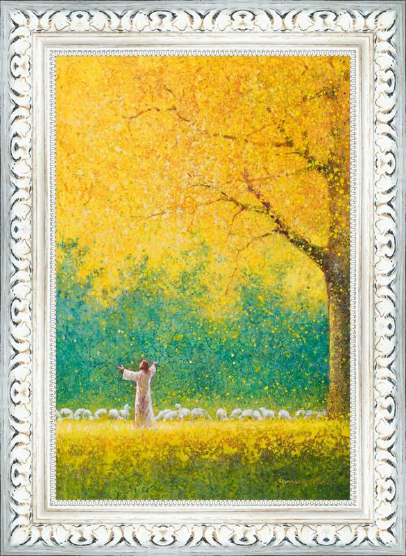 Sunshine In My Soul by Yongsung Kim depicts Jesus in a field with autumn leaves on the ground and outstretched hands standing under a tree with yellow leaves and a flock of sheep by Him. This painting is available in print and canvas.