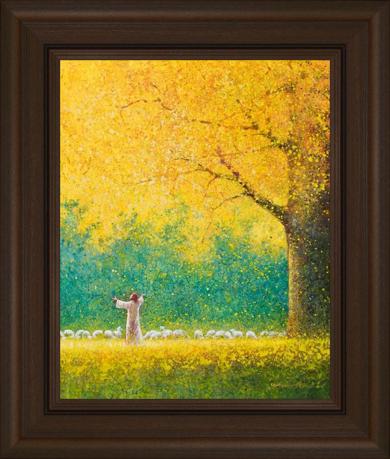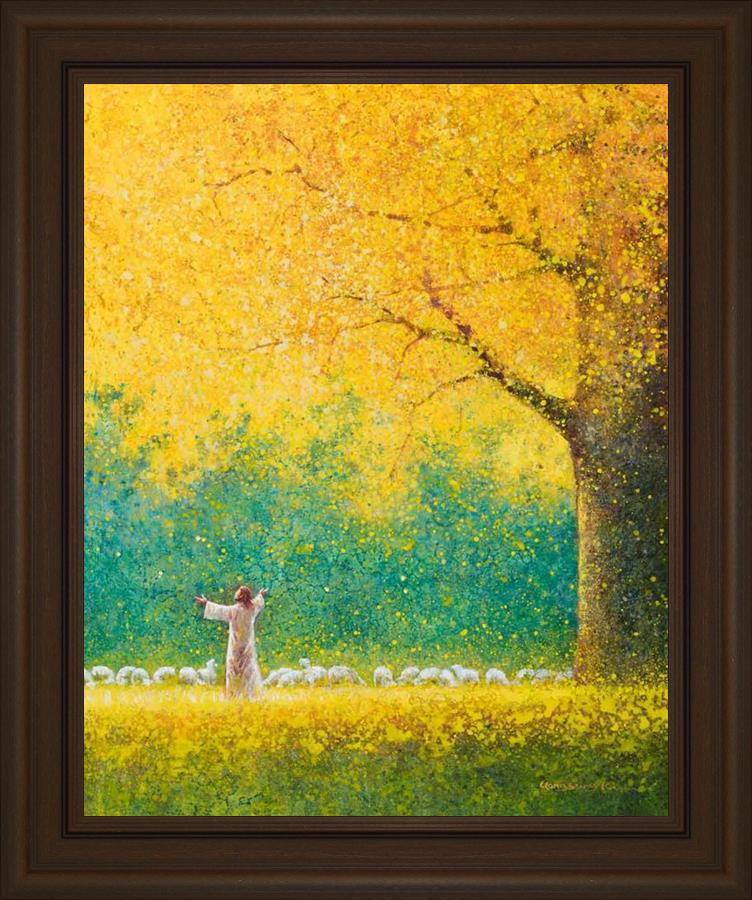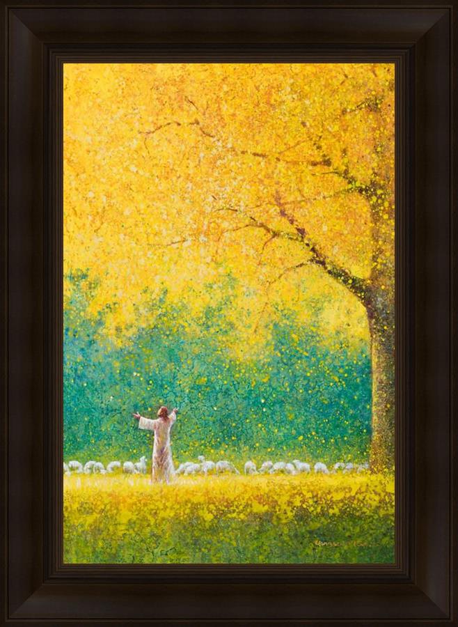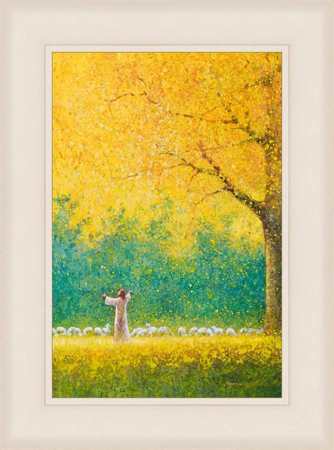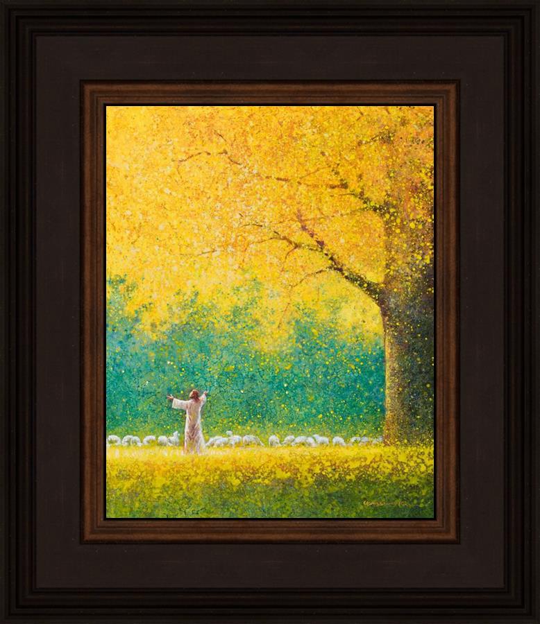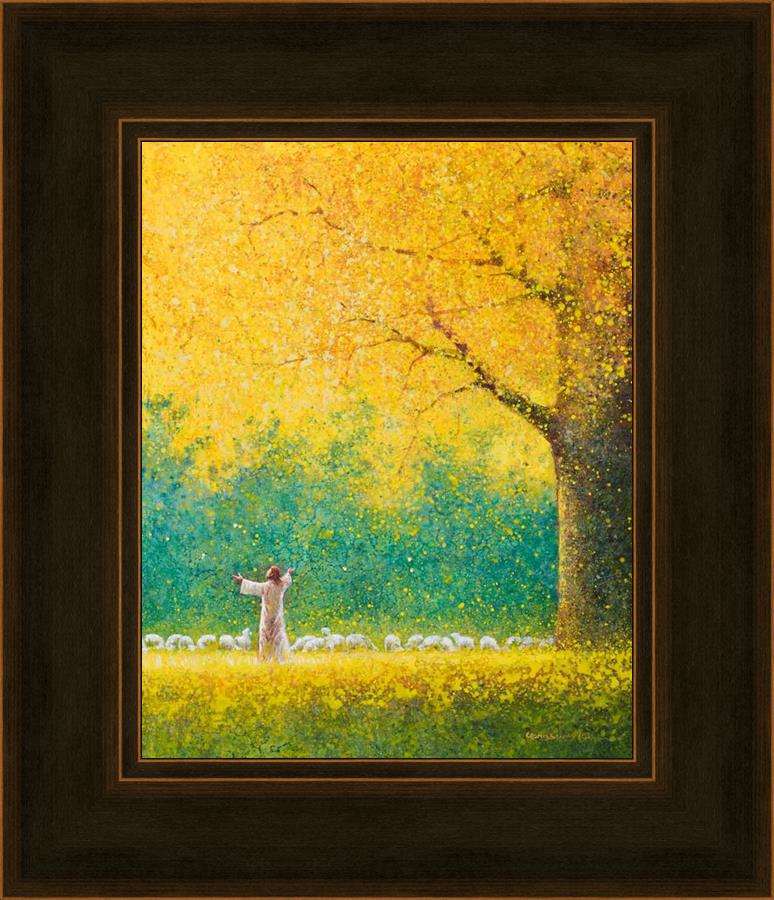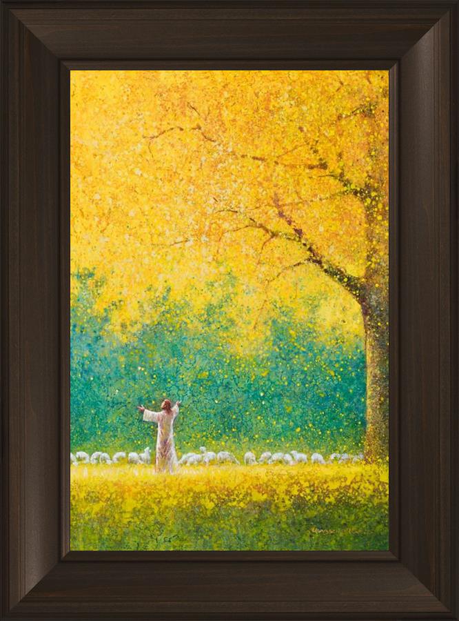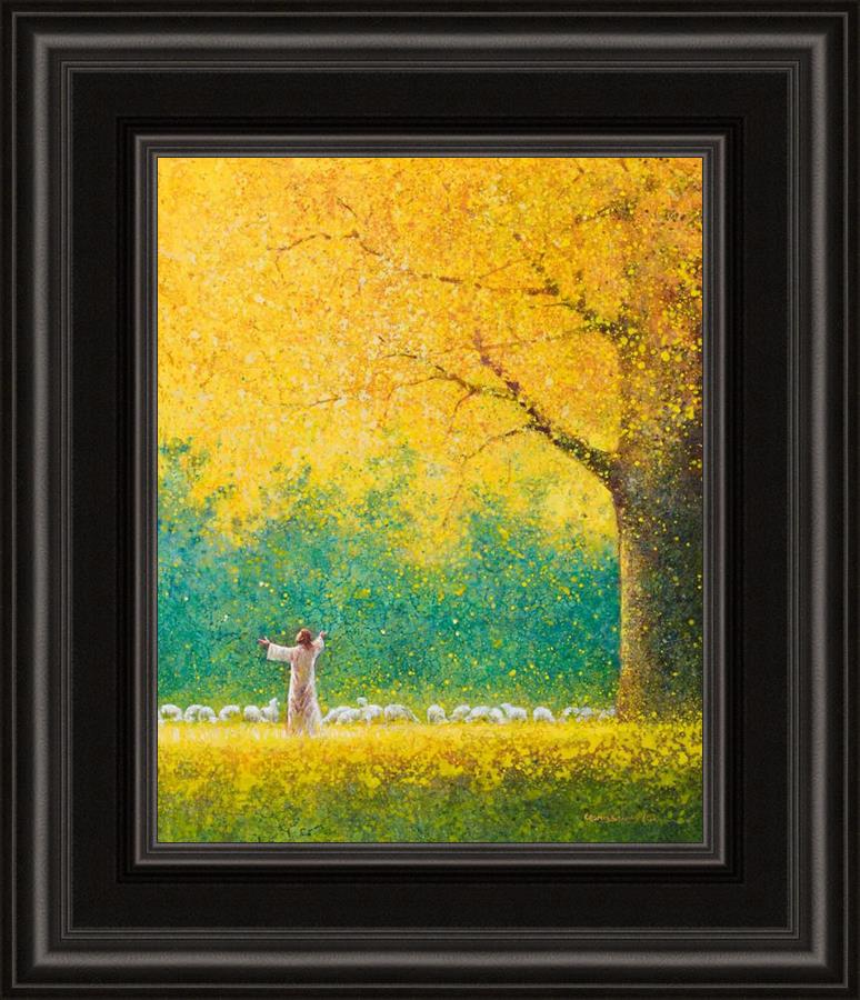 Sunshine In My Soul by Yongsung Kim depicts Jesus in a field with autumn leaves on the ground and outstretched hands standing under a tree with yellow leaves and a flock of sheep by Him. This painting is available in print and canvas.