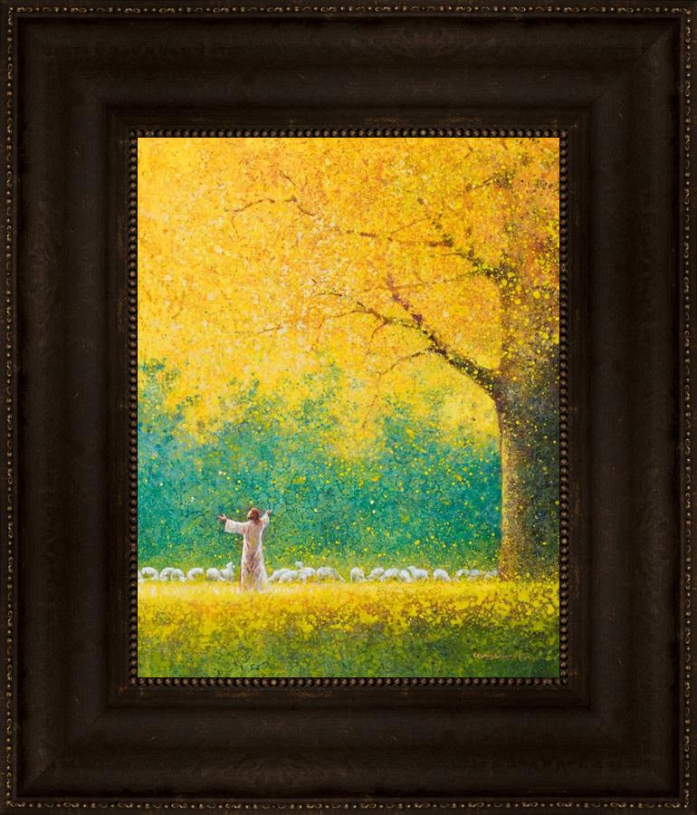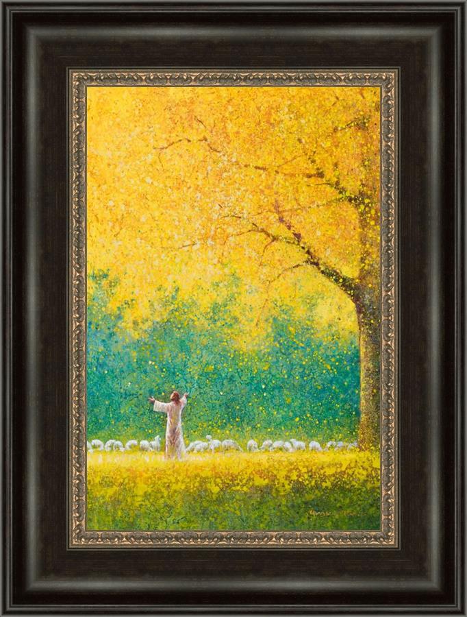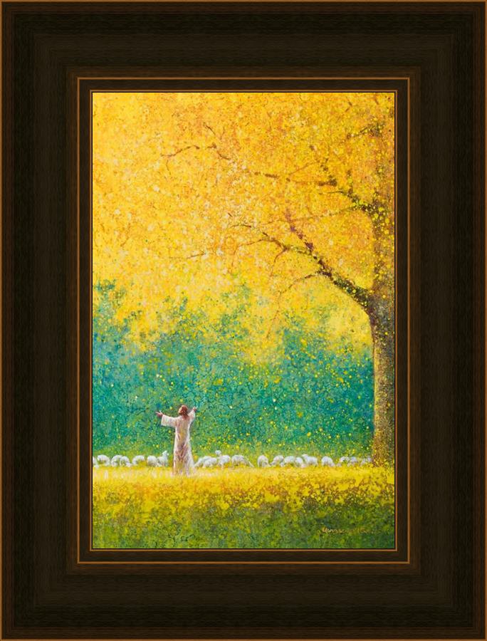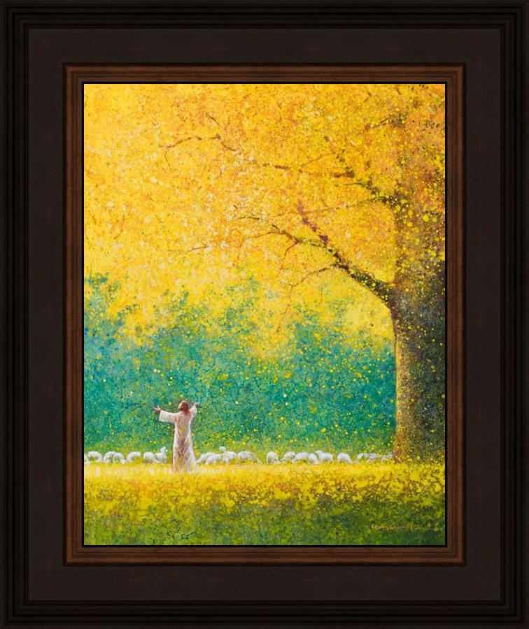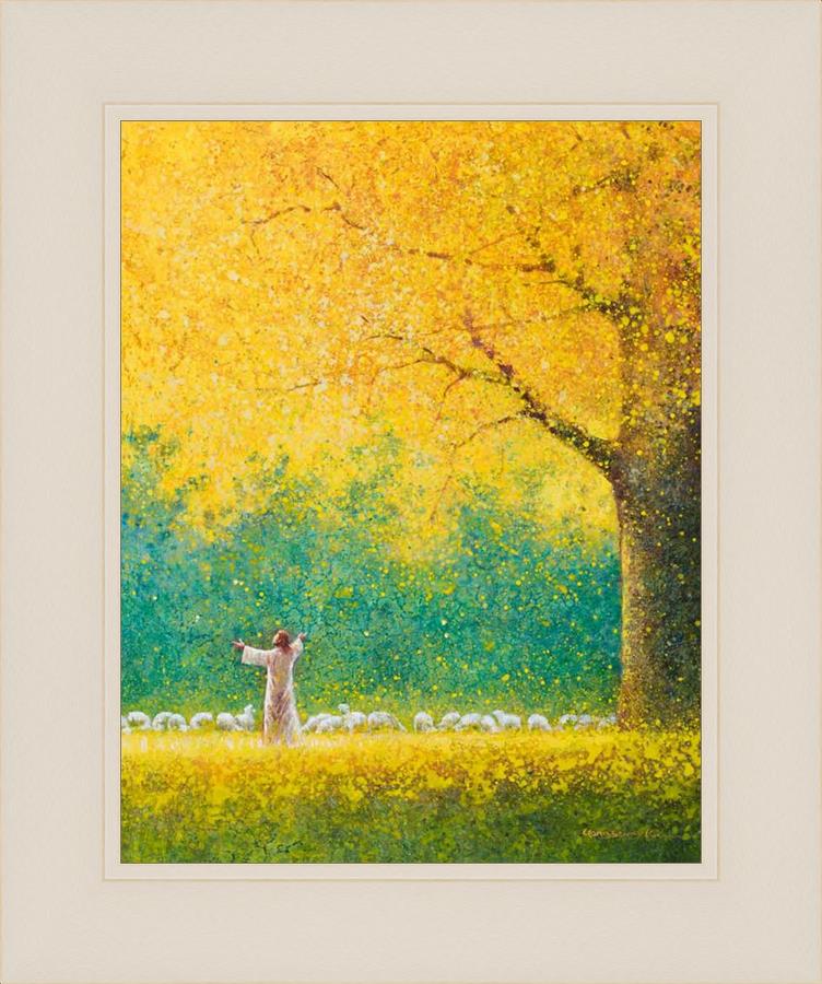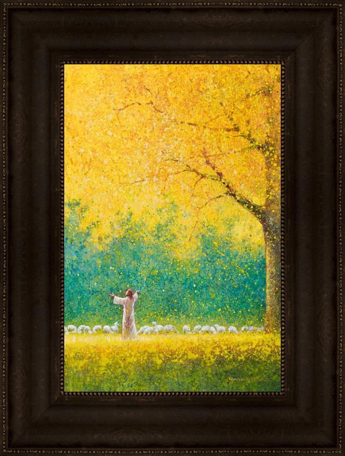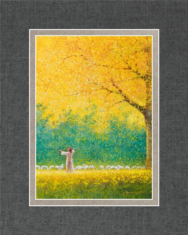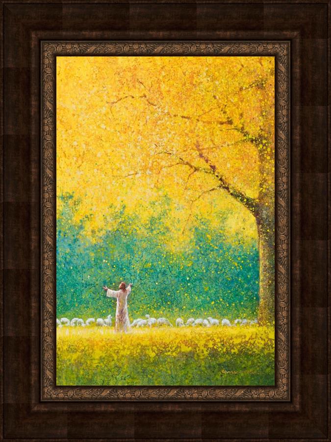 Sunshine In My Soul by Yongsung Kim depicts Jesus in a field with autumn leaves on the ground and outstretched hands standing under a tree with yellow leaves and a flock of sheep by Him. This painting is available in print and canvas.