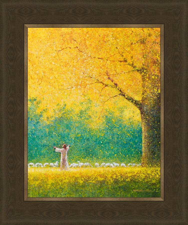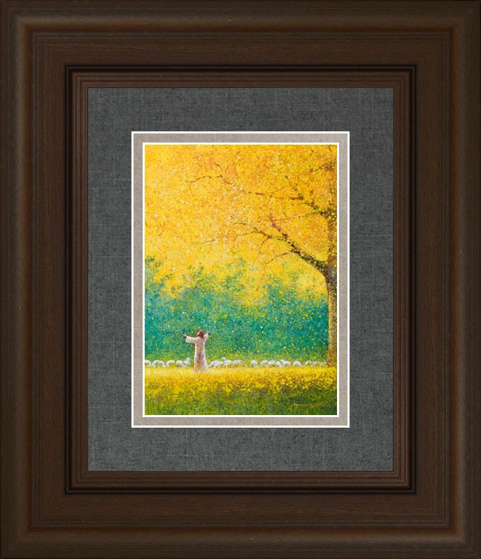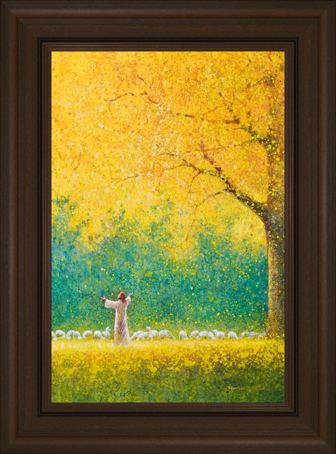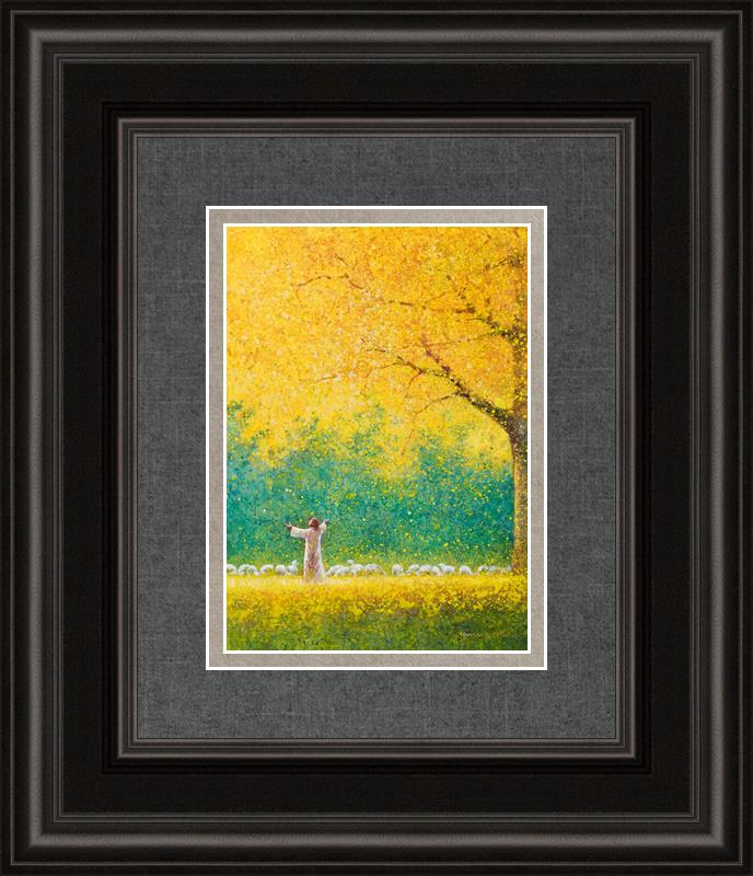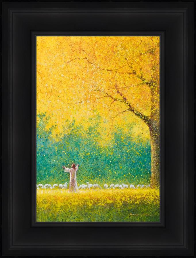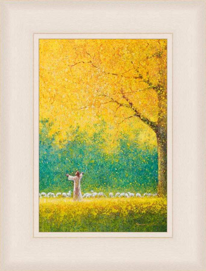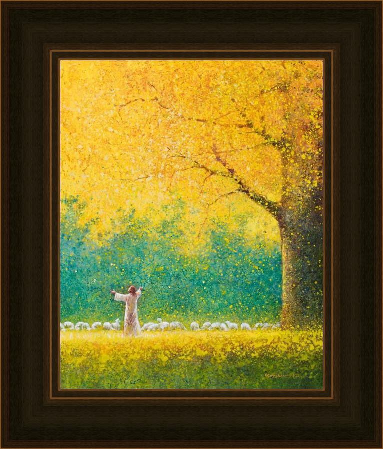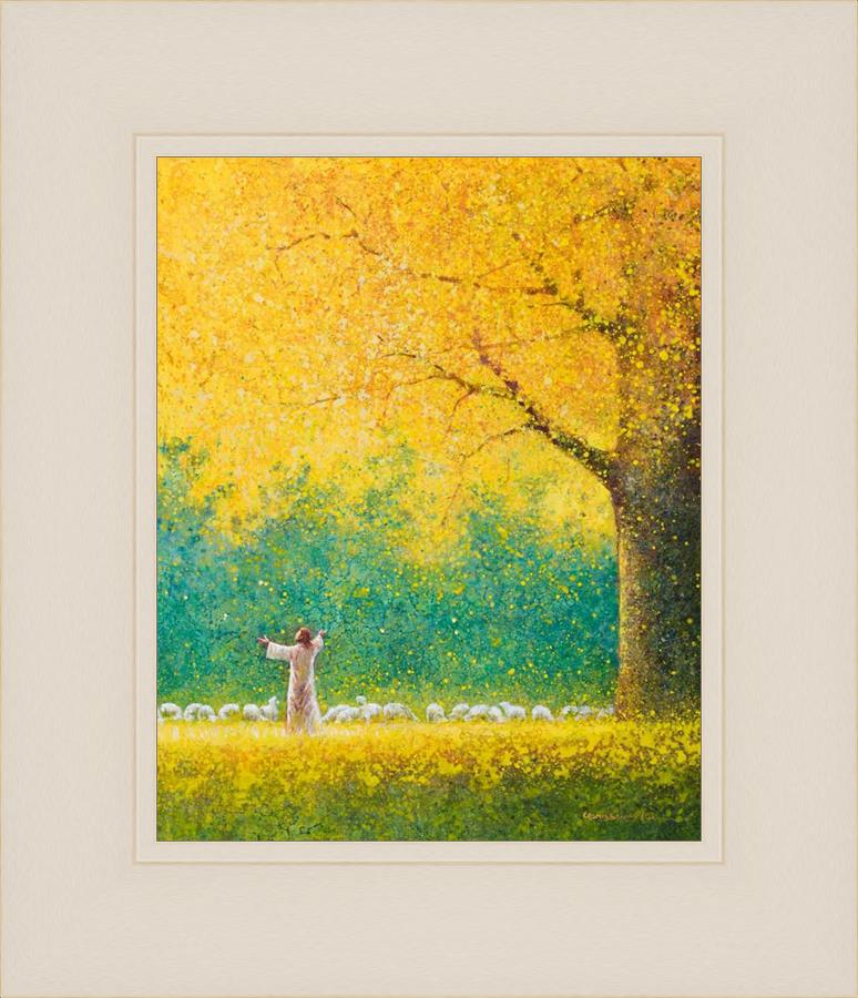 Sunshine In My Soul by Yongsung Kim depicts Jesus in a field with autumn leaves on the ground and outstretched hands standing under a tree with yellow leaves and a flock of sheep by Him. This painting is available in print and canvas.