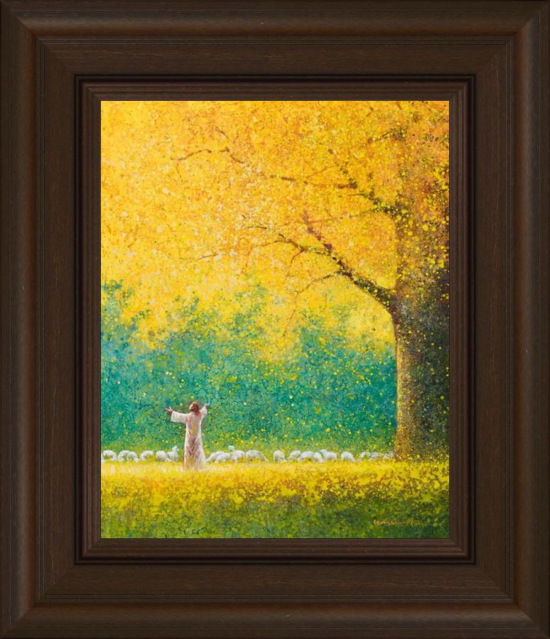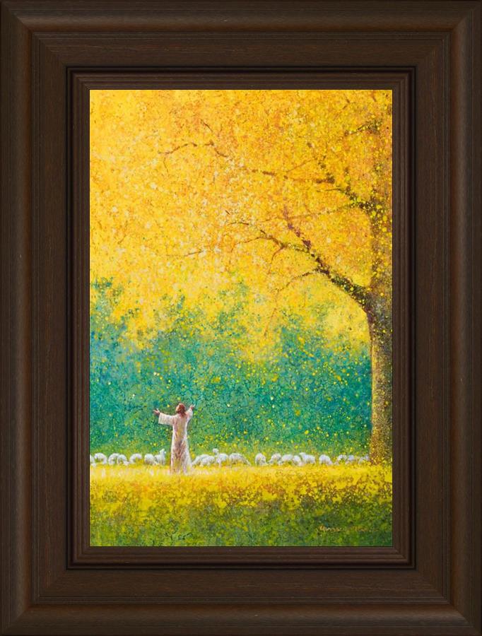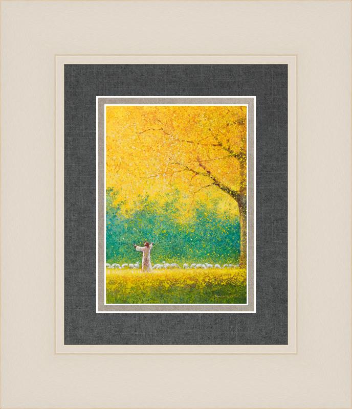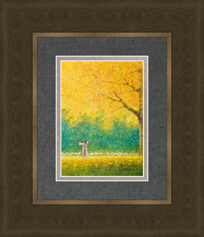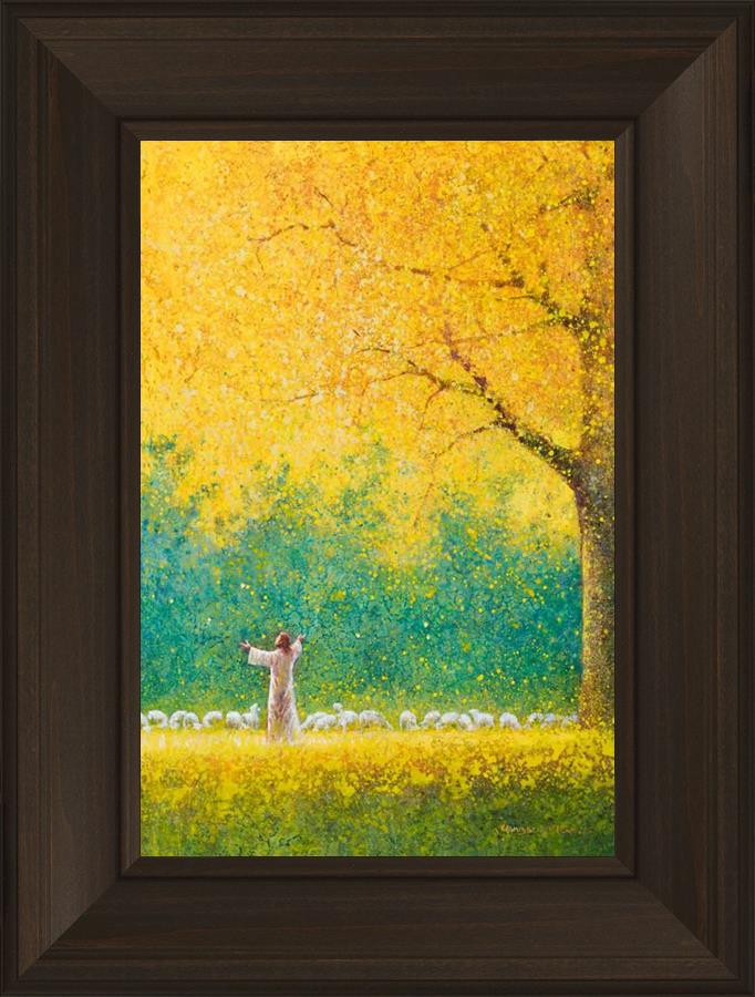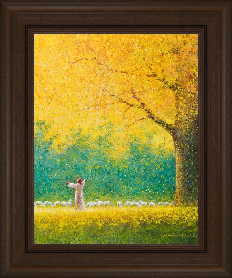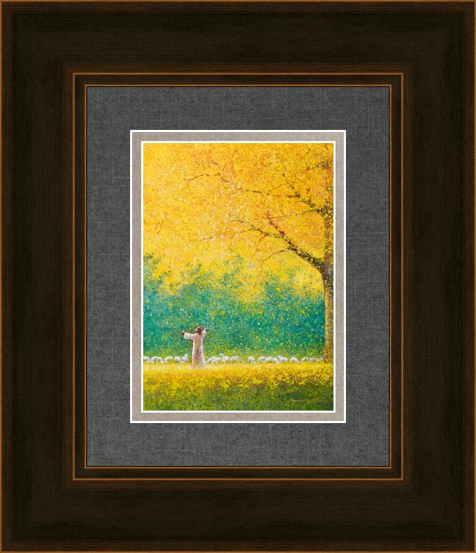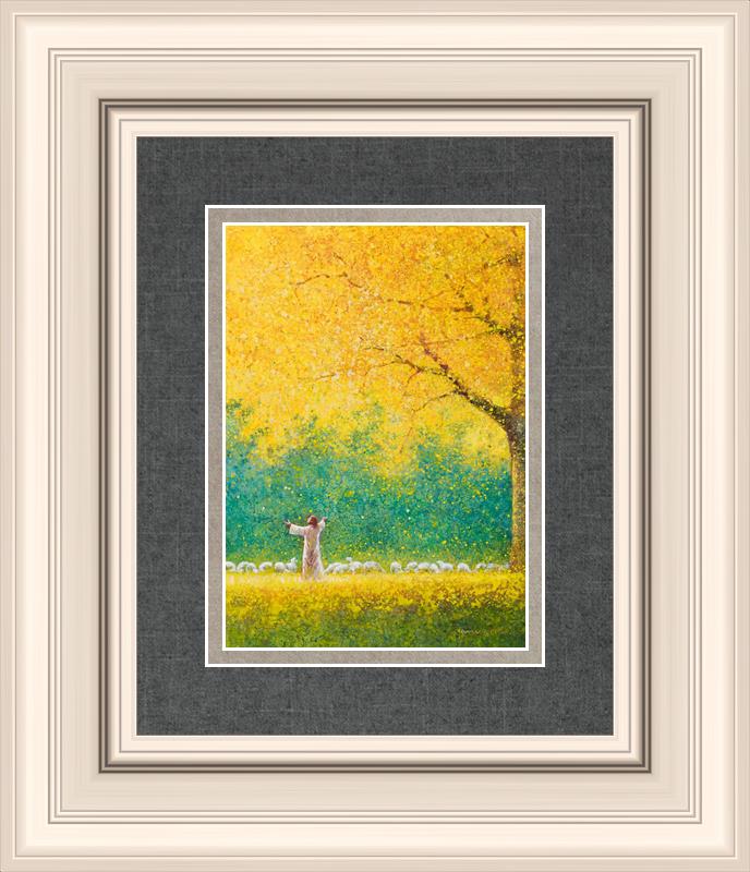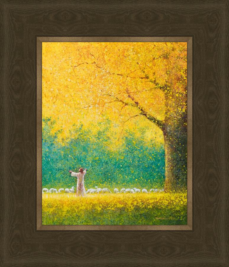 Sunshine In My Soul by Yongsung Kim depicts Jesus in a field with autumn leaves on the ground and outstretched hands standing under a tree with yellow leaves and a flock of sheep by Him. This painting is available in print and canvas.