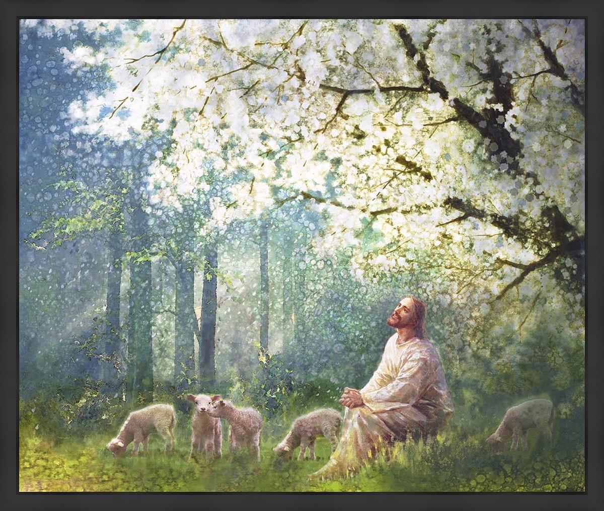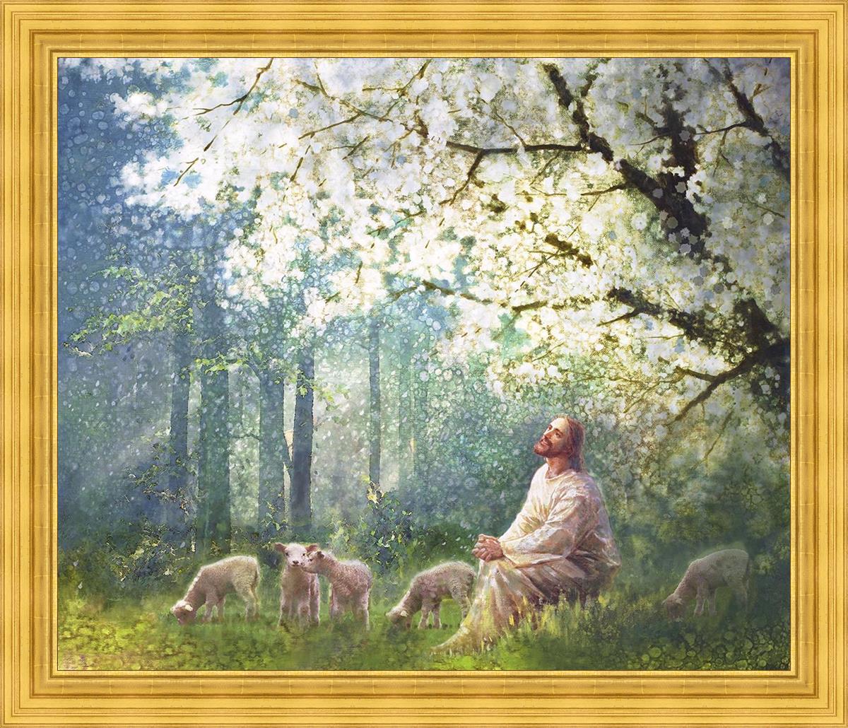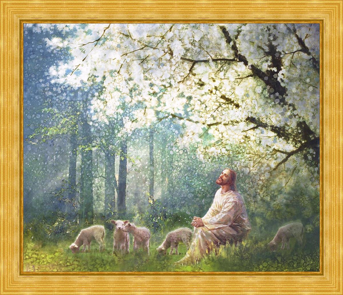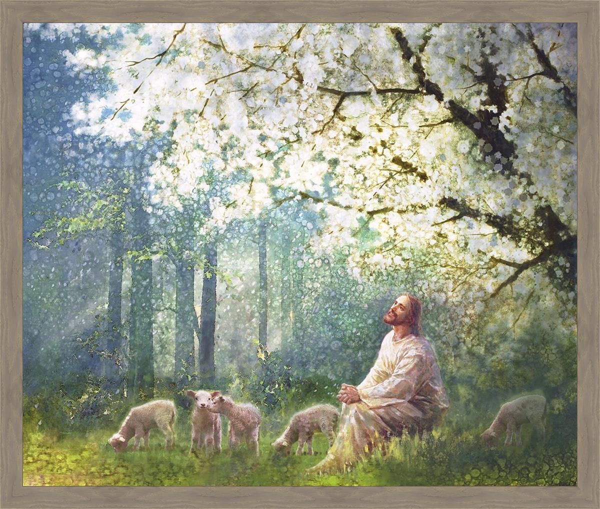 Painting of Sweet is the Work represents Jesus Christ not only as a protector but a caretaker playing beneath a tree with His flock in an abundant pasture