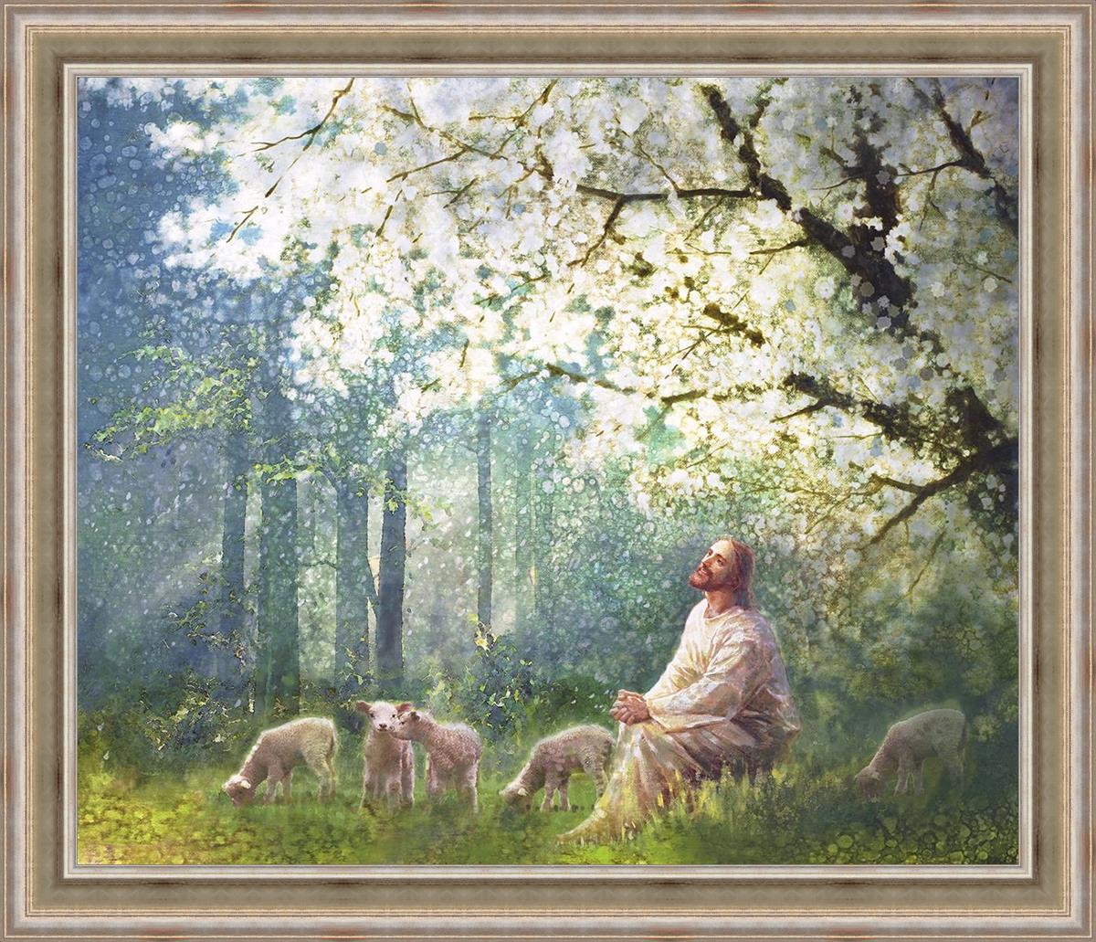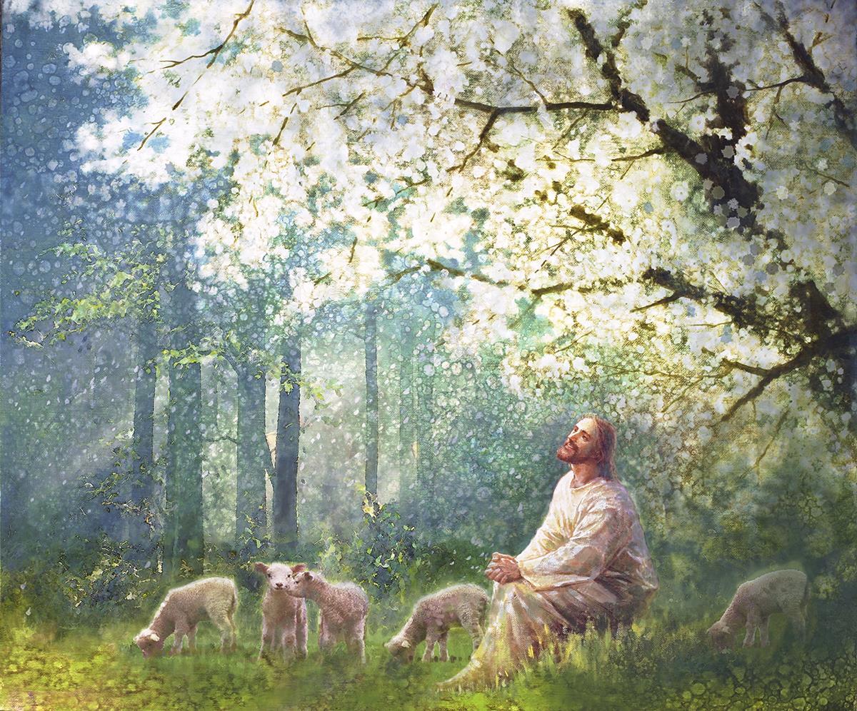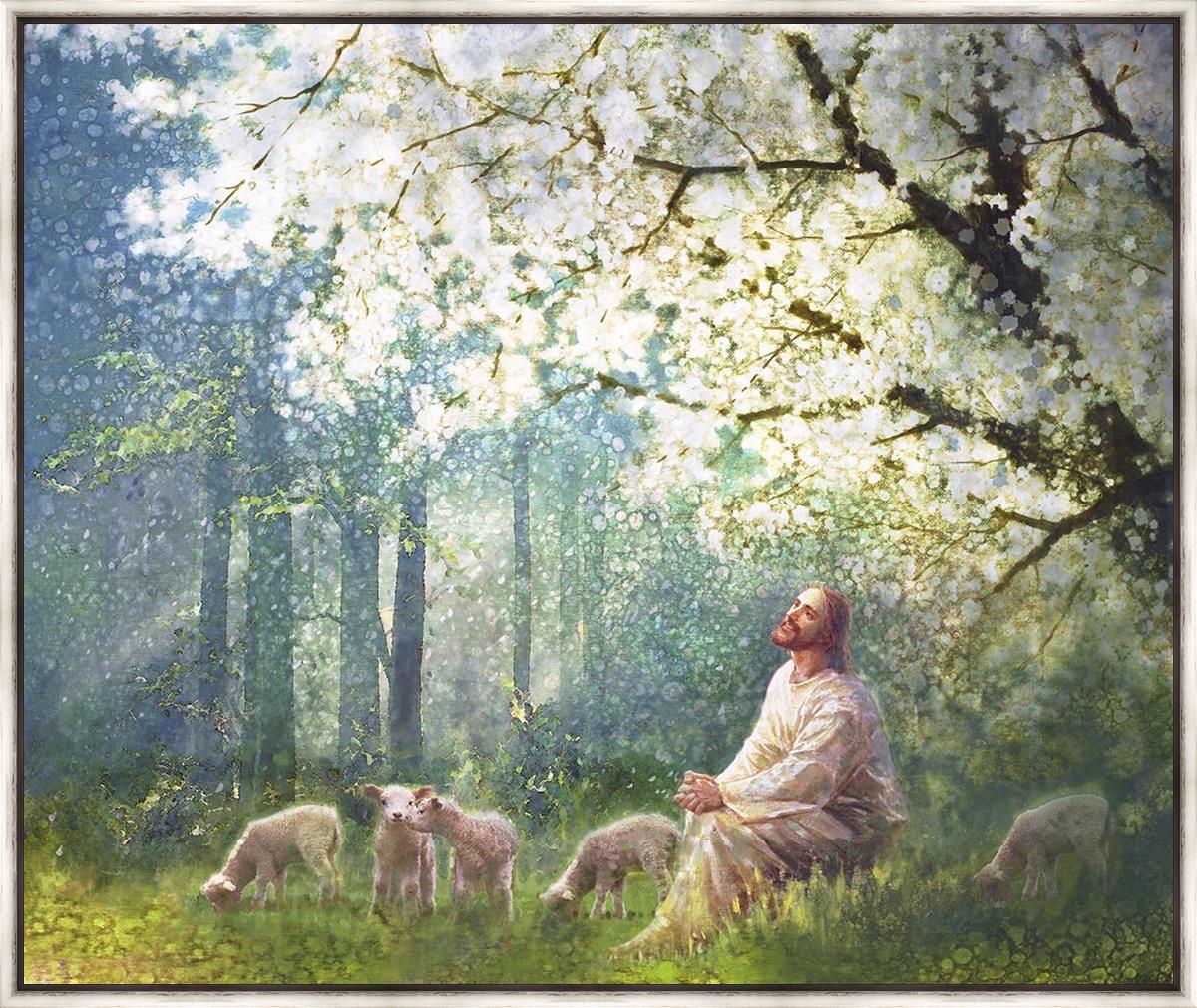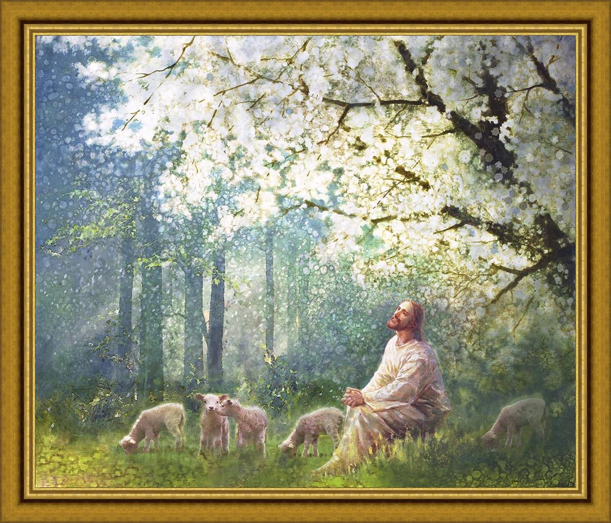 Painting of Sweet is the Work represents Jesus Christ not only as a protector but a caretaker playing beneath a tree with His flock in an abundant pasture