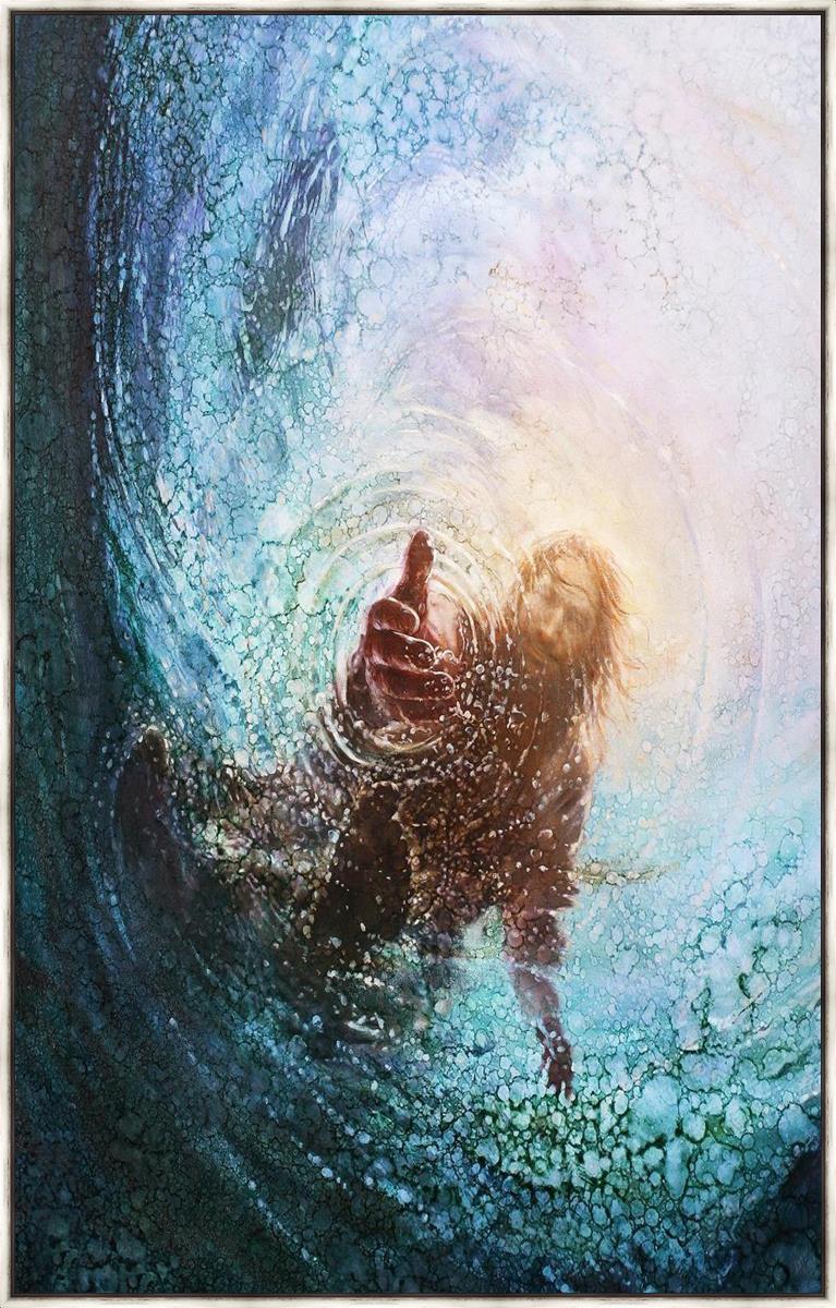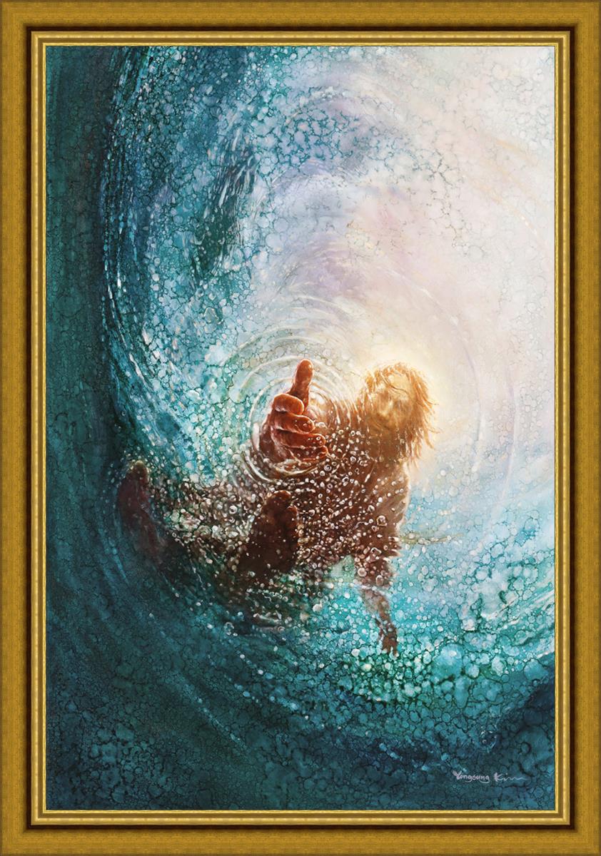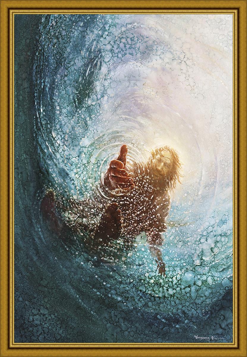 When Yongsung Kim first envisioned The Hand of God painting, he was imagining a new perspective of Jesus Christ as He was reaching with His hand to save Peter from drowning. Most paintings that depict this story paint the scene from a third-person perspective. Instead, Yongsung Kim decided to paint The Hand of God painting from Peter's first-person perspective. And because Yongsung Kim chose this first-person perspective it makes The Hand of God painting all the more relatable and empowering, because it connects us to the Savior at a much deeper level. The Hand of God painting by Yongsung Kim does this because we are imagining that Jesus Christ is reaching down with His hand to personally save us from drowning.