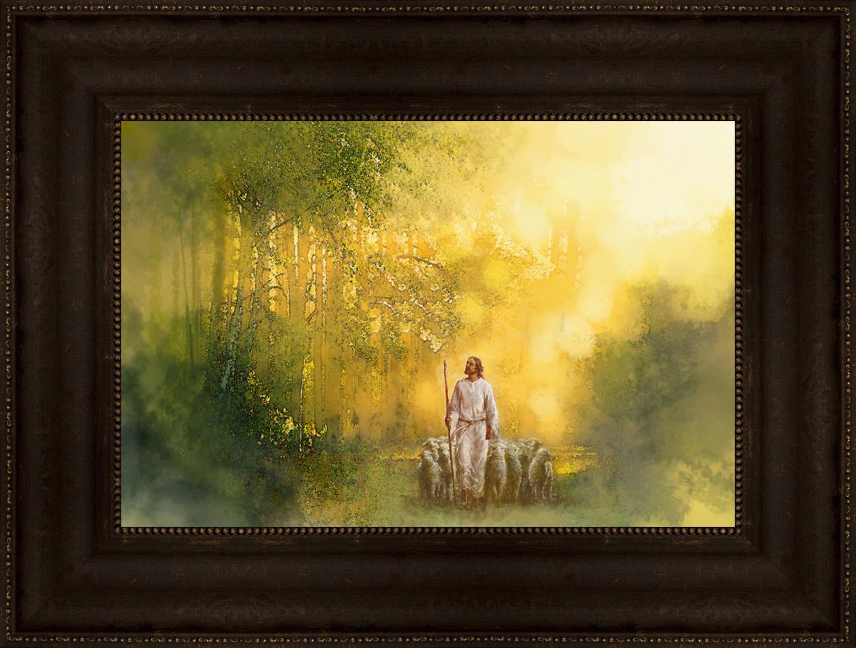 The Lord Is My Shepherd by Yongsung Kim depicts Jesus holding a staff walking through a grove of trees being followed by a flock of sheep with the sun shining down on them through the trees. This painting is available in print and canvas.