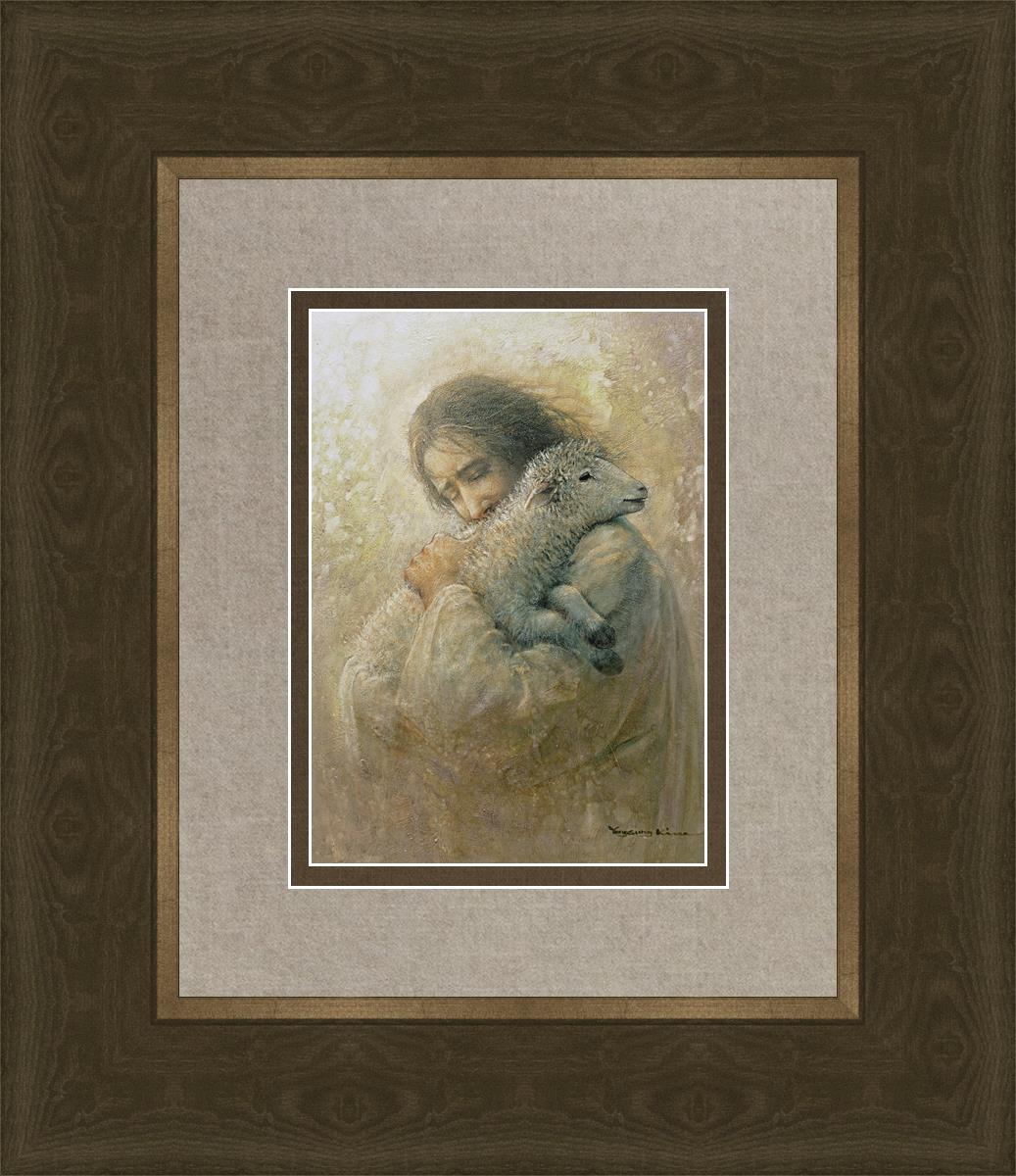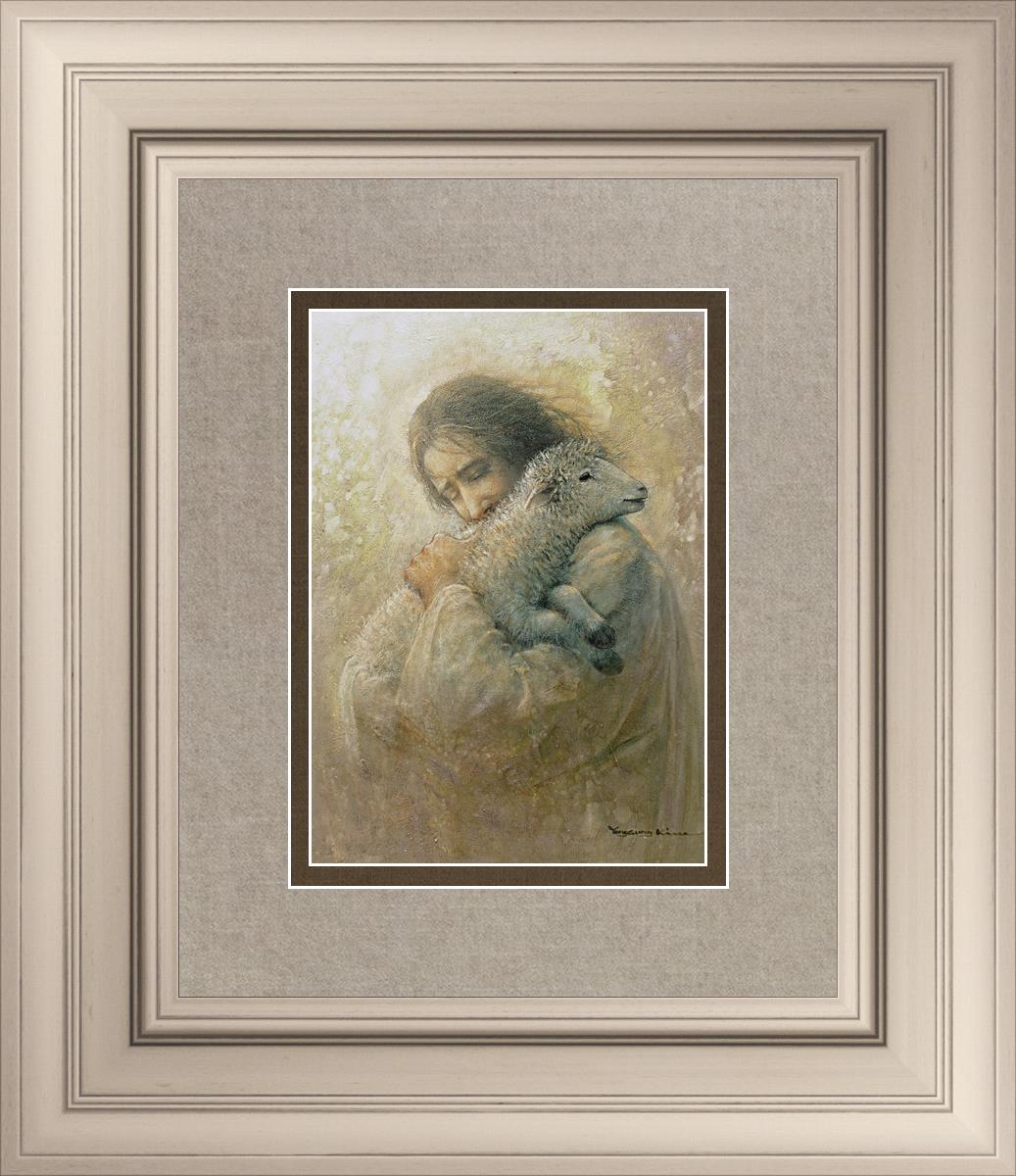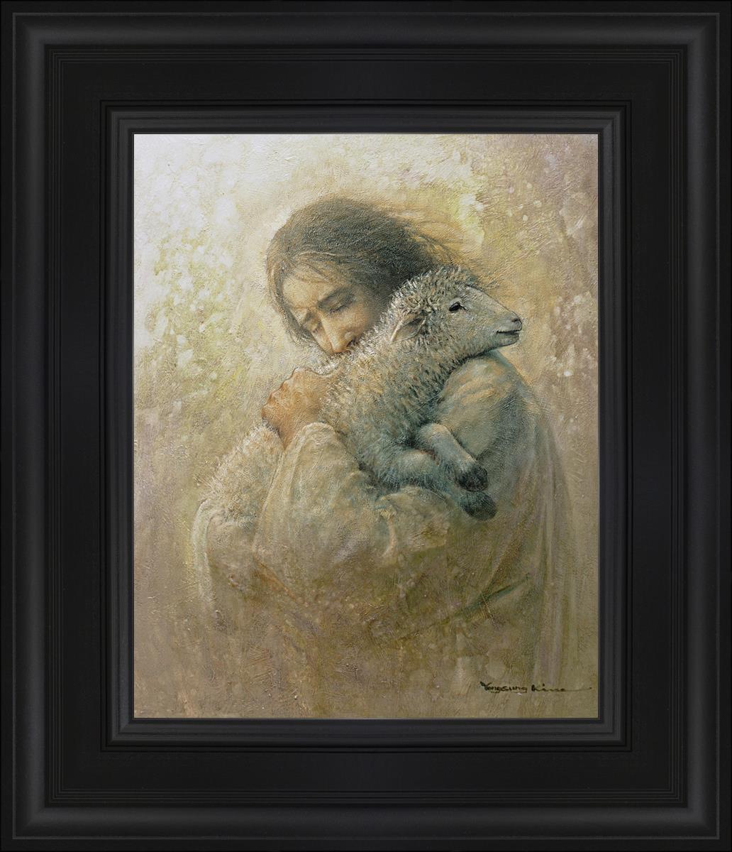 The Shepherd's Care by Yongsung Kim depicts Jesus with His eyes closed hugging a lamb tightly to His shoulder. This painting is available in print and canvas.