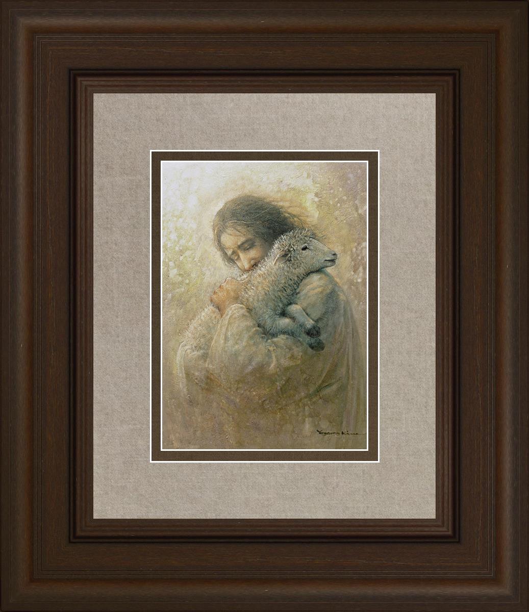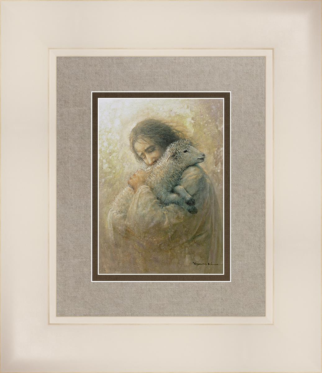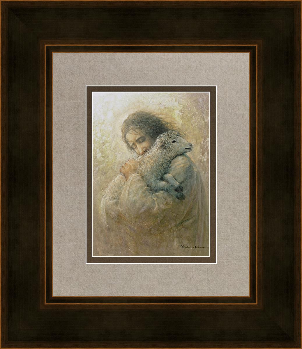 The Shepherd's Care by Yongsung Kim depicts Jesus with His eyes closed hugging a lamb tightly to His shoulder. This painting is available in print and canvas.