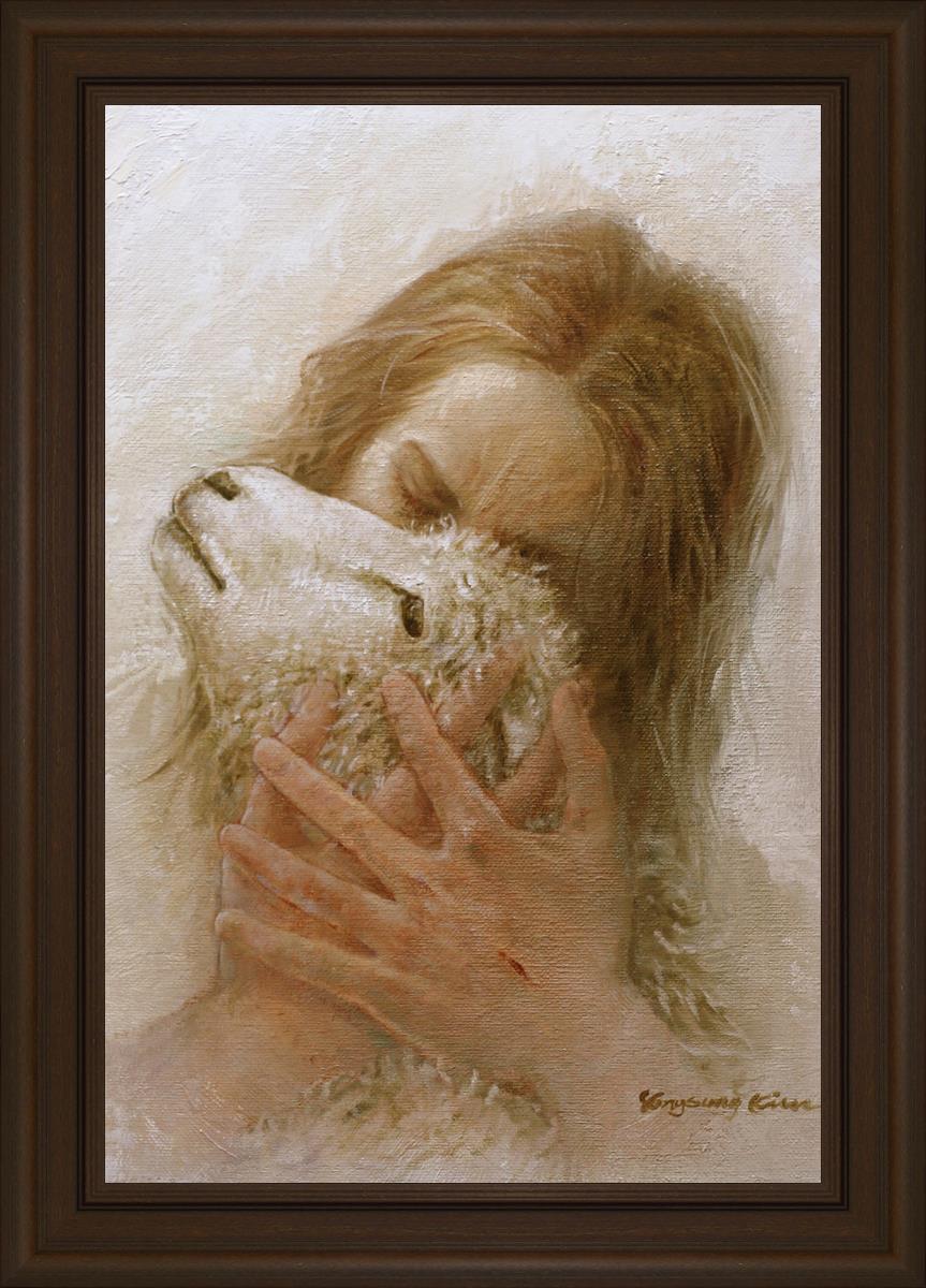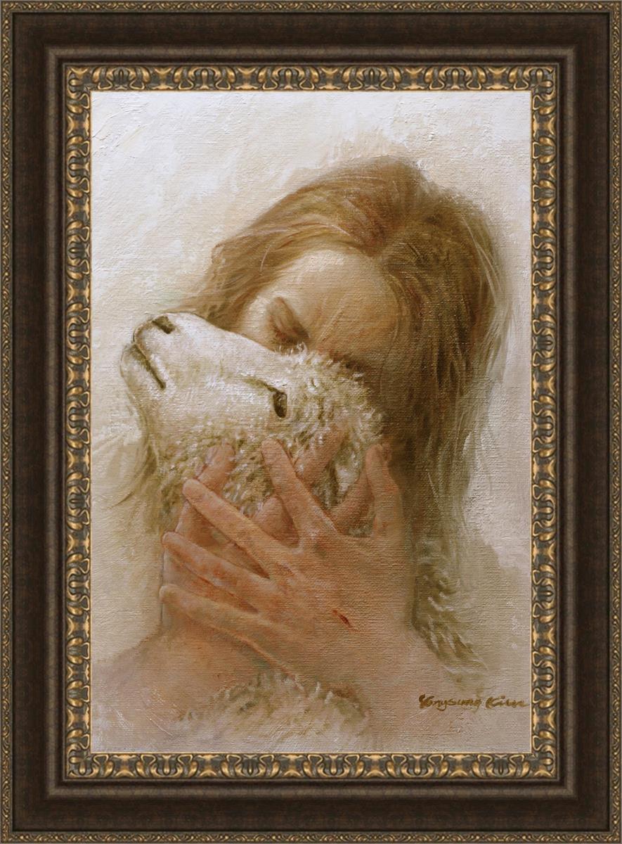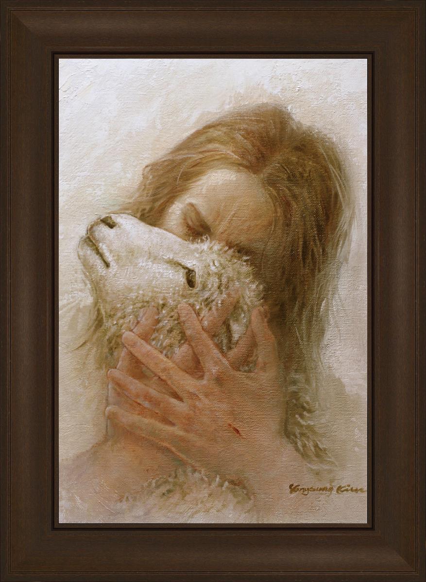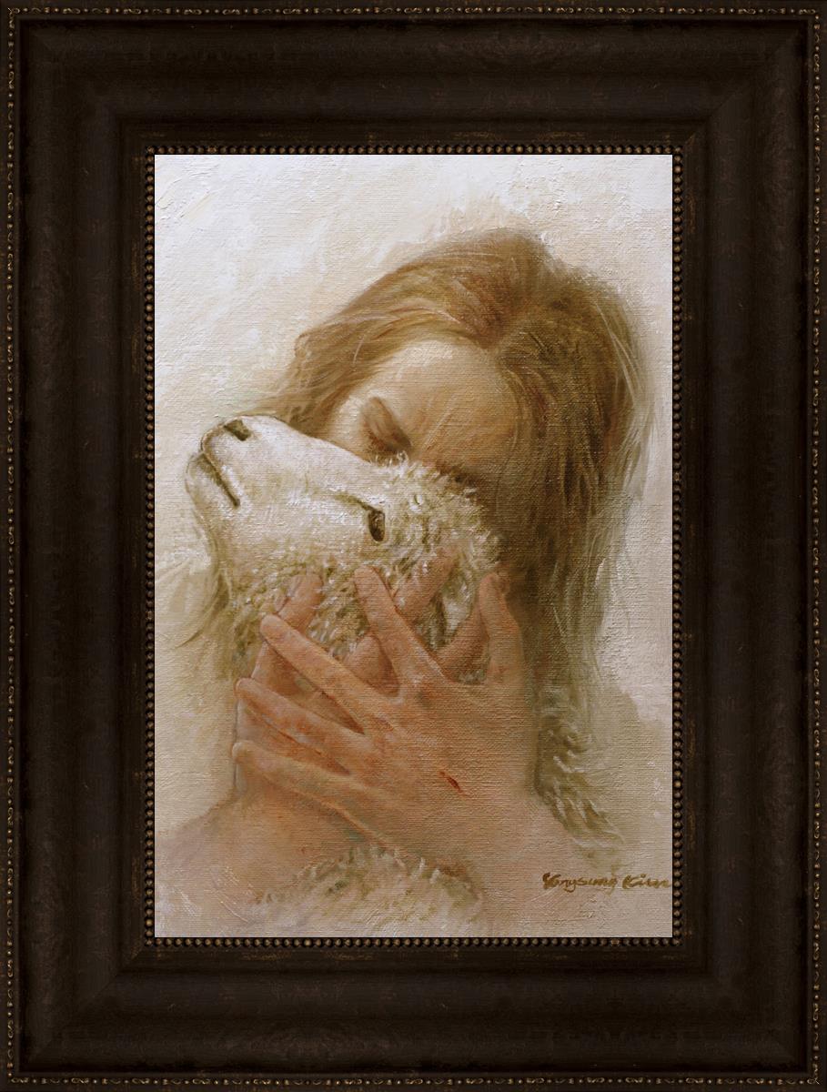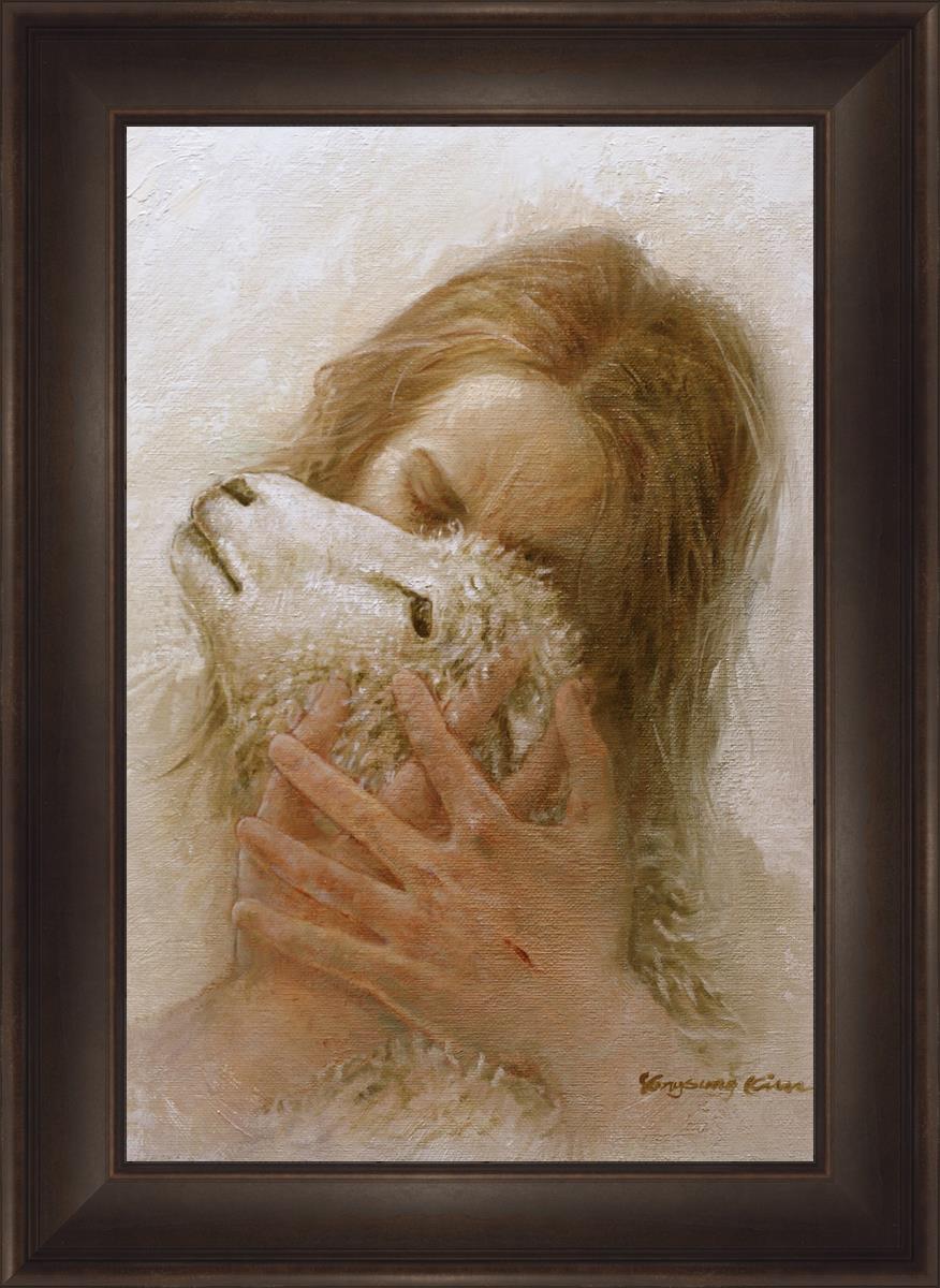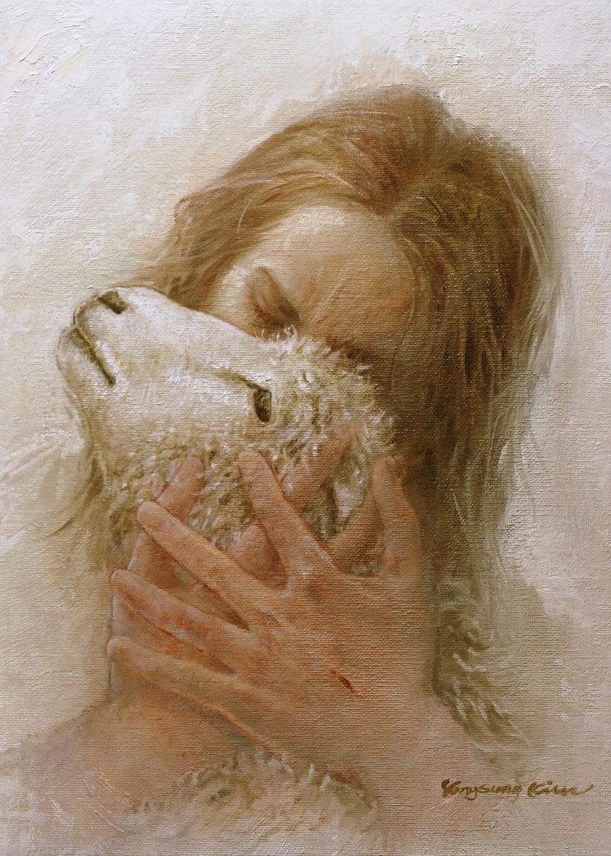 The Shepherd's Embrace by Yongsung Kim depicts Jesus Christ hugging a lamb and kissing it's head. This painting is available in print and canvas.