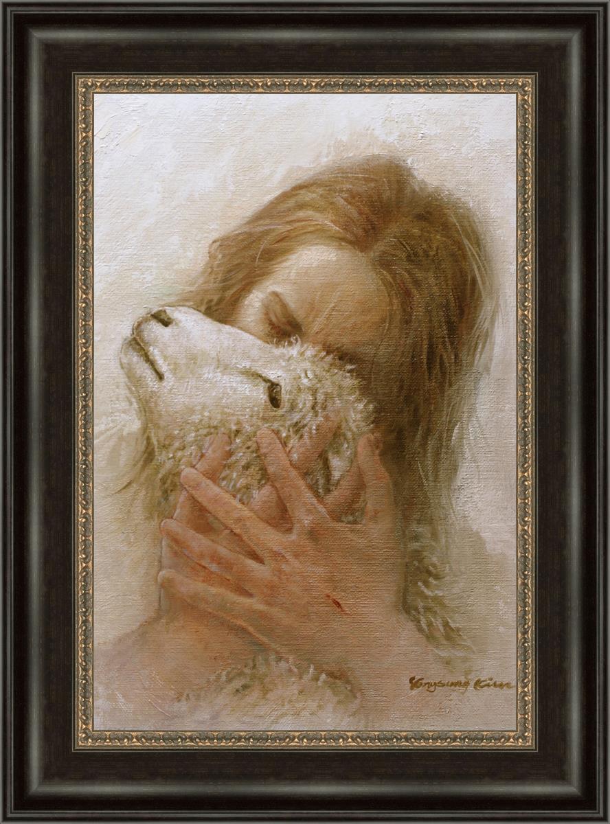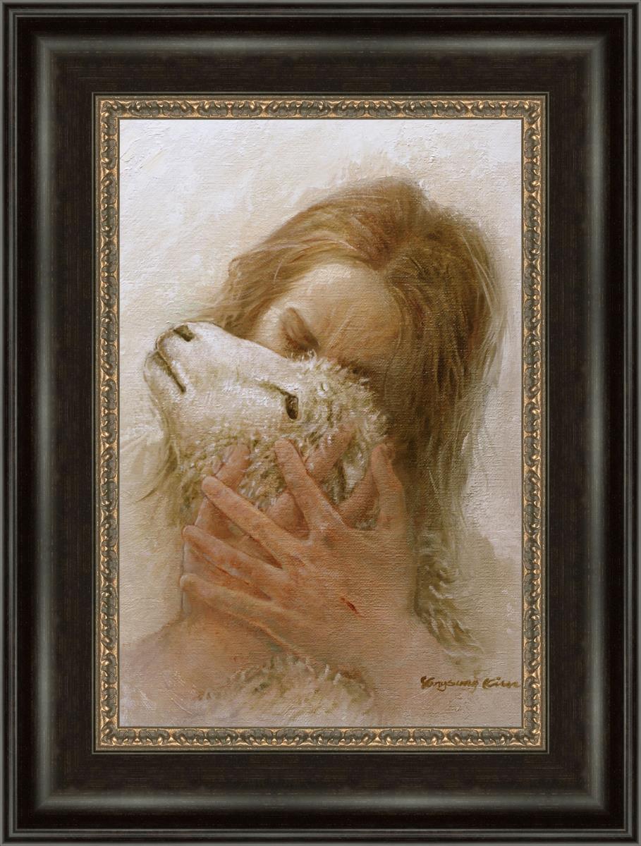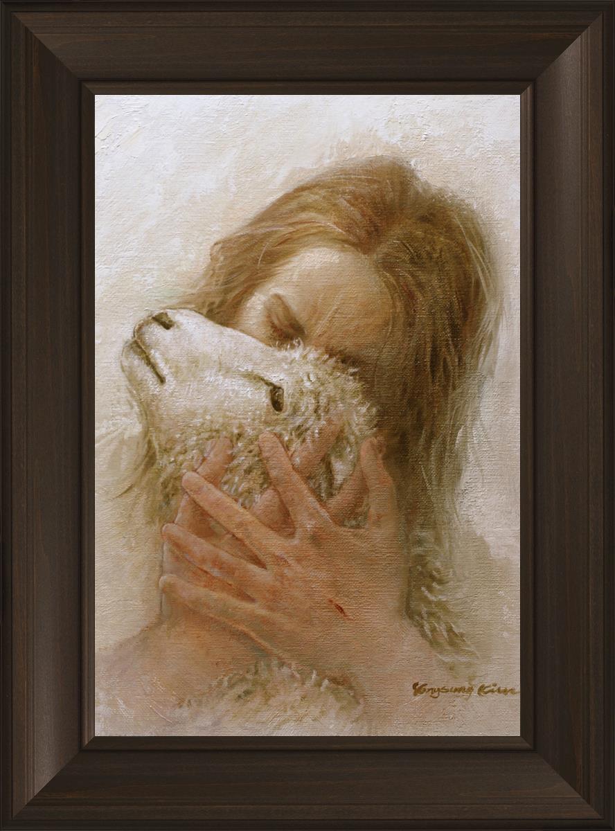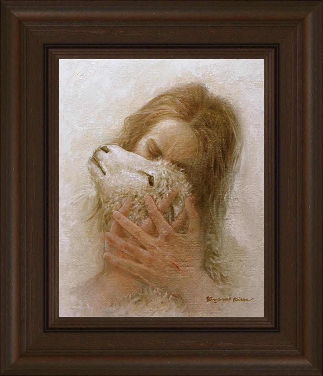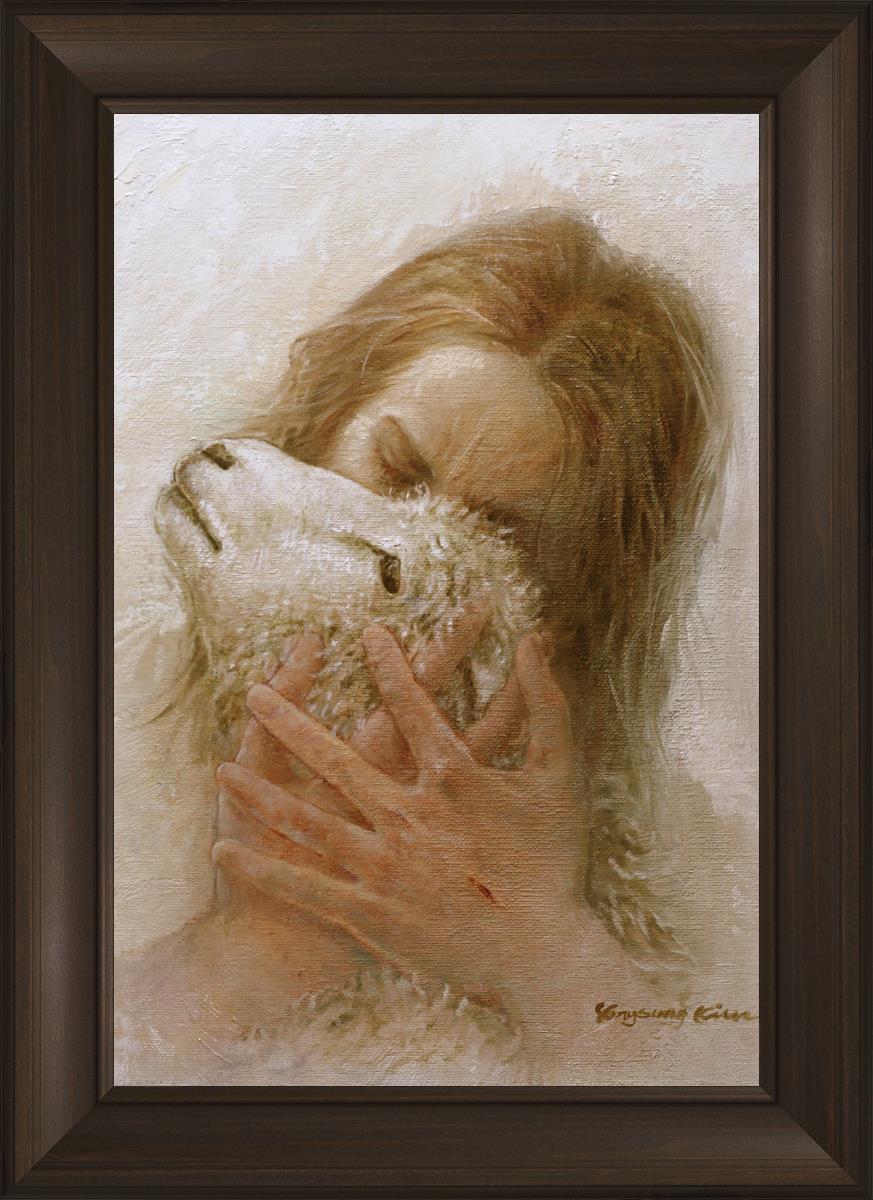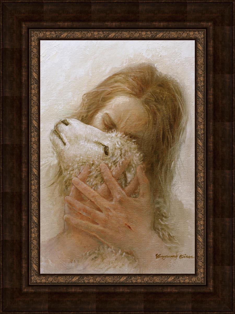 The Shepherd's Embrace by Yongsung Kim depicts Jesus Christ hugging a lamb and kissing it's head. This painting is available in print and canvas.