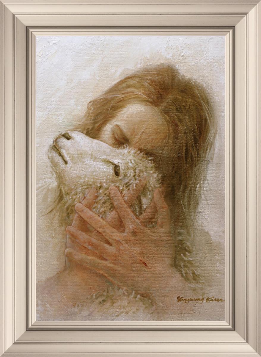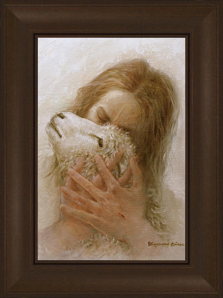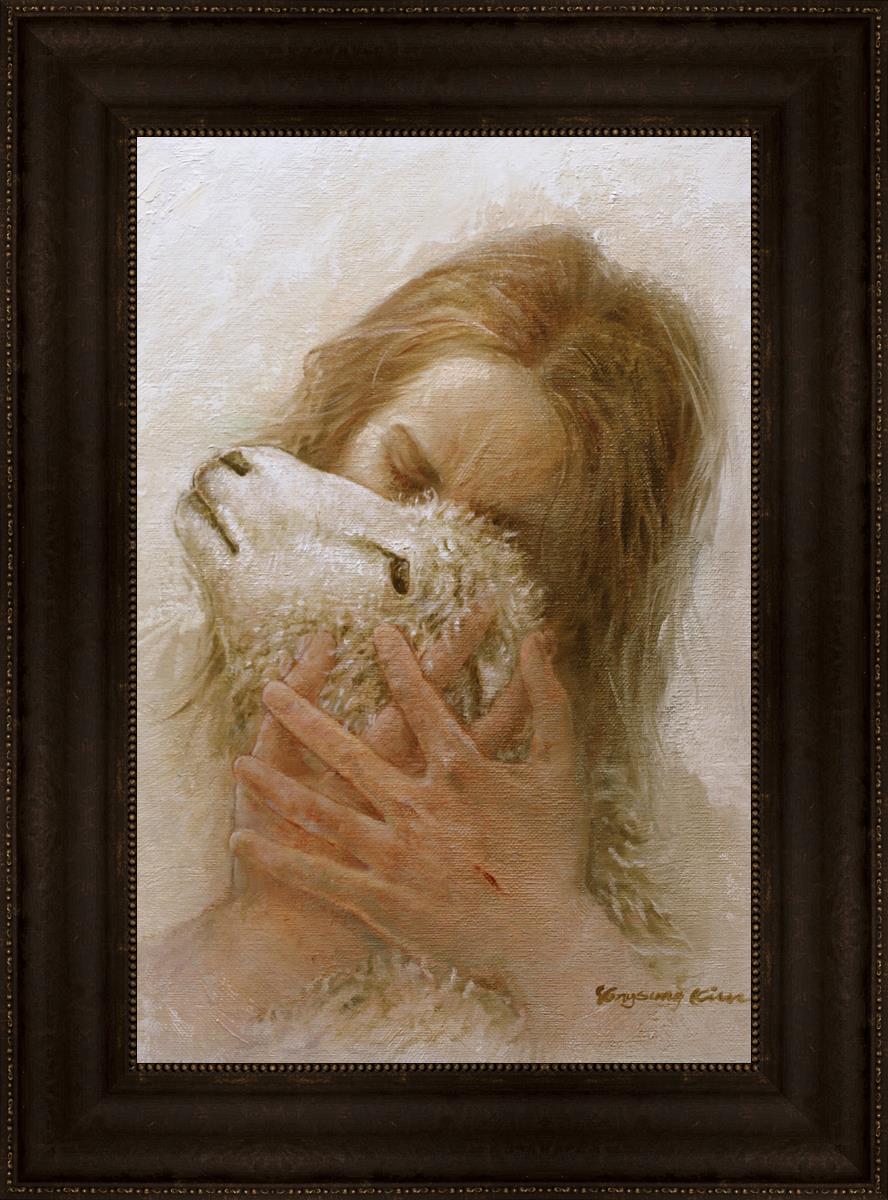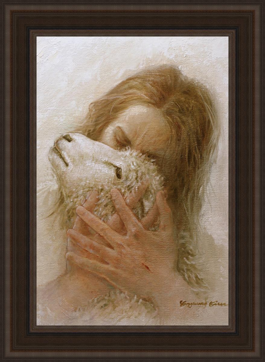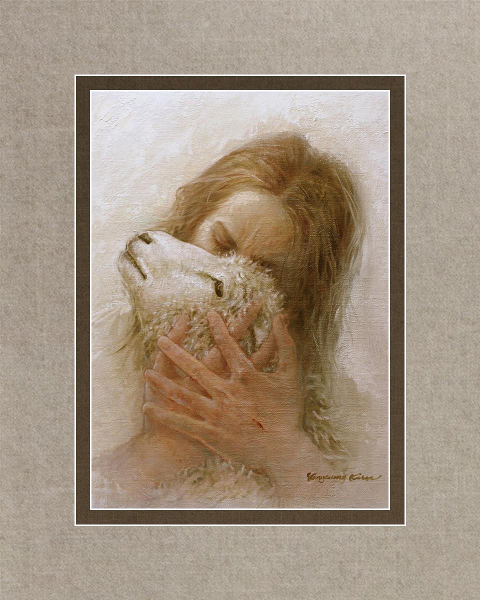 The Shepherd's Embrace by Yongsung Kim depicts Jesus Christ hugging a lamb and kissing it's head. This painting is available in print and canvas.