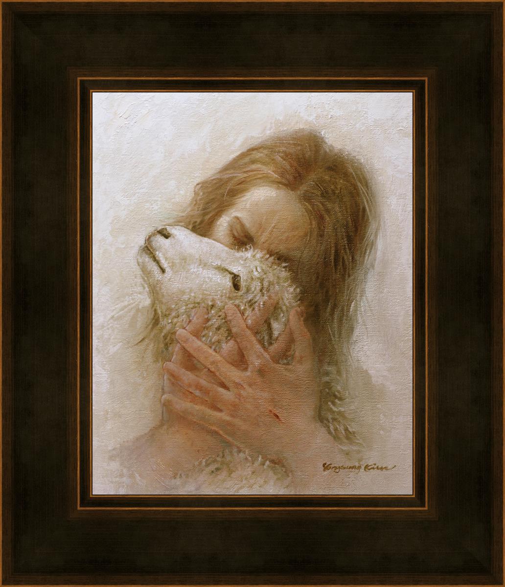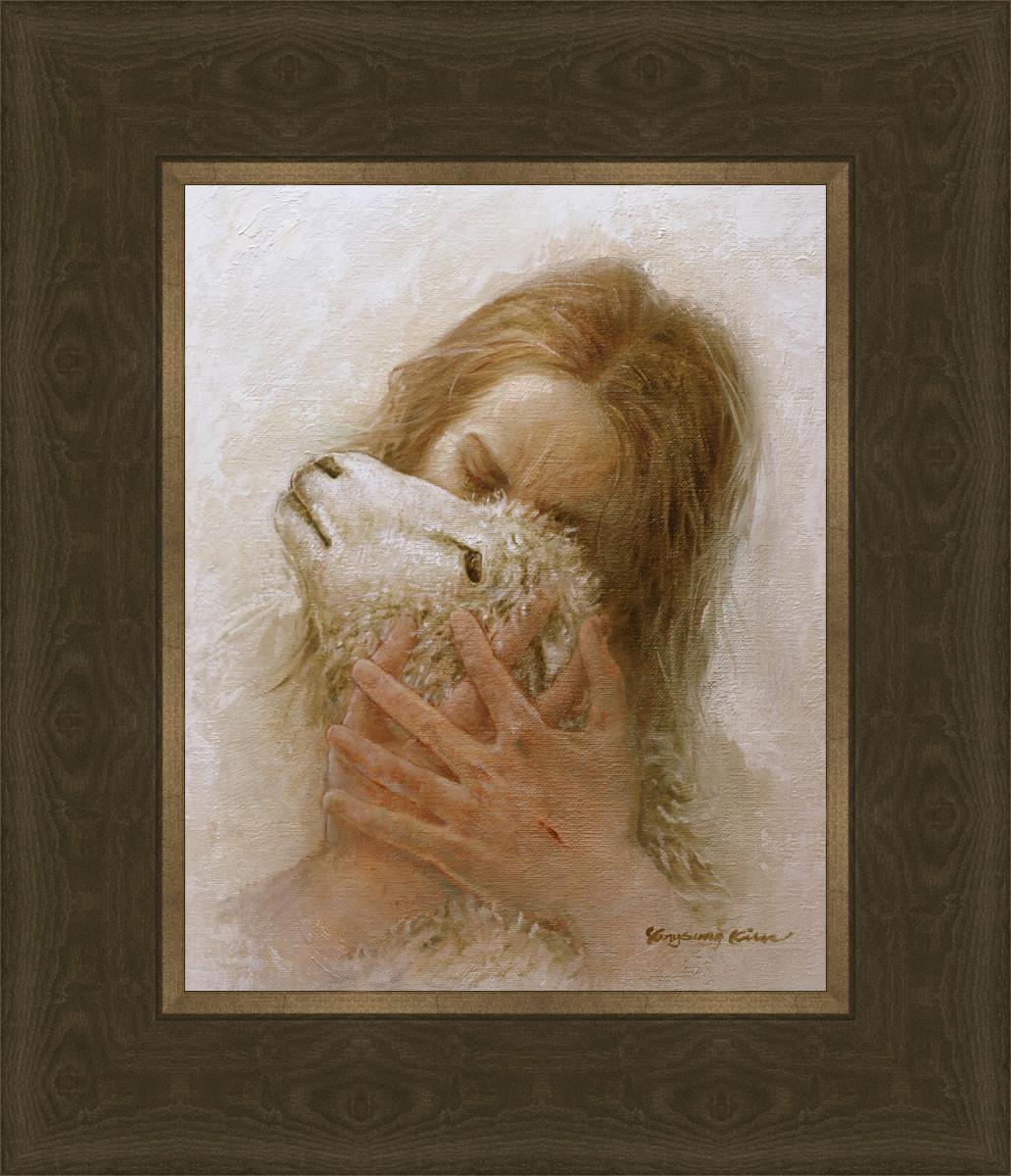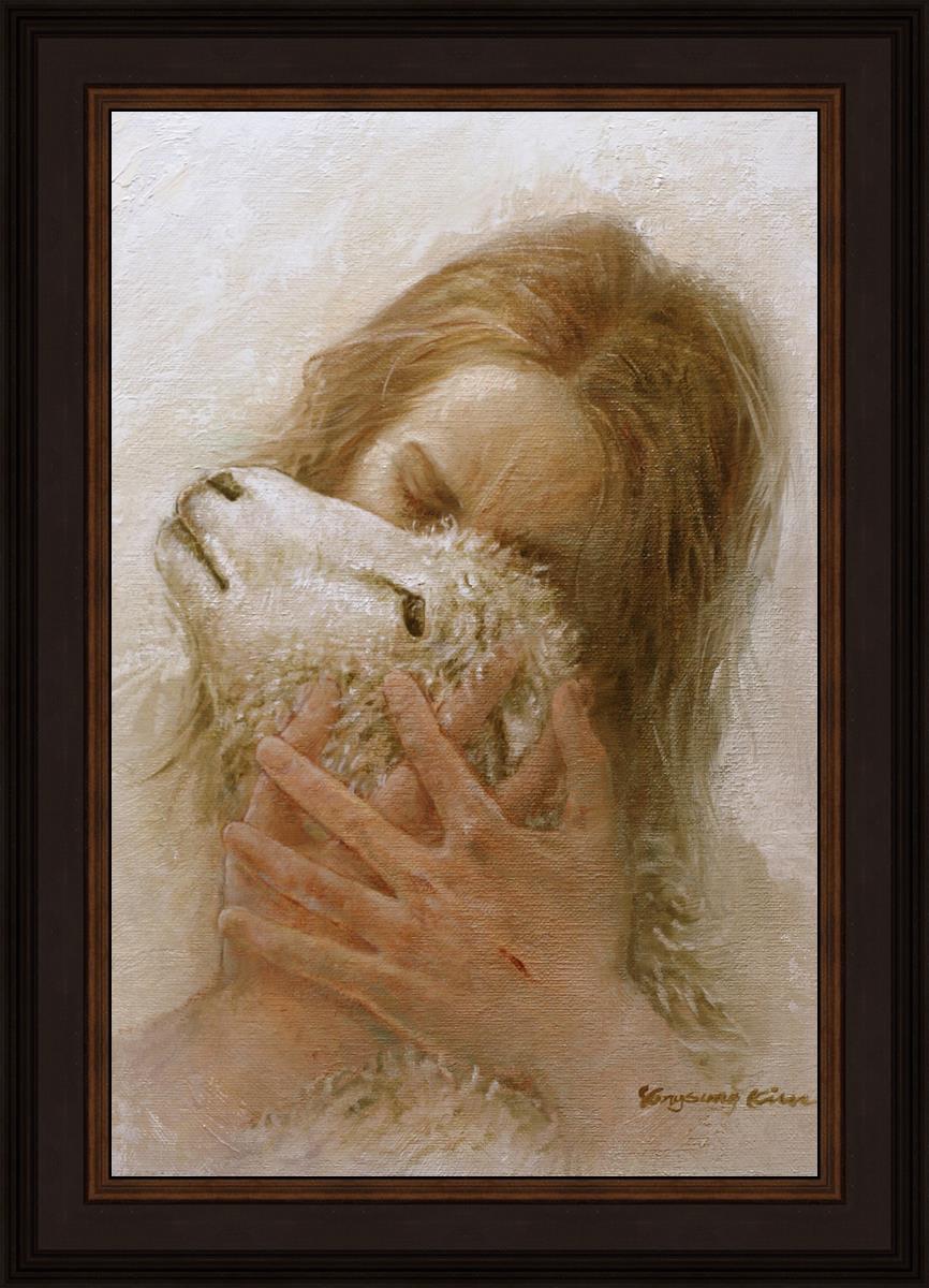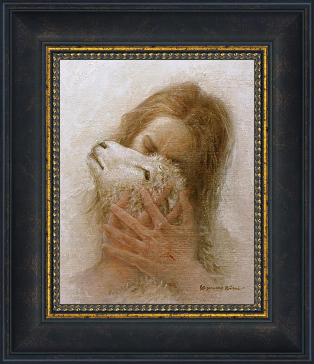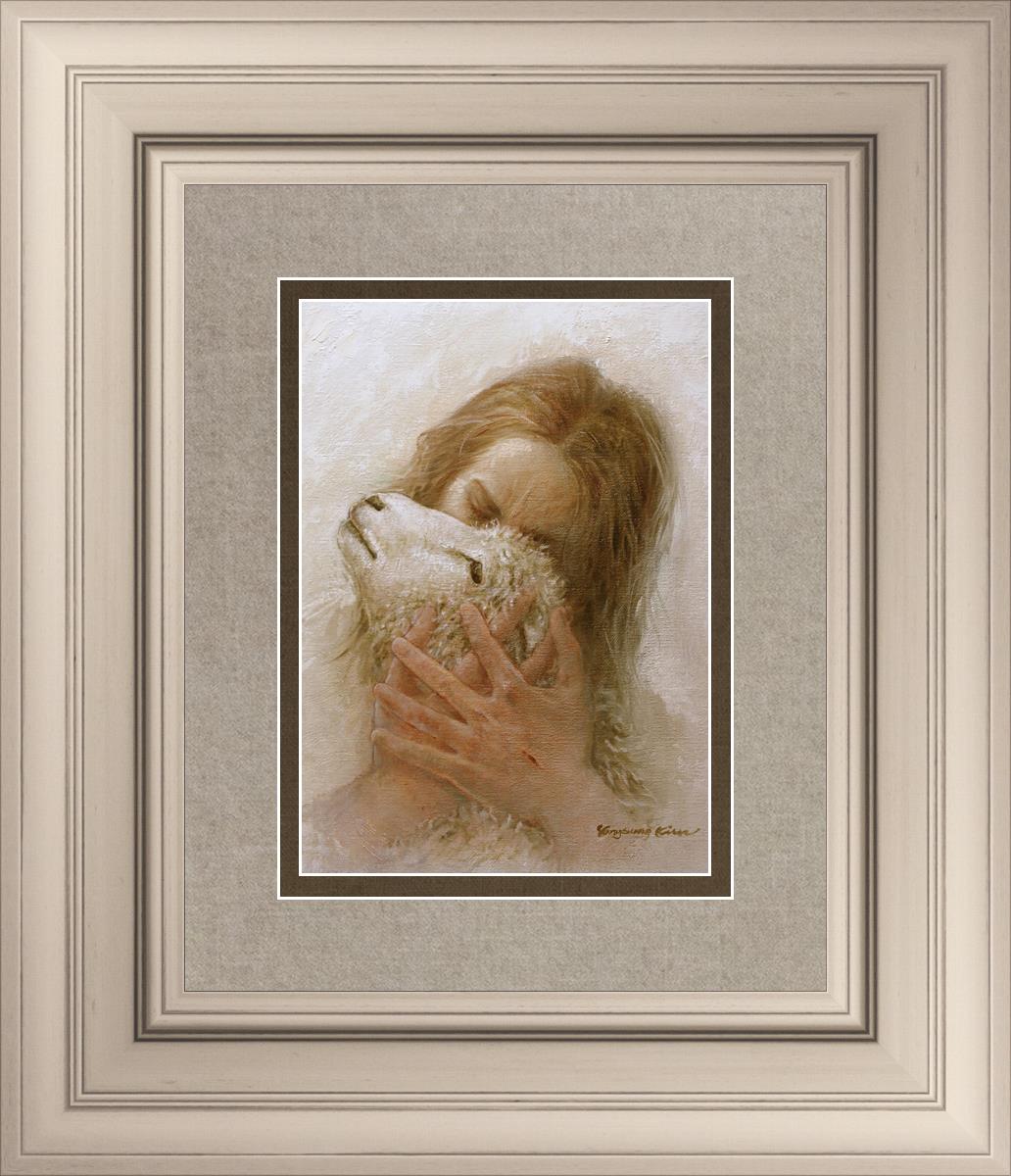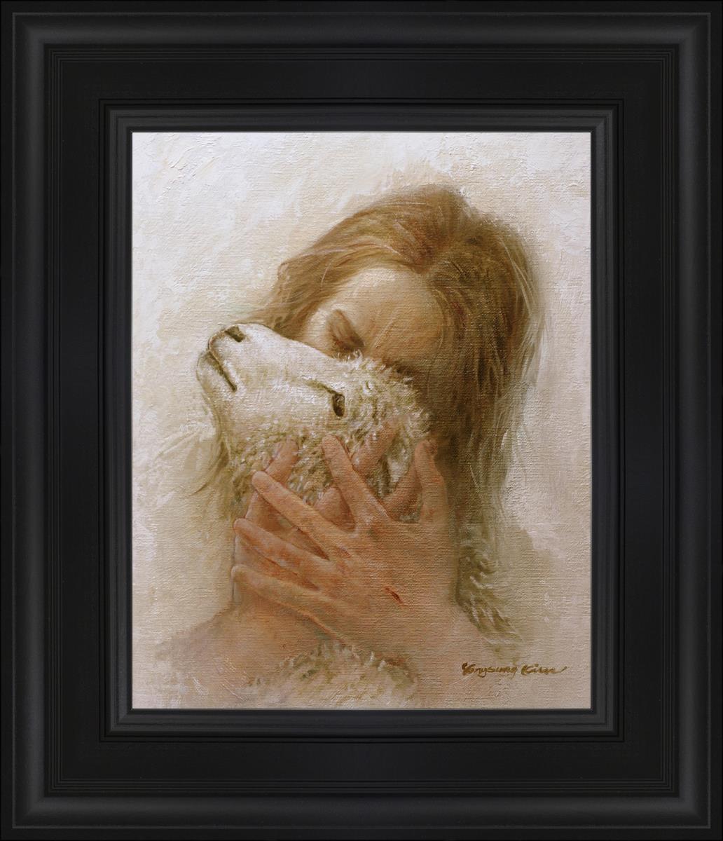 The Shepherd's Embrace by Yongsung Kim depicts Jesus Christ hugging a lamb and kissing it's head. This painting is available in print and canvas.