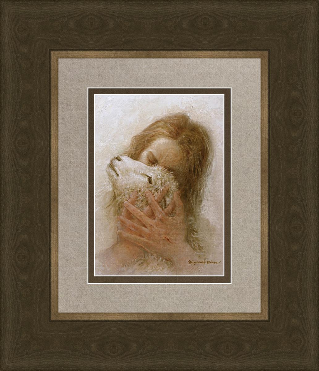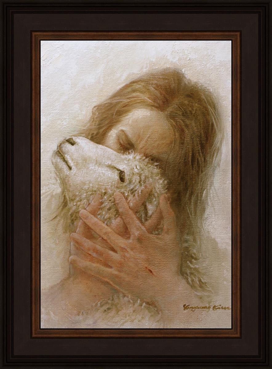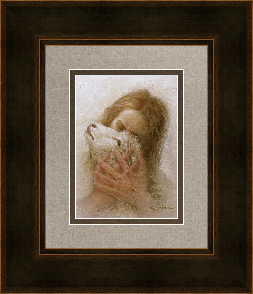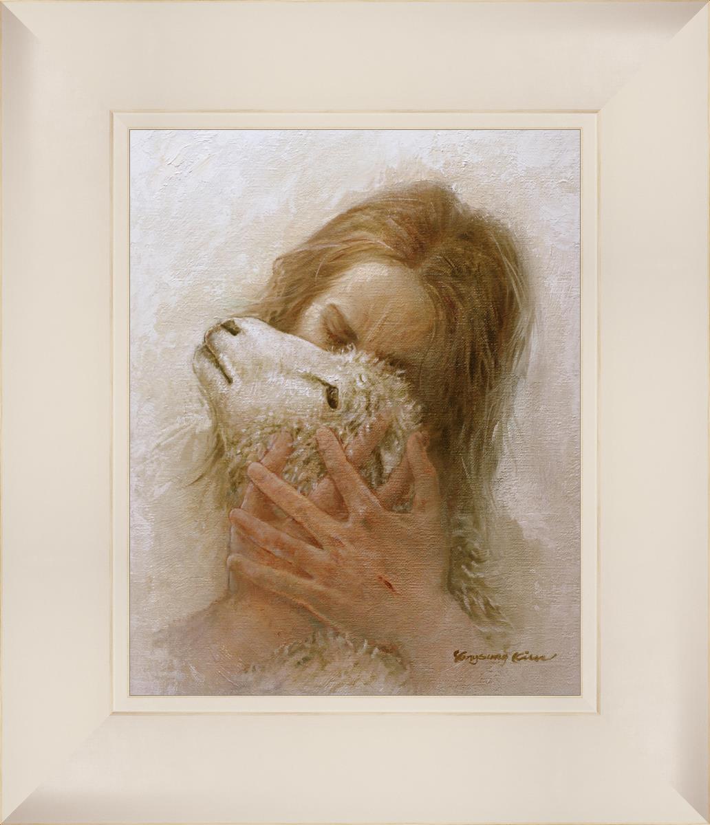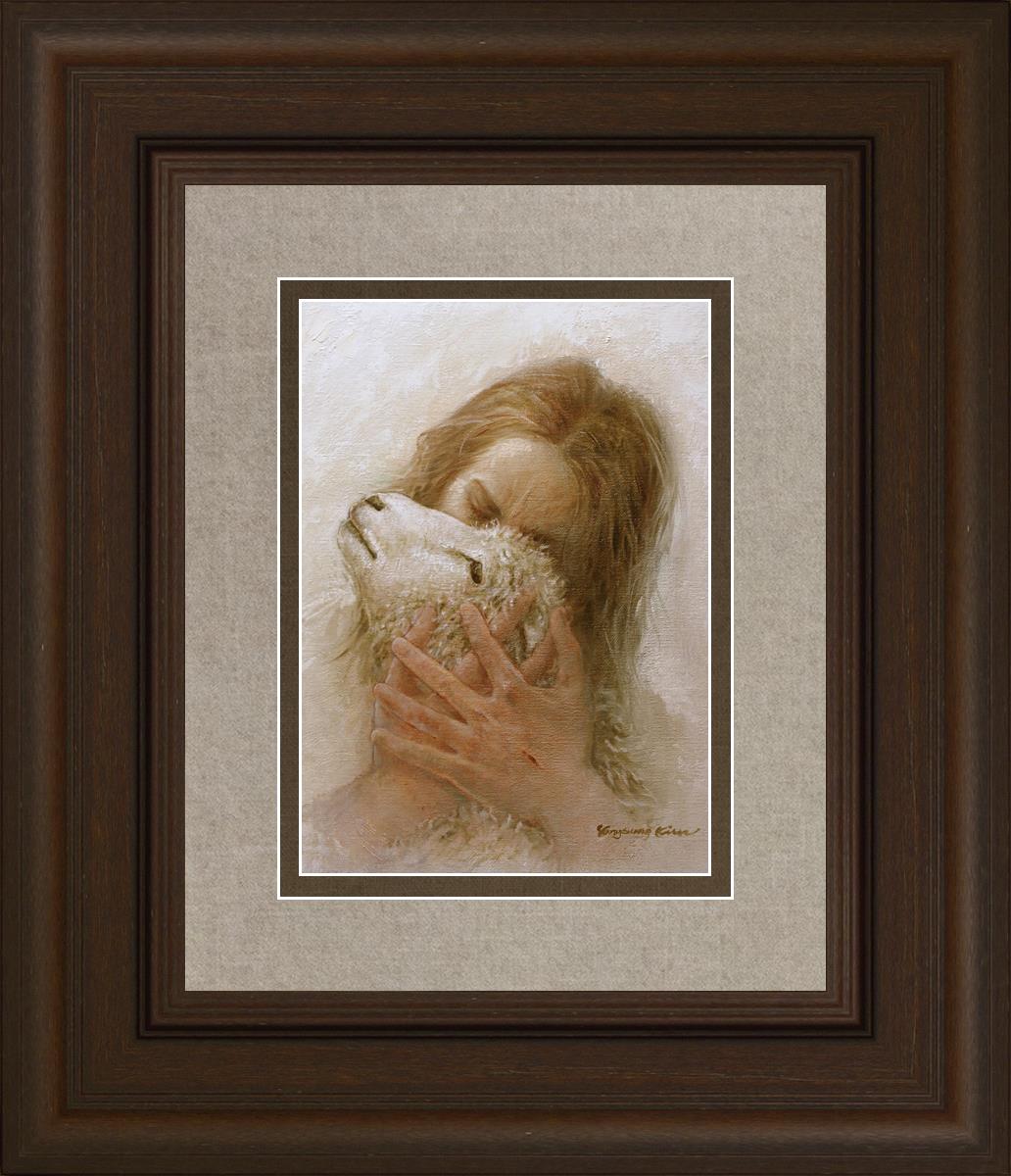 The Shepherd's Embrace by Yongsung Kim depicts Jesus Christ hugging a lamb and kissing it's head. This painting is available in print and canvas.