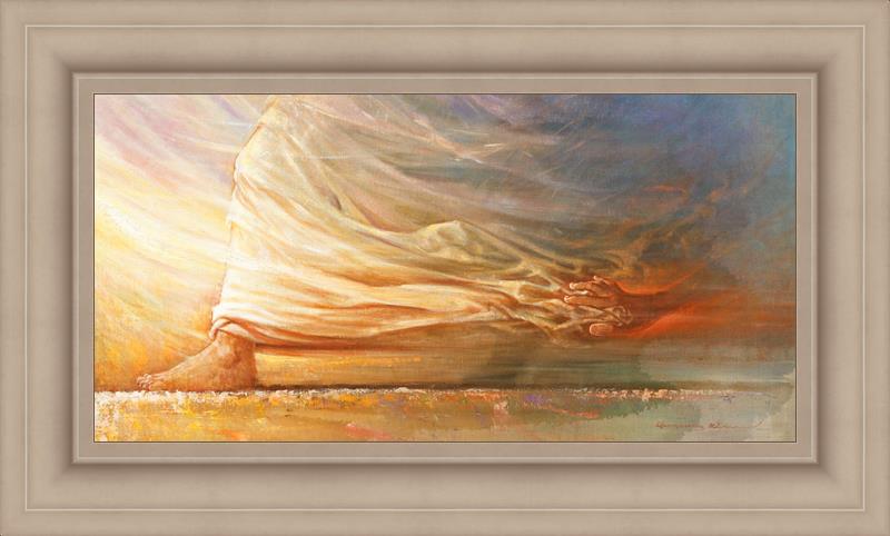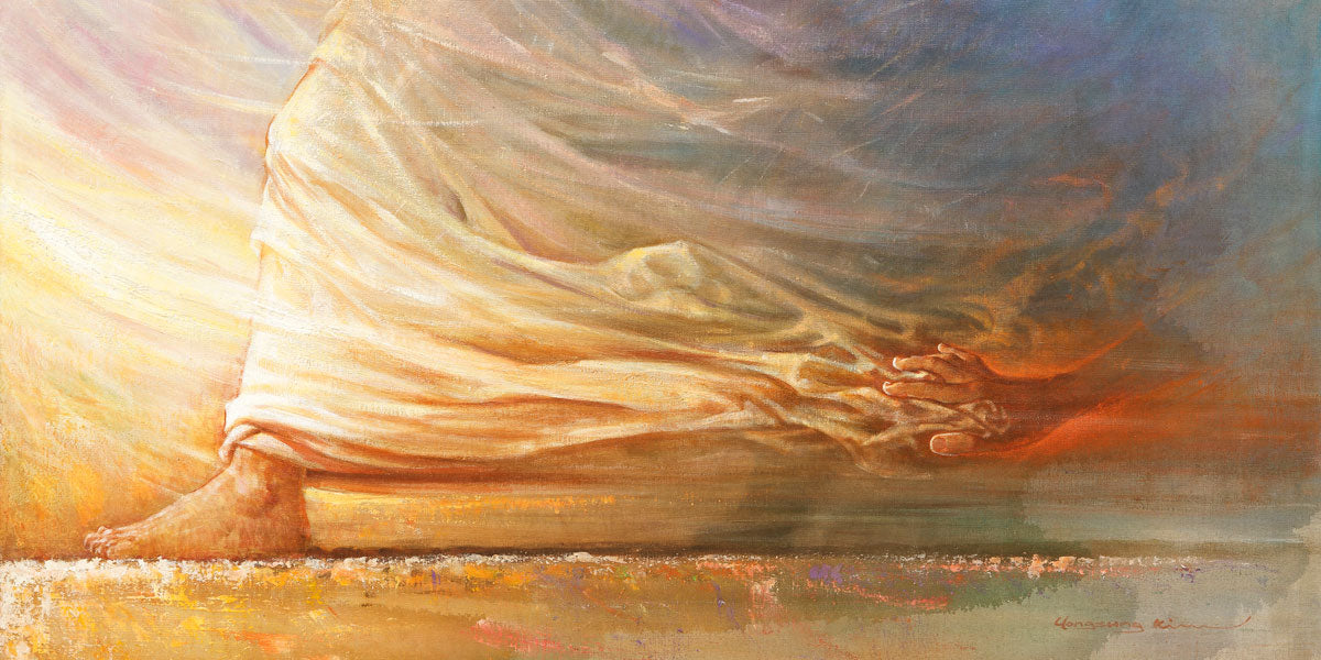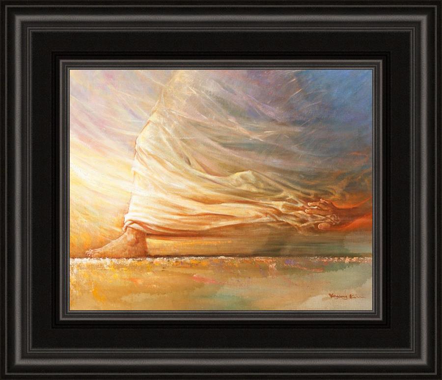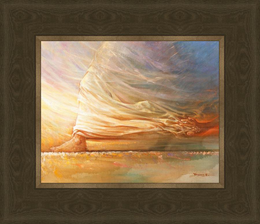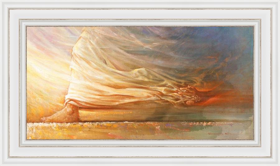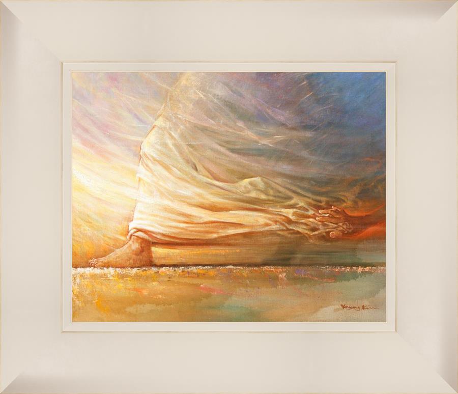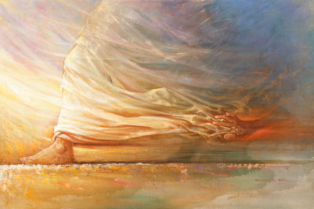 Touch of Faith by Yongsung Kim depicts the feet of Jesus and the hand of the woman with an issue of blood reaching in faith to touch the hem of His garment. This painting is available in print and canvas.