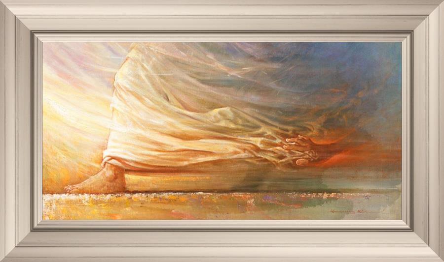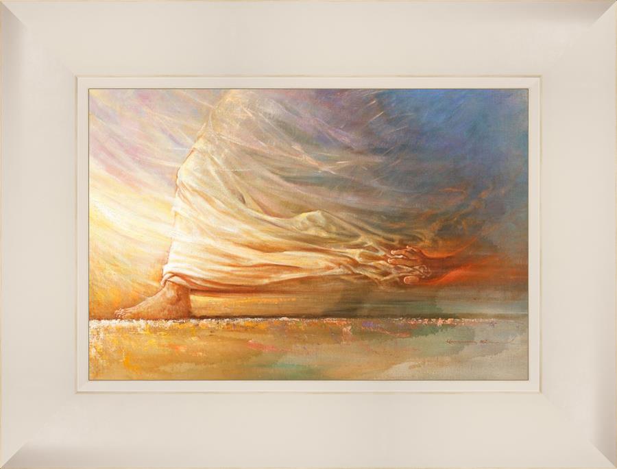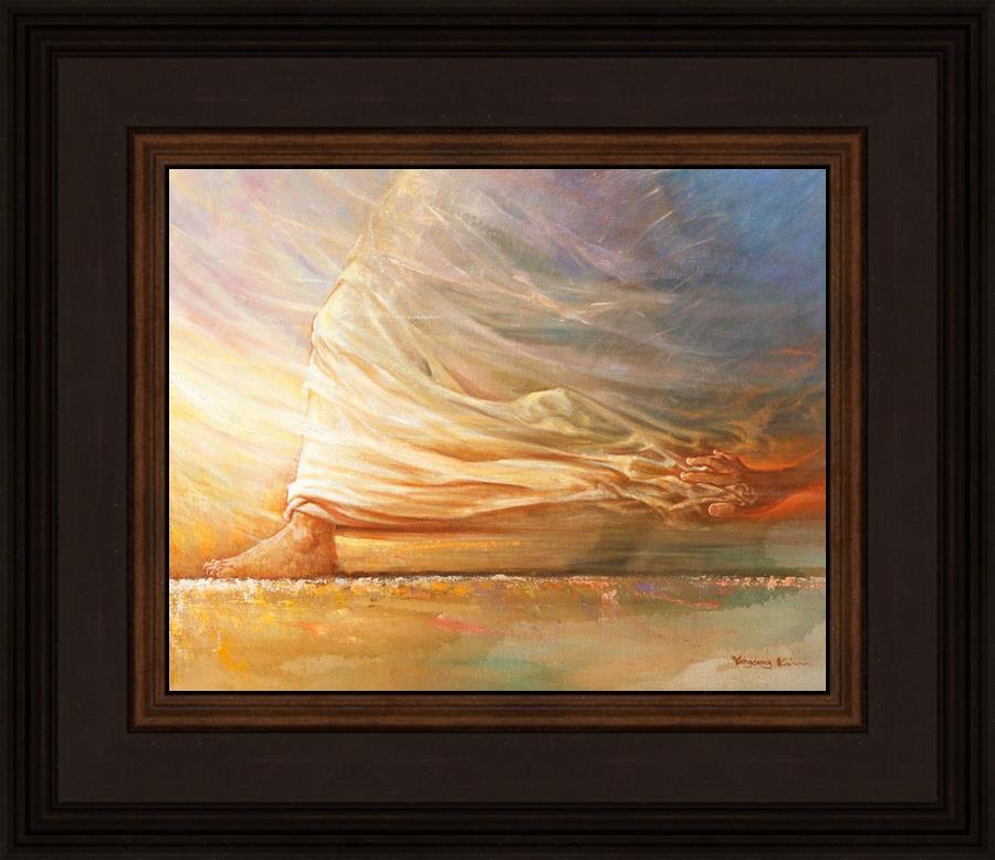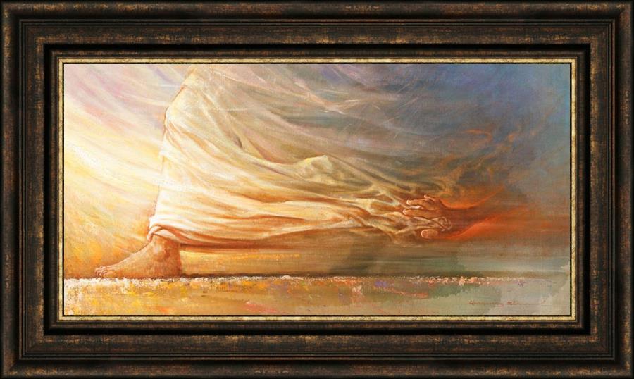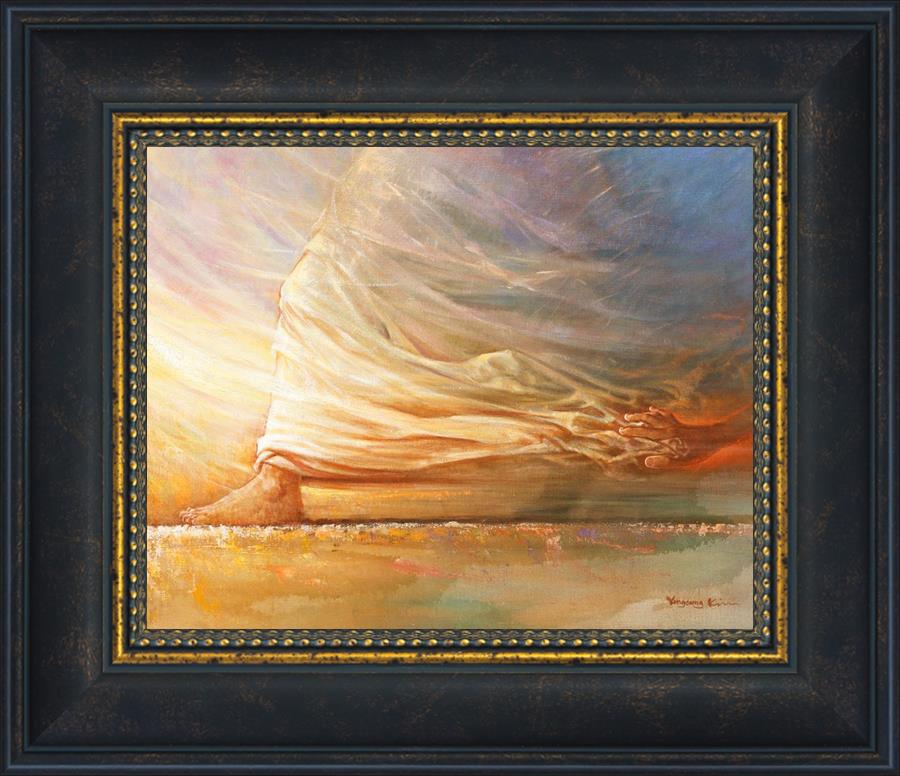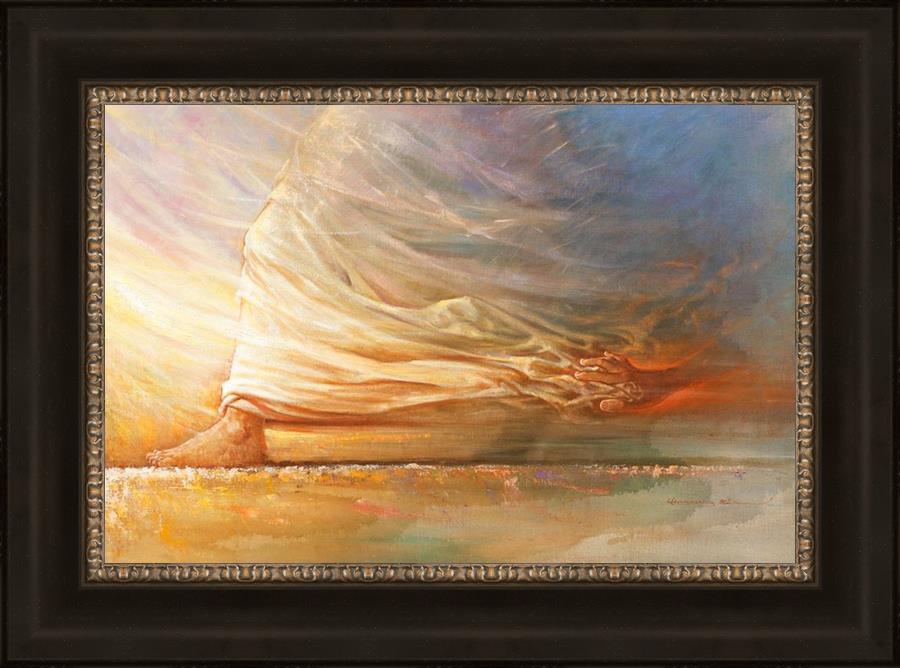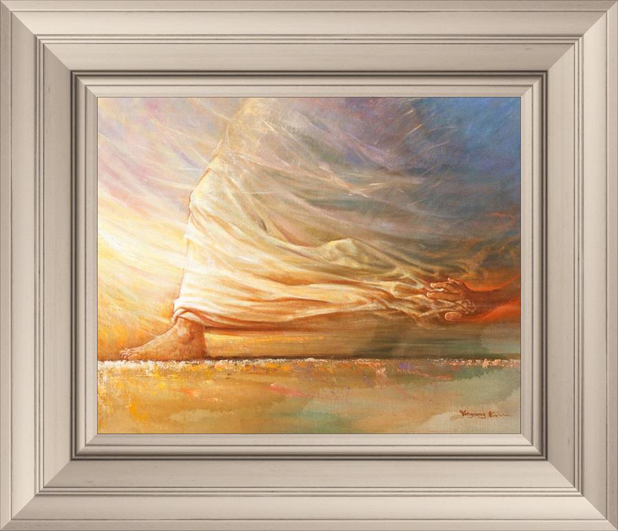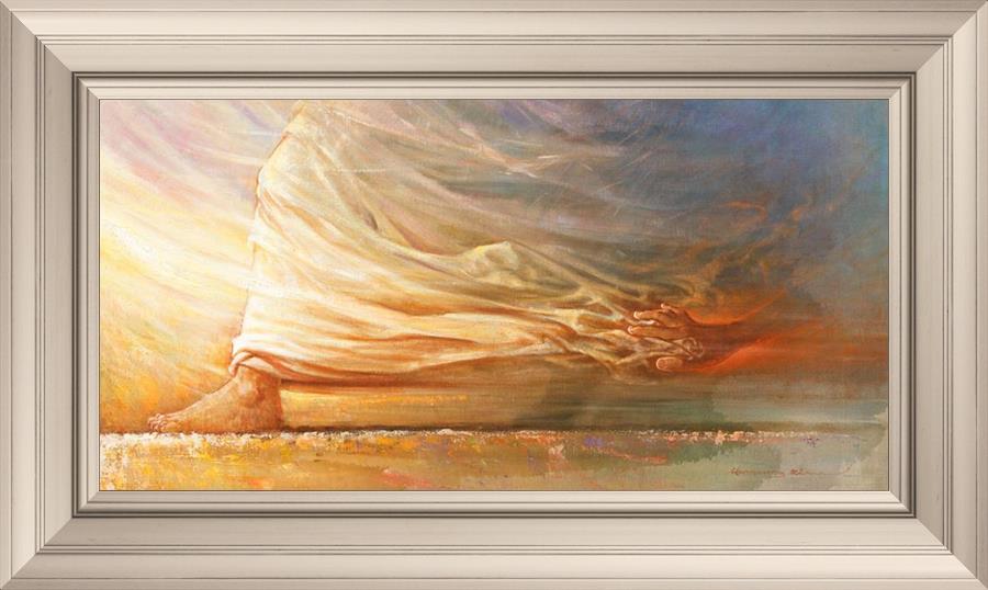 Touch of Faith by Yongsung Kim depicts the feet of Jesus and the hand of the woman with an issue of blood reaching in faith to touch the hem of His garment. This painting is available in print and canvas.