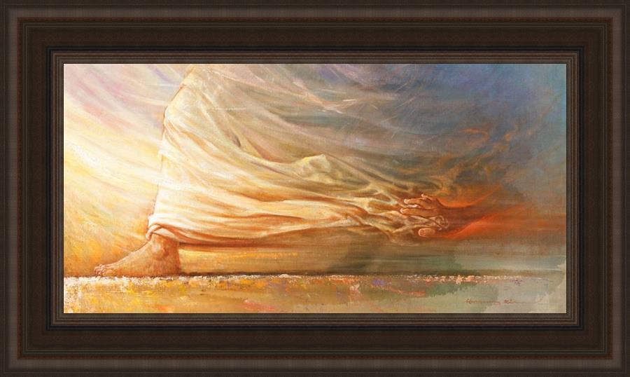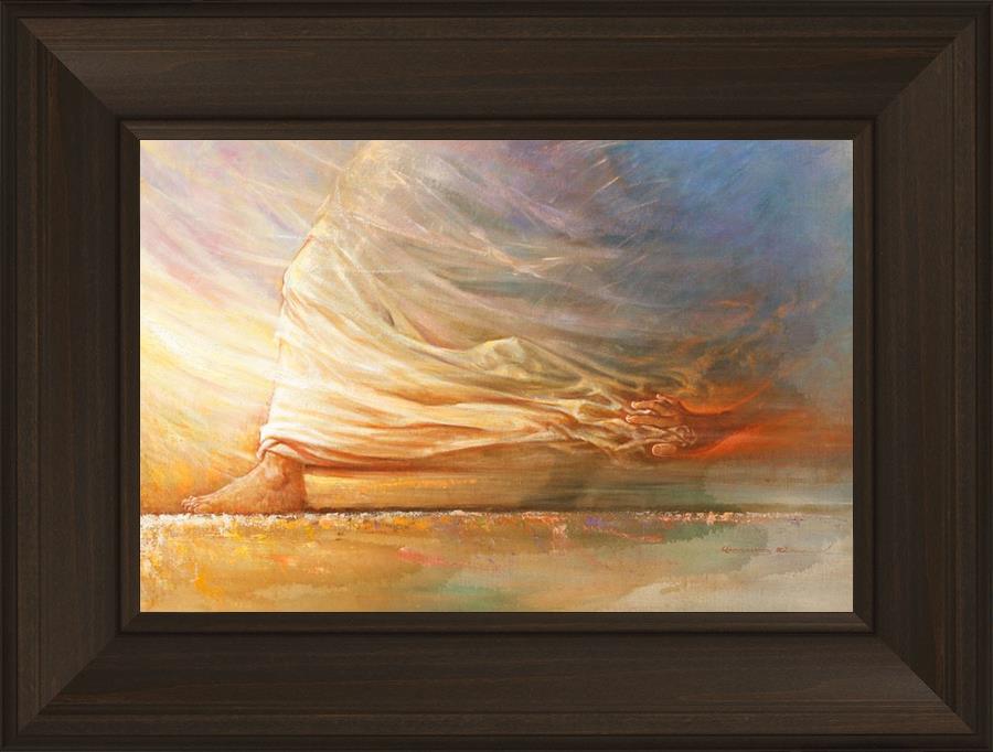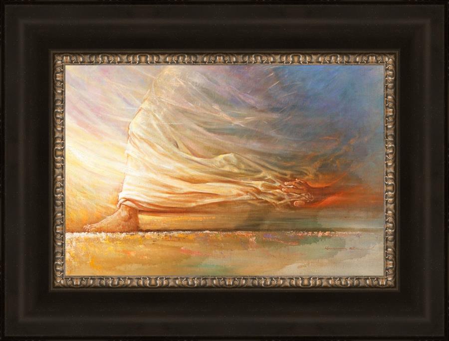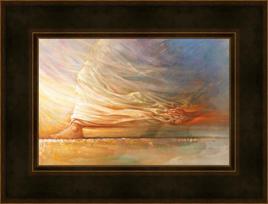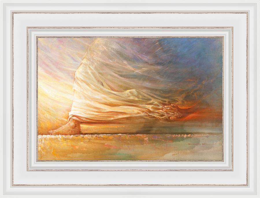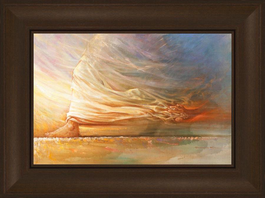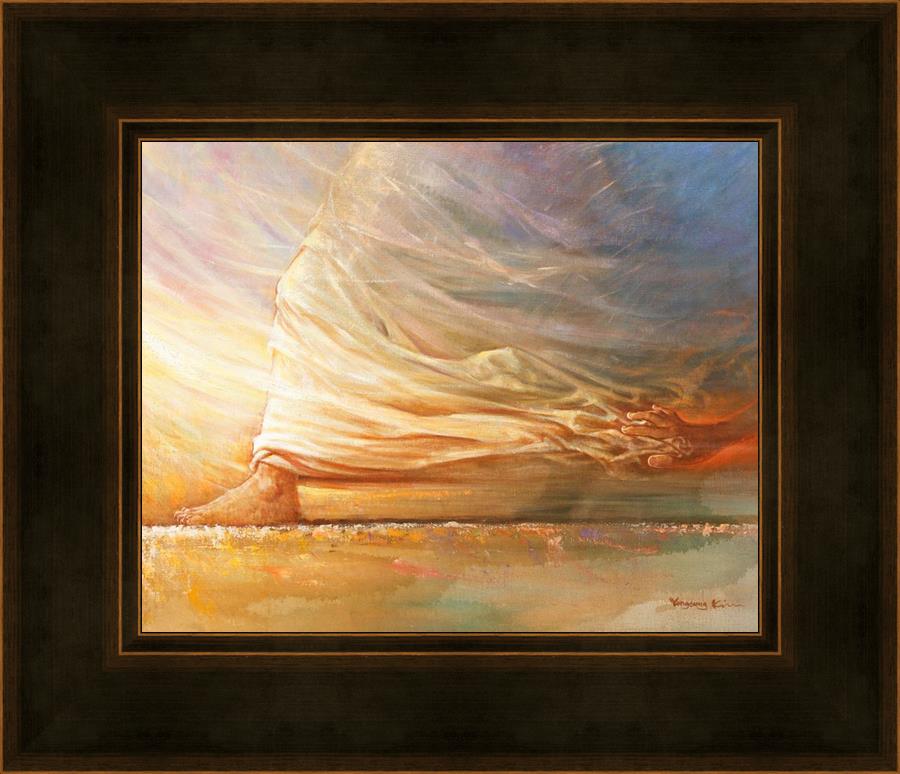 Touch of Faith by Yongsung Kim depicts the feet of Jesus and the hand of the woman with an issue of blood reaching in faith to touch the hem of His garment. This painting is available in print and canvas.