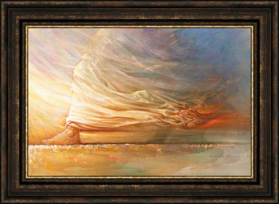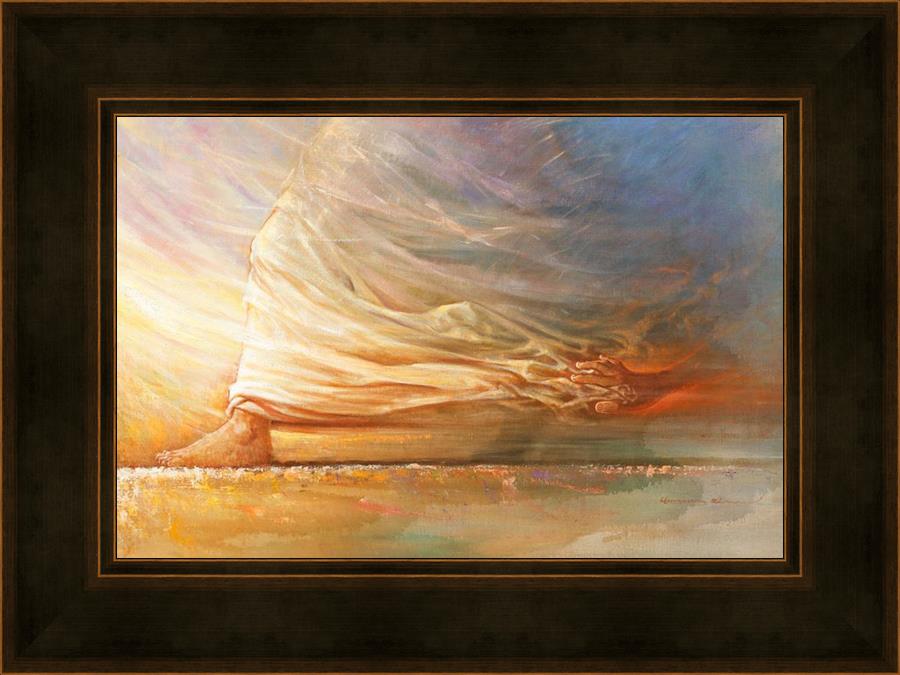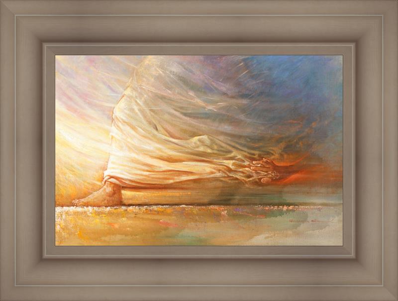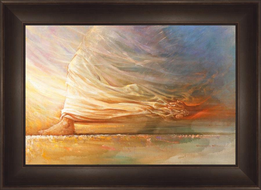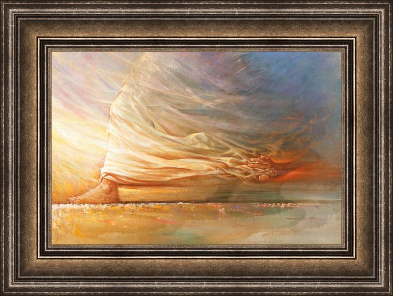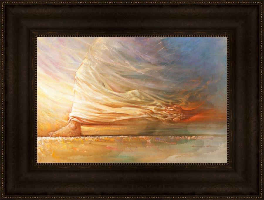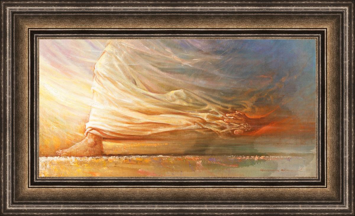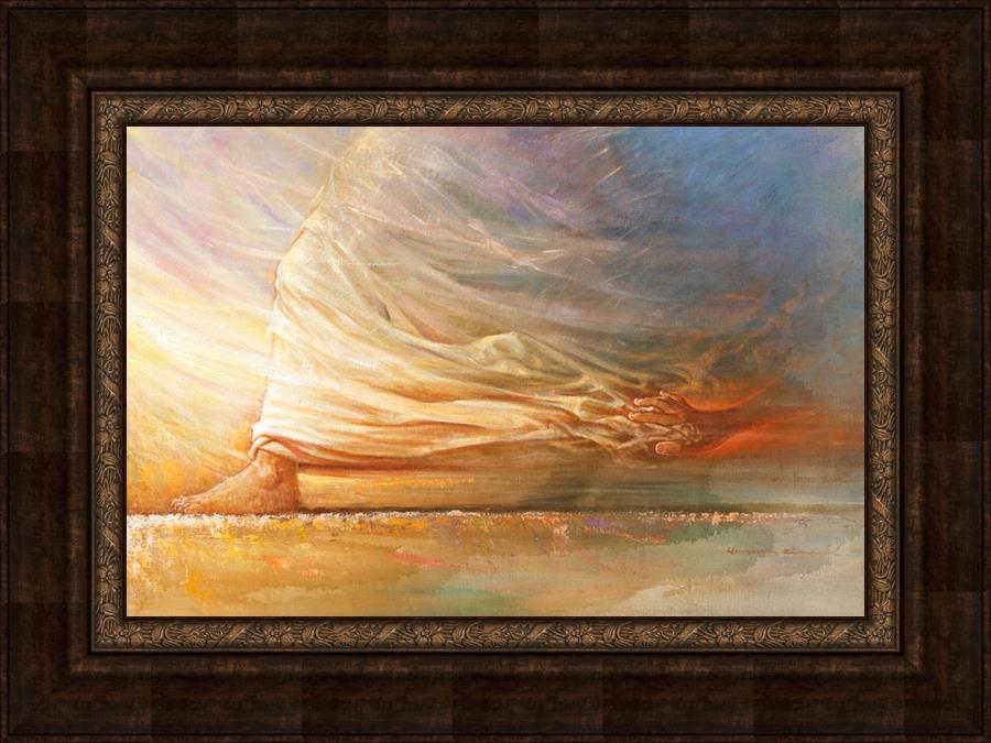 Touch of Faith by Yongsung Kim depicts the feet of Jesus and the hand of the woman with an issue of blood reaching in faith to touch the hem of His garment. This painting is available in print and canvas.