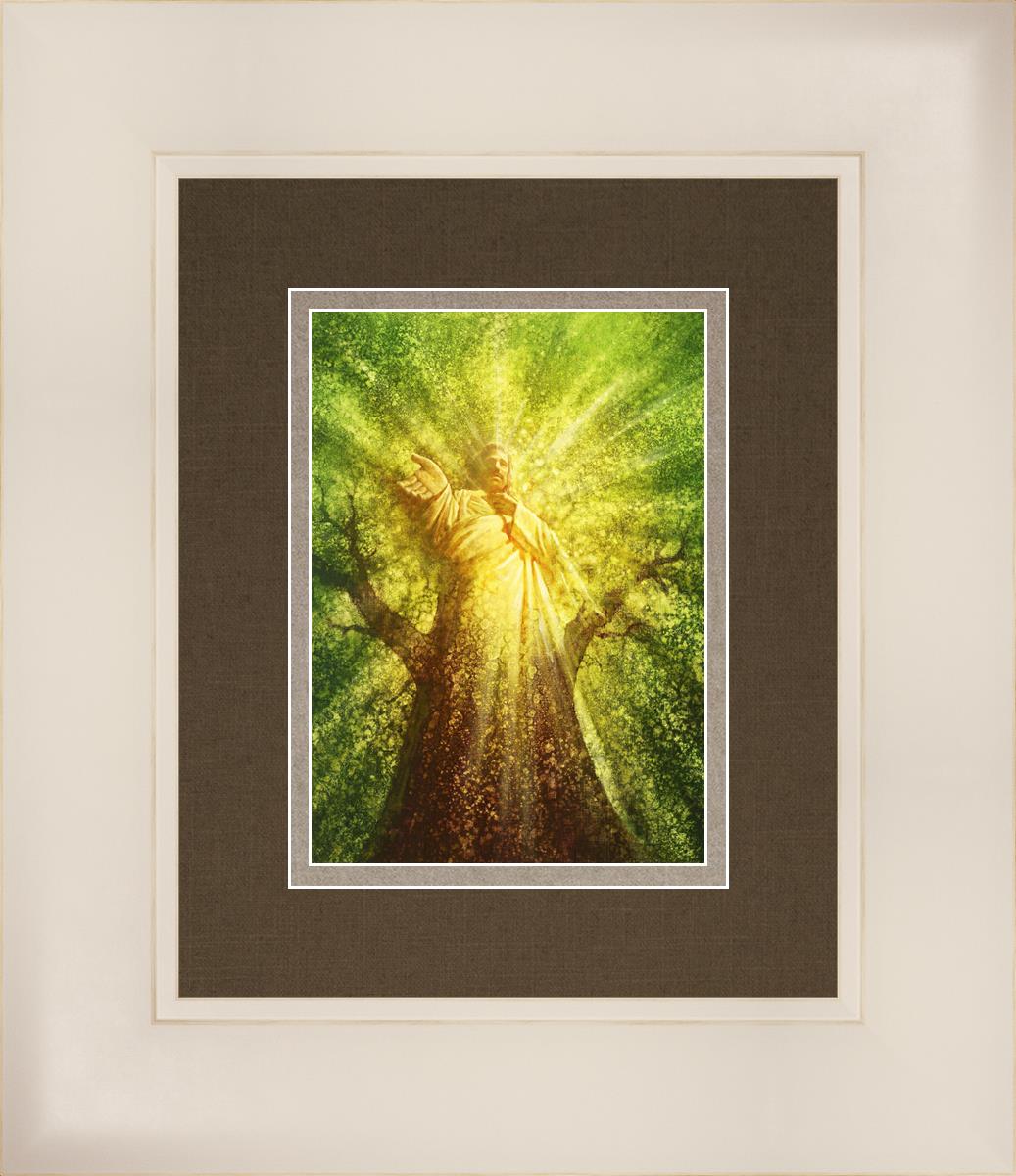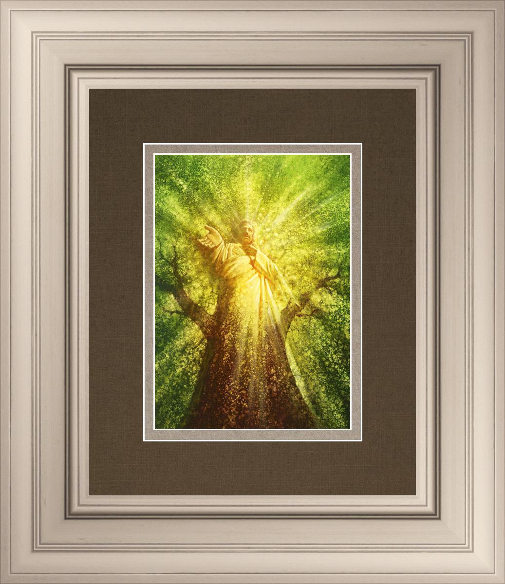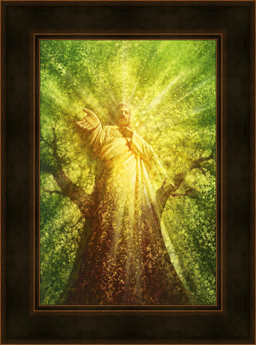 Tree of Life by Yongsung Kim depicts Jesus layered over a large tree representing him as the tree of life with one of His hands reaching down to us. This painting is available in print and canvas.